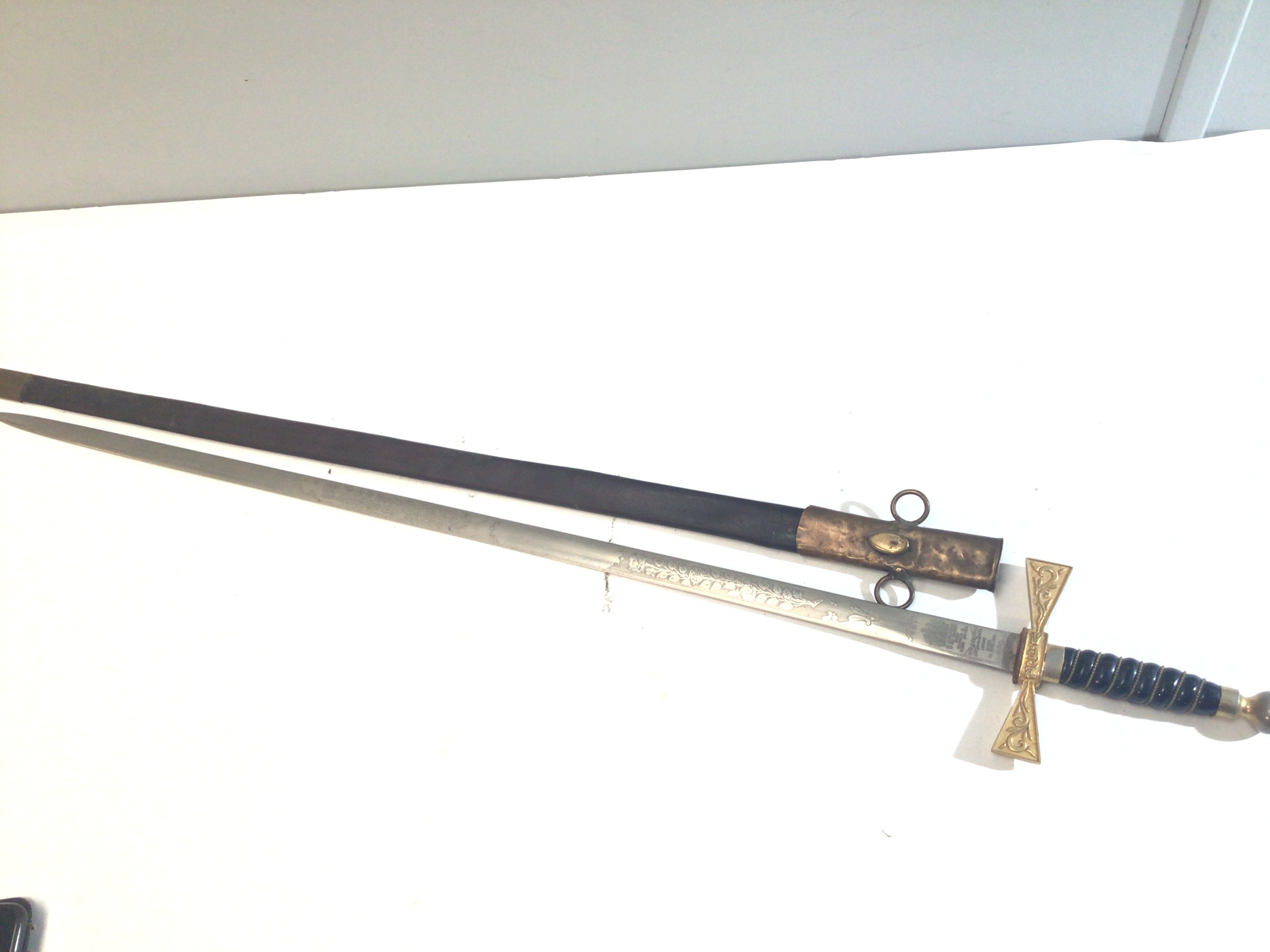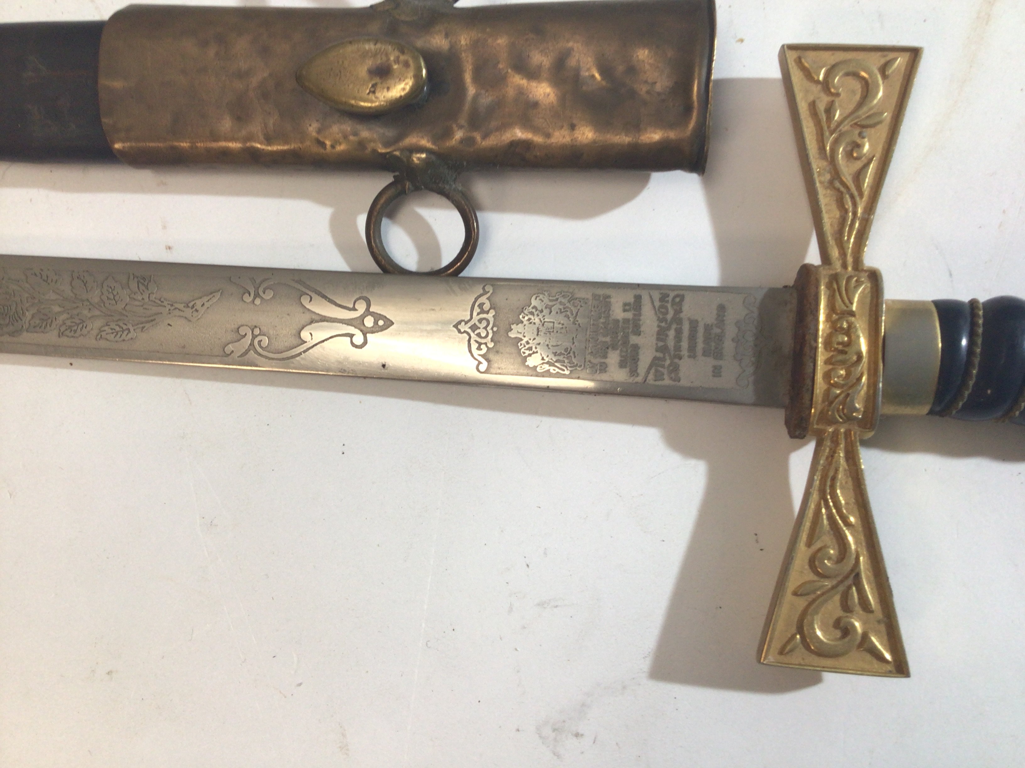 An Elizabeth II ceremonial sword with a patterned brass cross guard maker Wilkinson of London with a leather and brass scabbard.