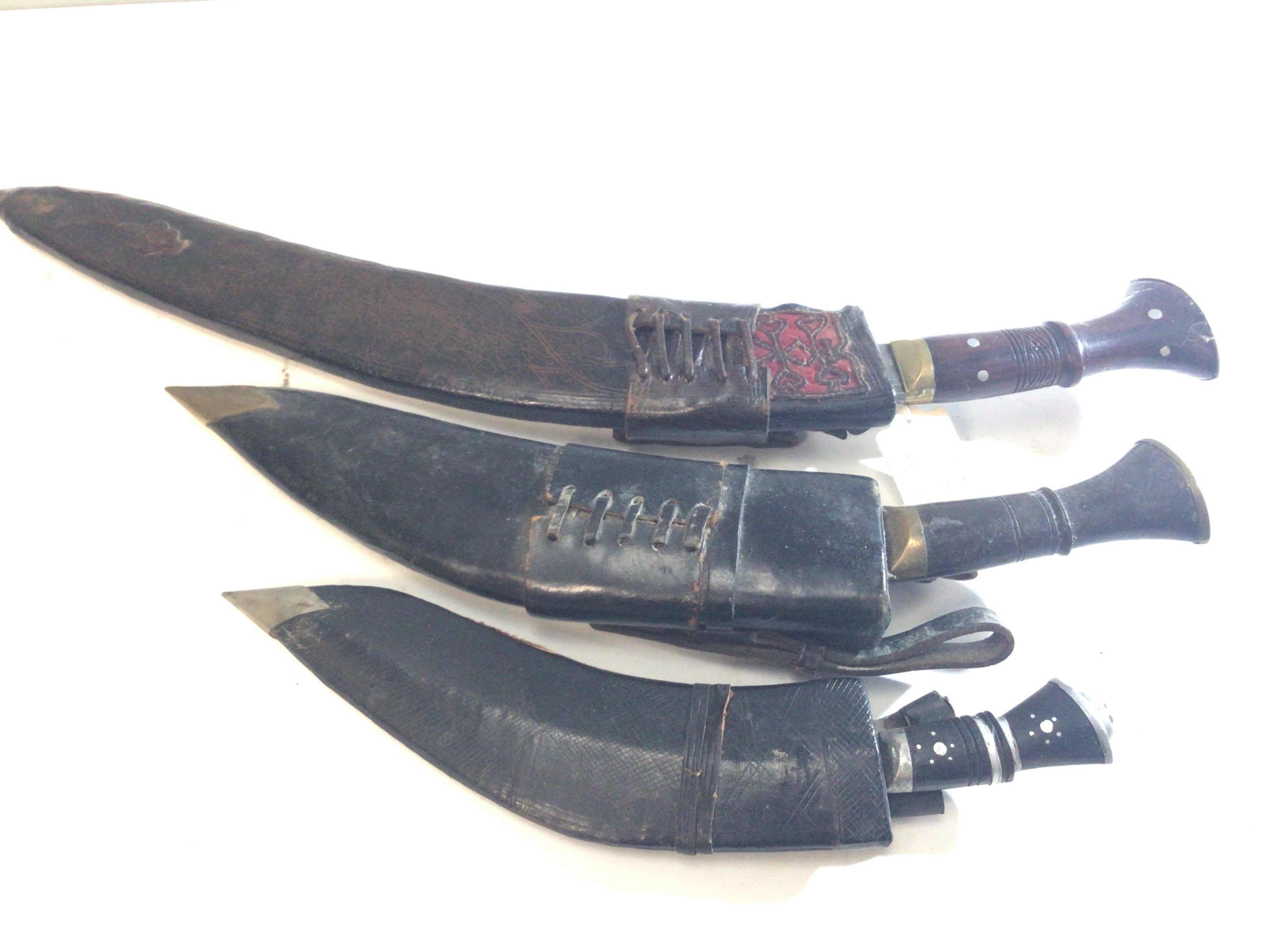 Three Early 20th Century Kukri Knifes The Traditional Nepalese knife. With brass set wood and horn handles including a smaller example (3)