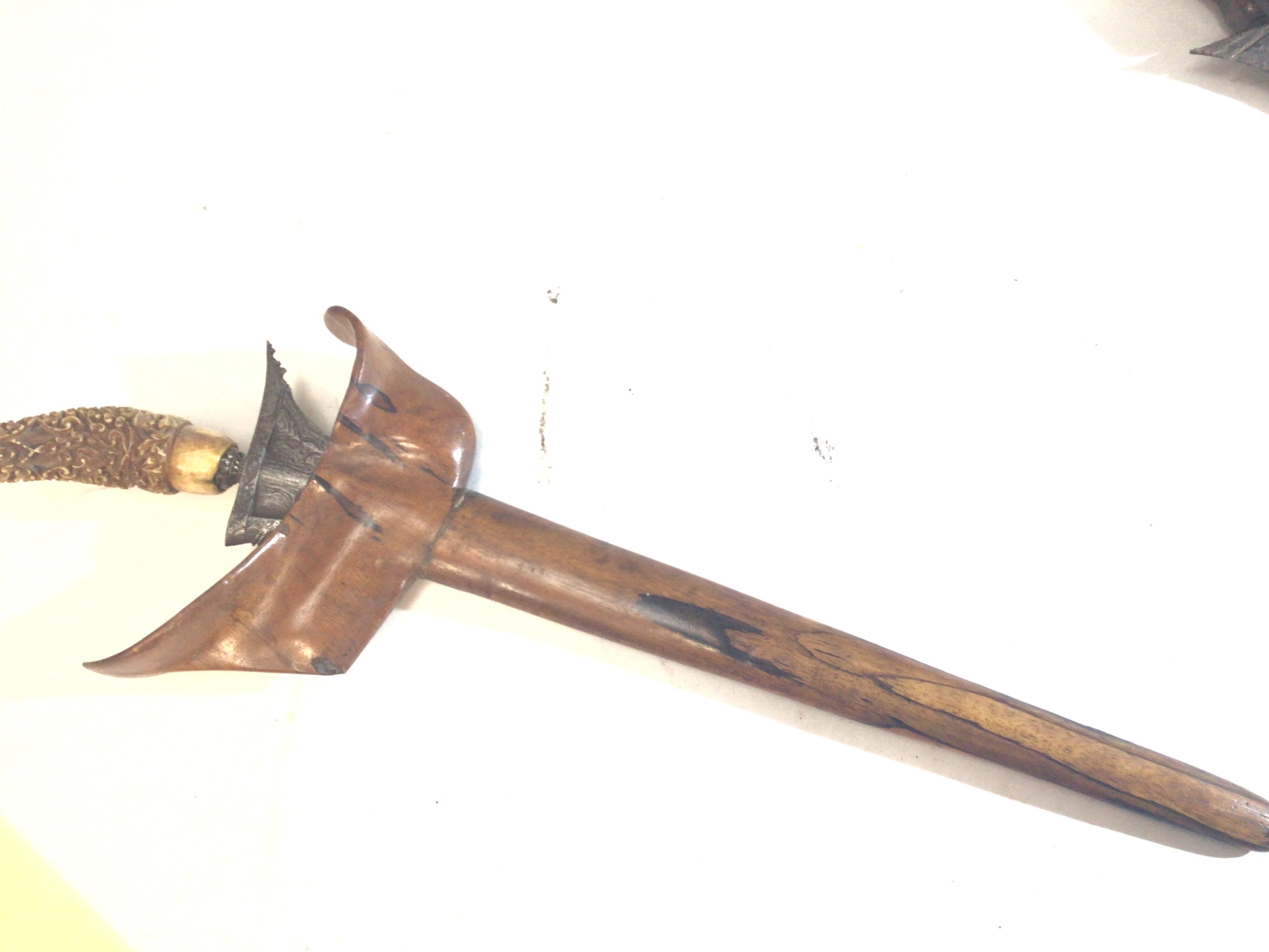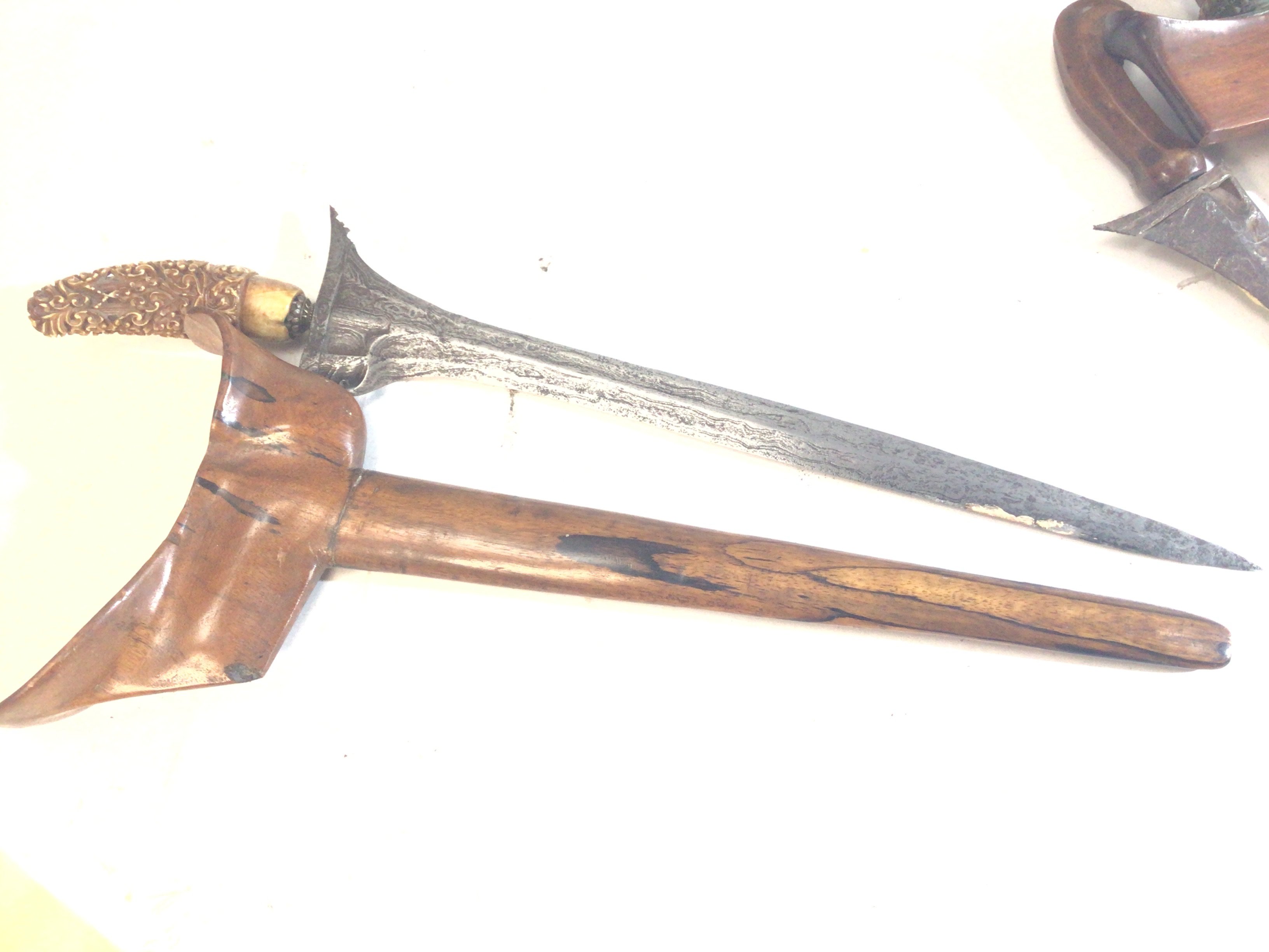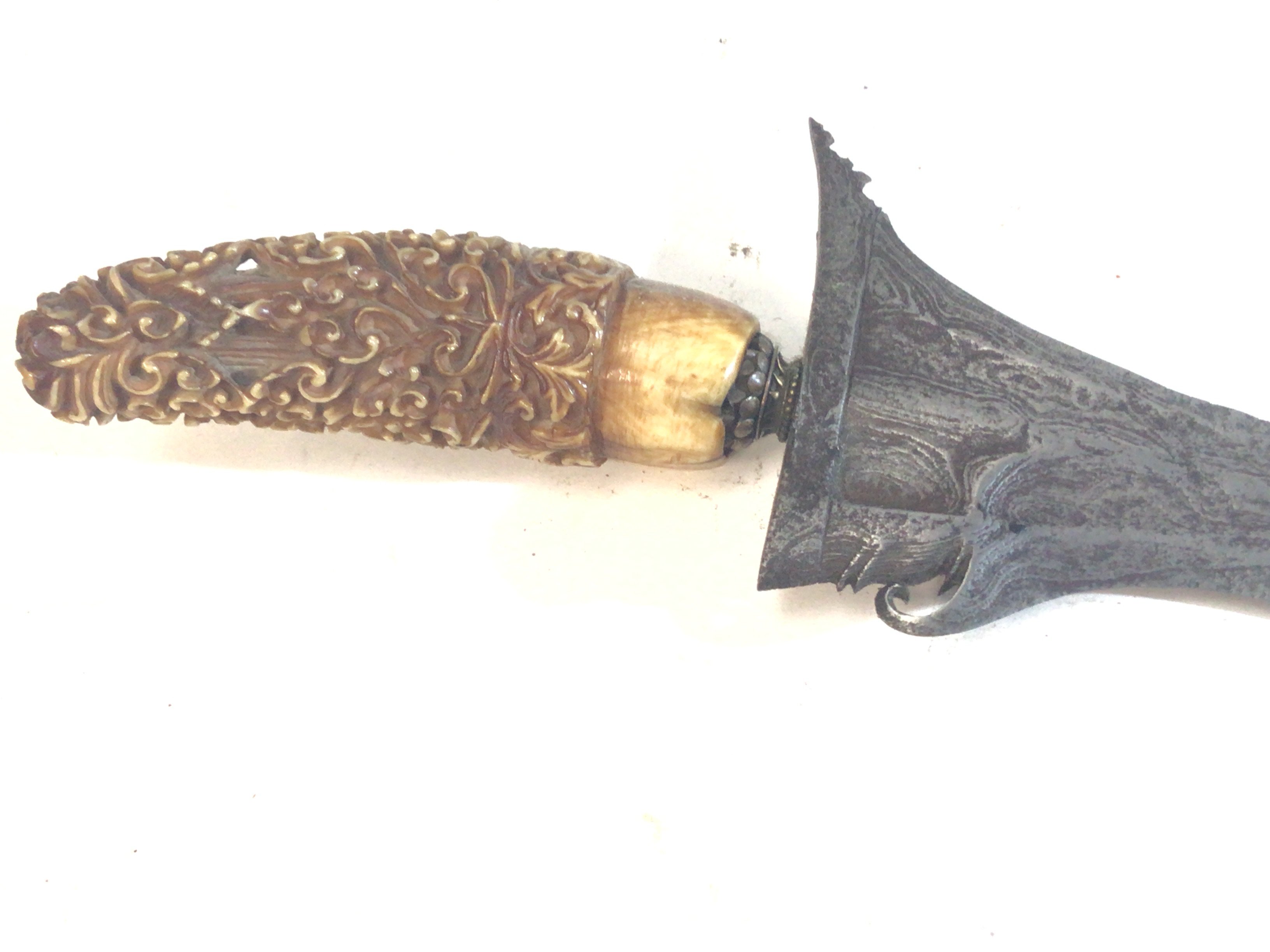 A good example of a 19th century Indonesian kris with waves edge Damascus type blade carved ivory handle and Rosewood scabbard (cites certificate pending) length 51cm