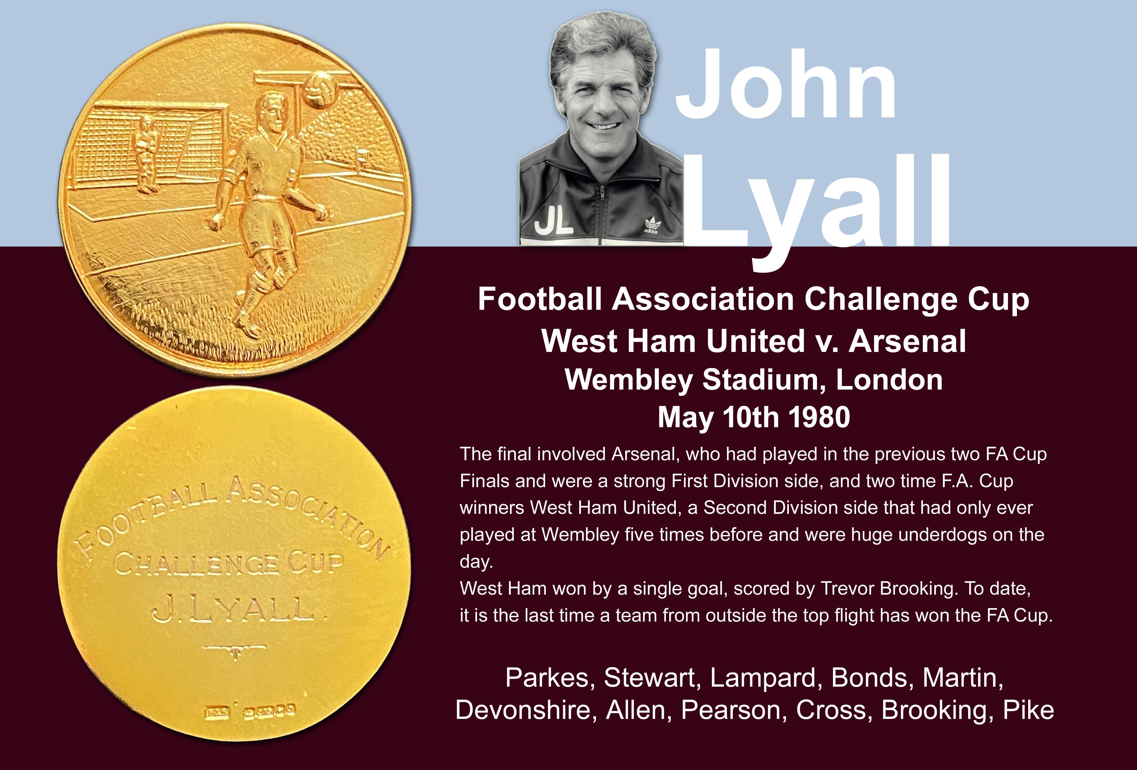 John Lyalls West Ham 1980 FA Cup Final Winners Gold Medal: 9ct gold medal in original Fattorini Box. Reverse inscribed Football Association Challenge Cup J Lyall. Incredibly rare as this managers medal differs from players medal although from same maker. Stunning piece of West Ham history with COA from the family.