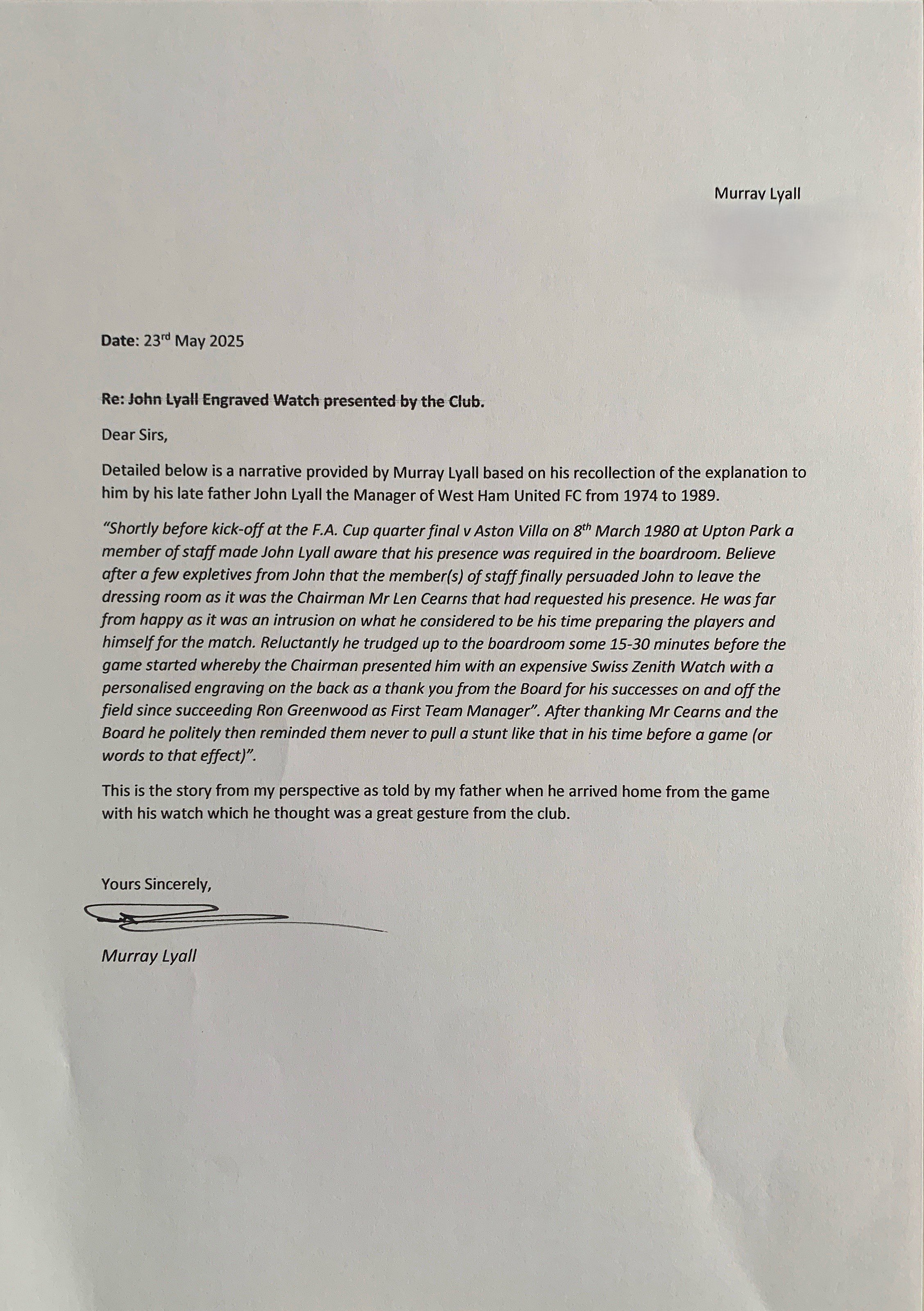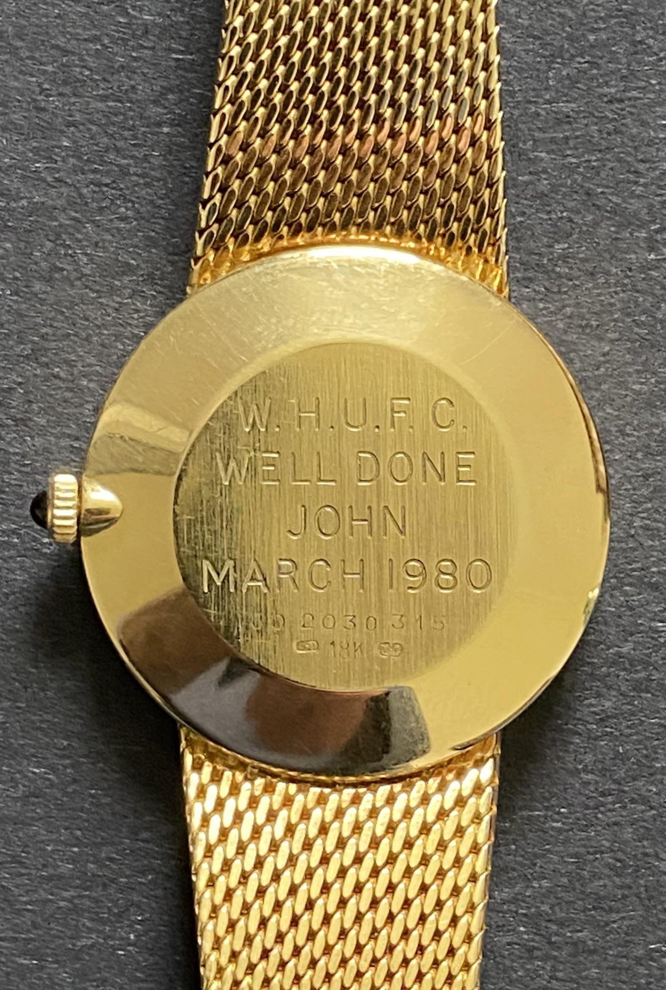 John Lyalls 1980 Gold Watch Gift From West Ham: Zenith 18ct gold watch presented by the board of directors. Engraved WHUFC Well Done John March 1980. A letter and COA from the family explains this was not just for beating Arsenal on the way to winning the FA Cup final.
