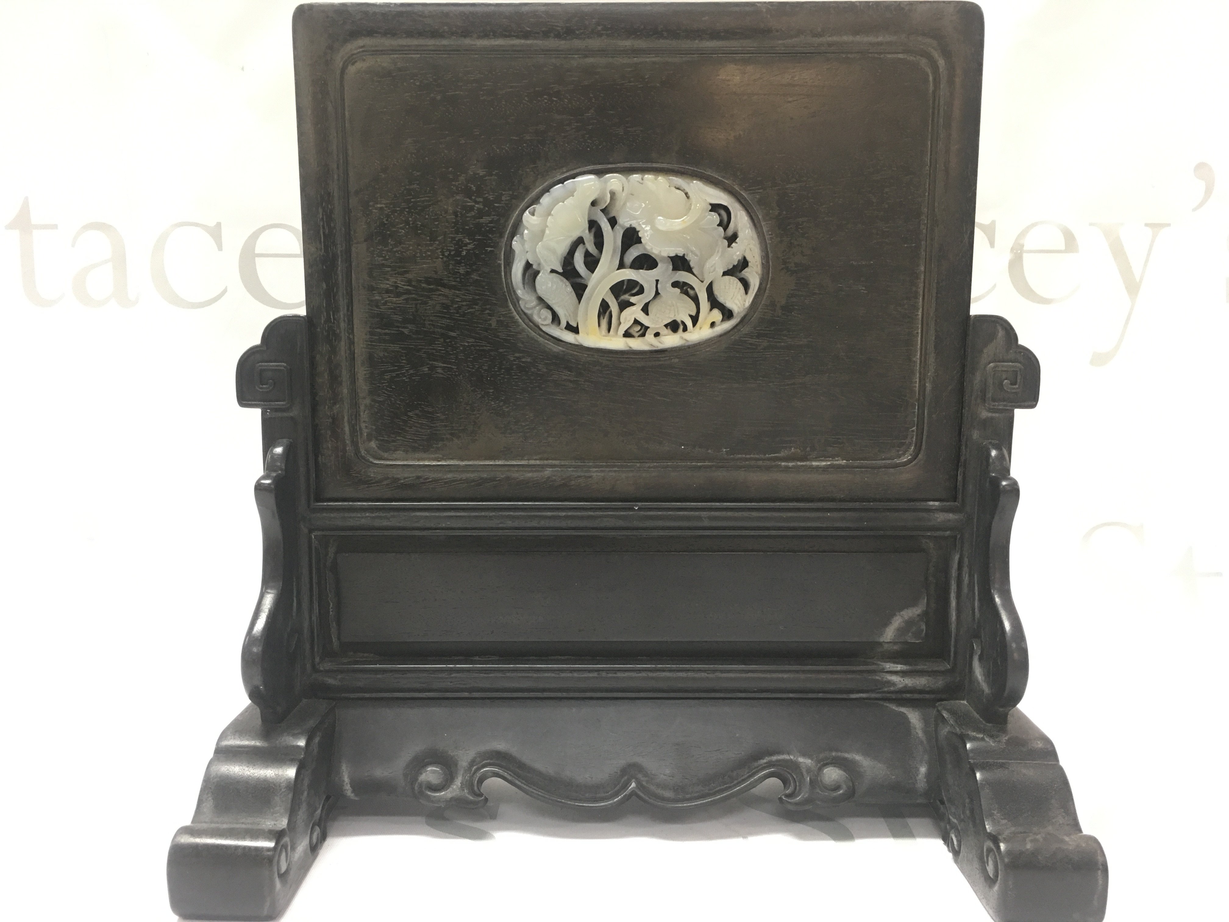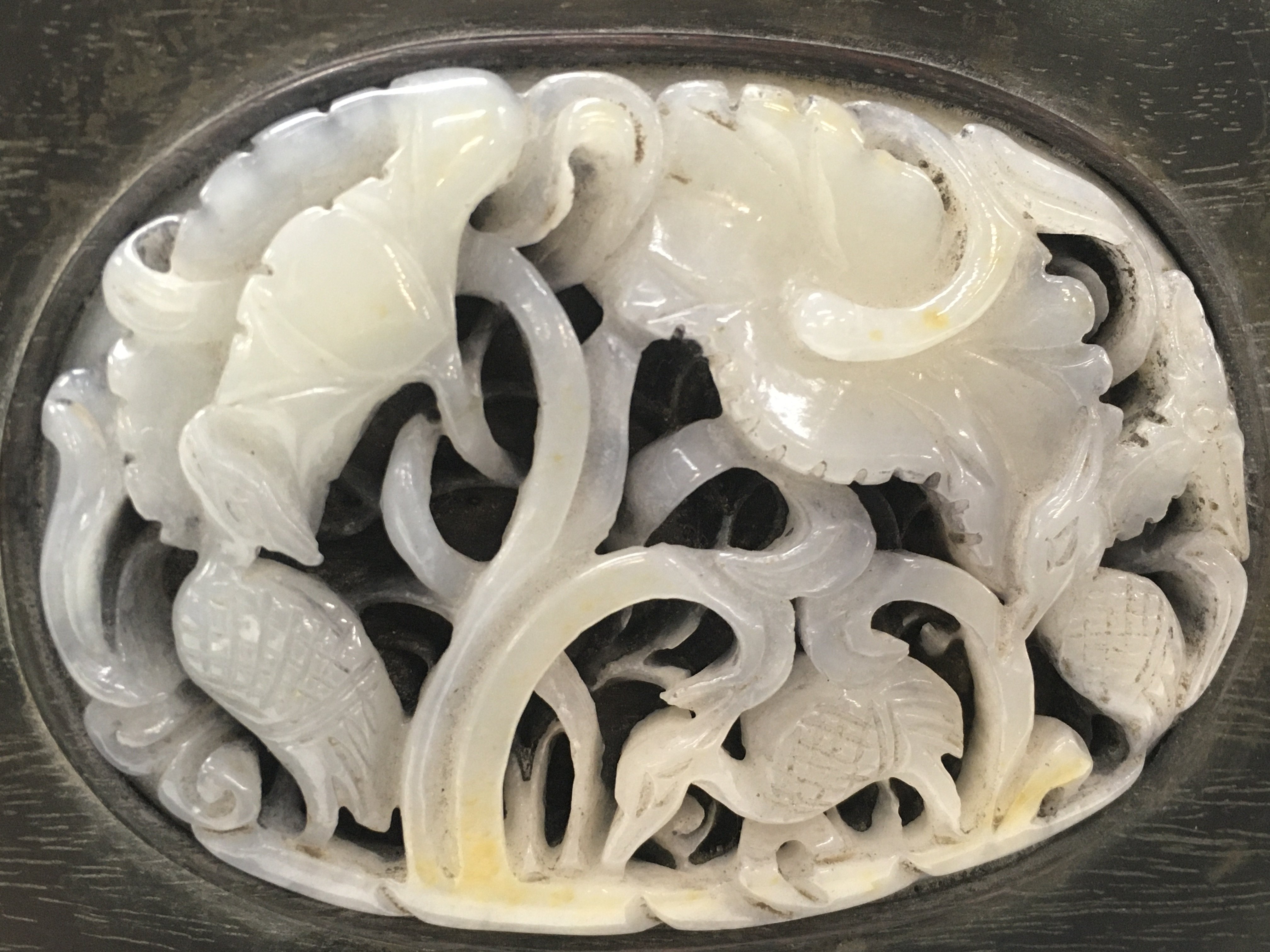 A Chinese wooden screen inlaid with jade ,birds with flowers piece. 25cm wide 25cm tall.