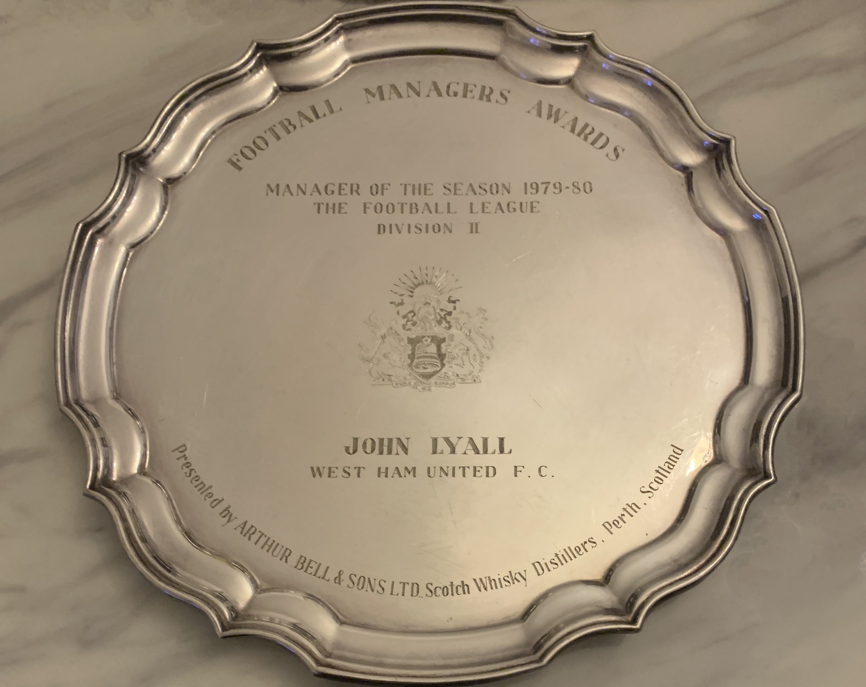 John Lyalls West Ham 79/80 Manager Of The Season Award: Silver plate issued by Bells Whisky to Lyall who won the FA Cup. West Ham are still the last team from a lower division to win the FA Cup.