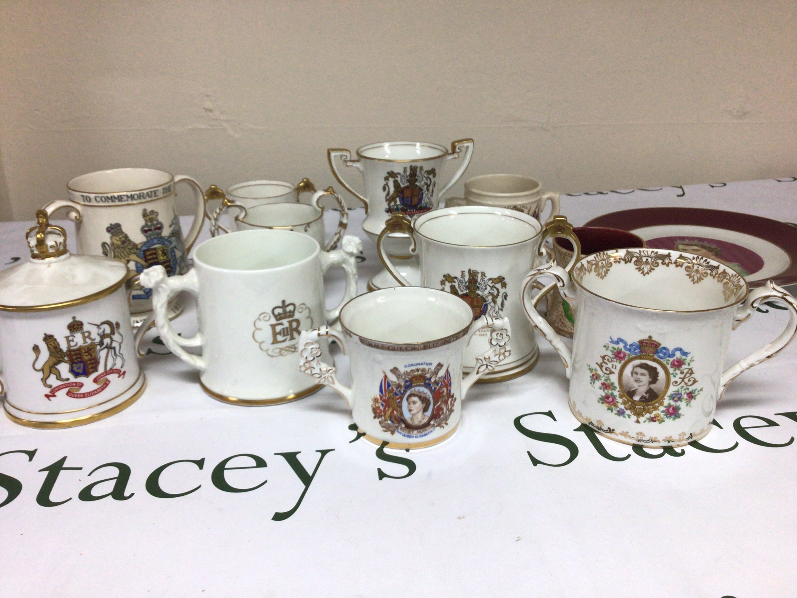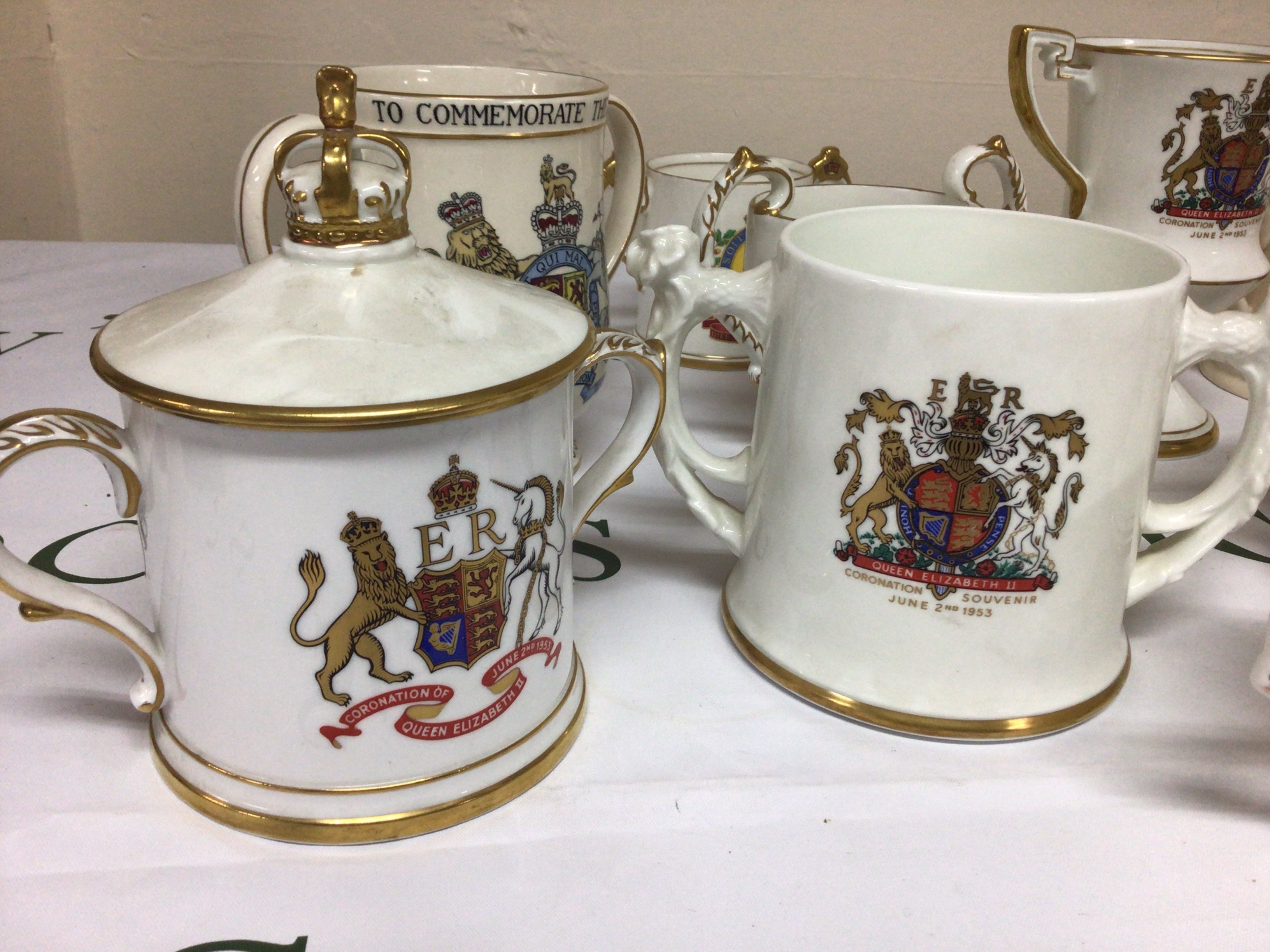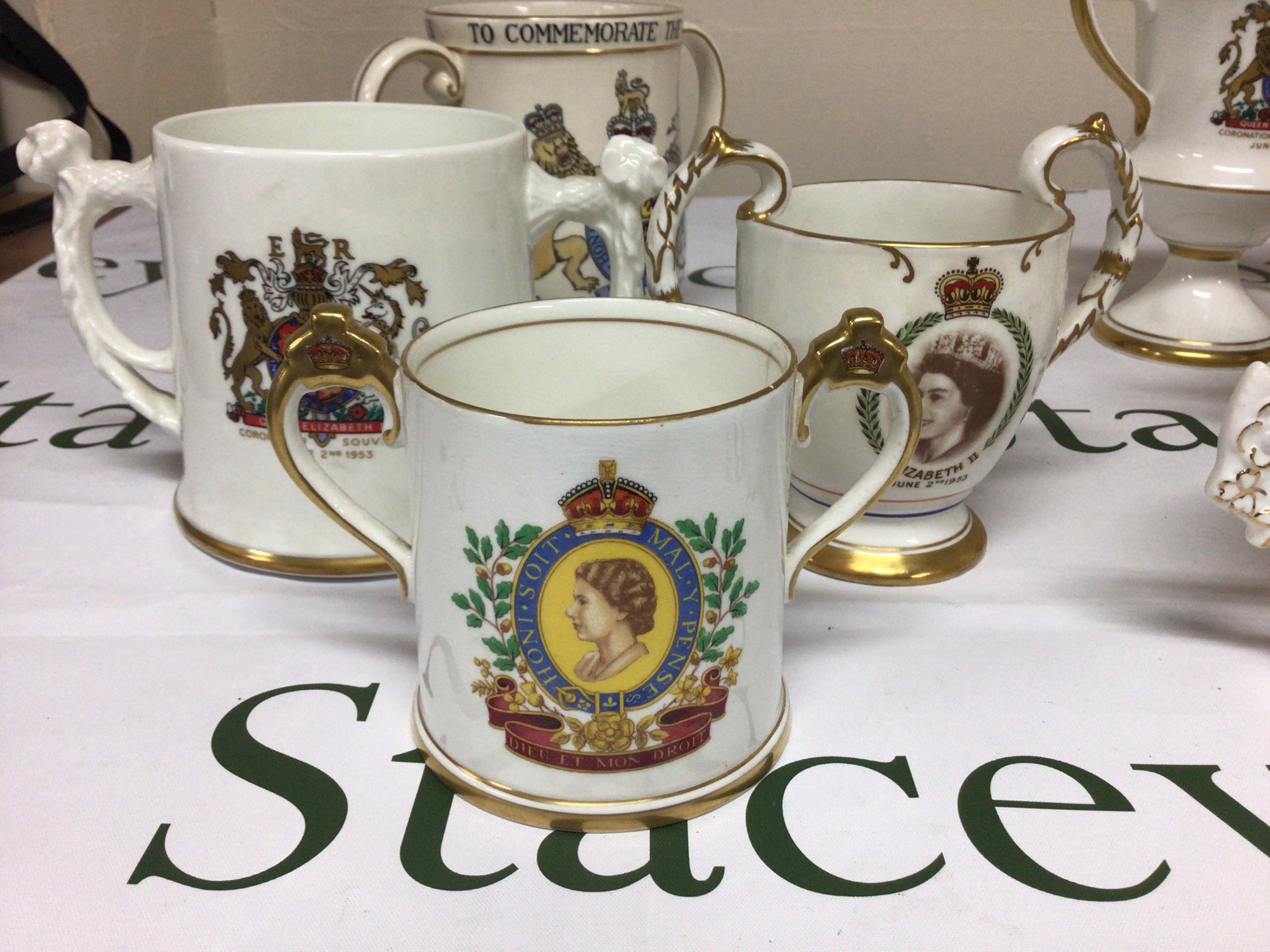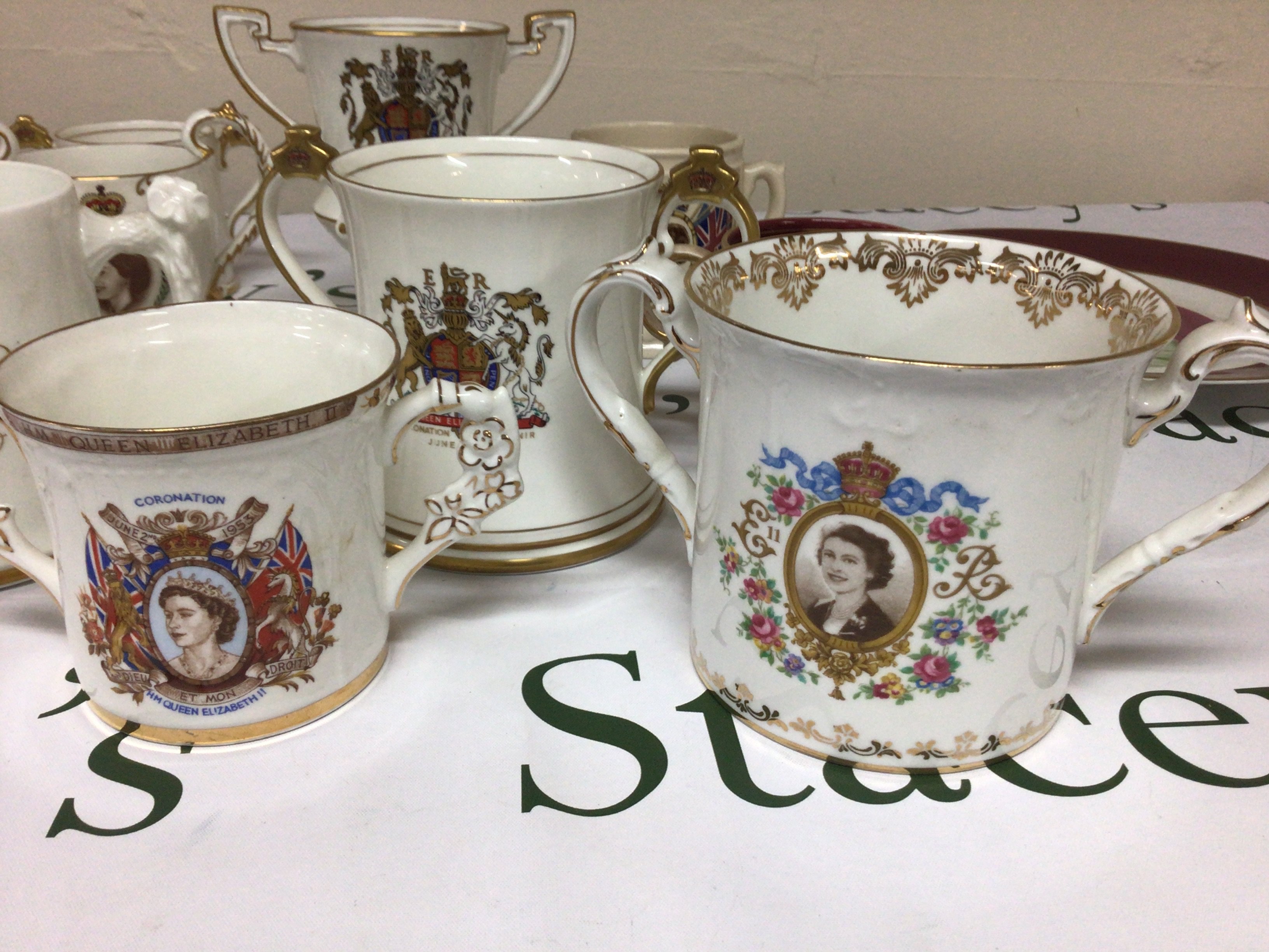 A collection of Elizabeth II coronation commemorative porcelain and ceramics including Royal Albert Radfords Adderley and others each designed with Royal Coat of arms portraits of Queen Elizabeth II no obvious damage or restoration. NO RESERVE.