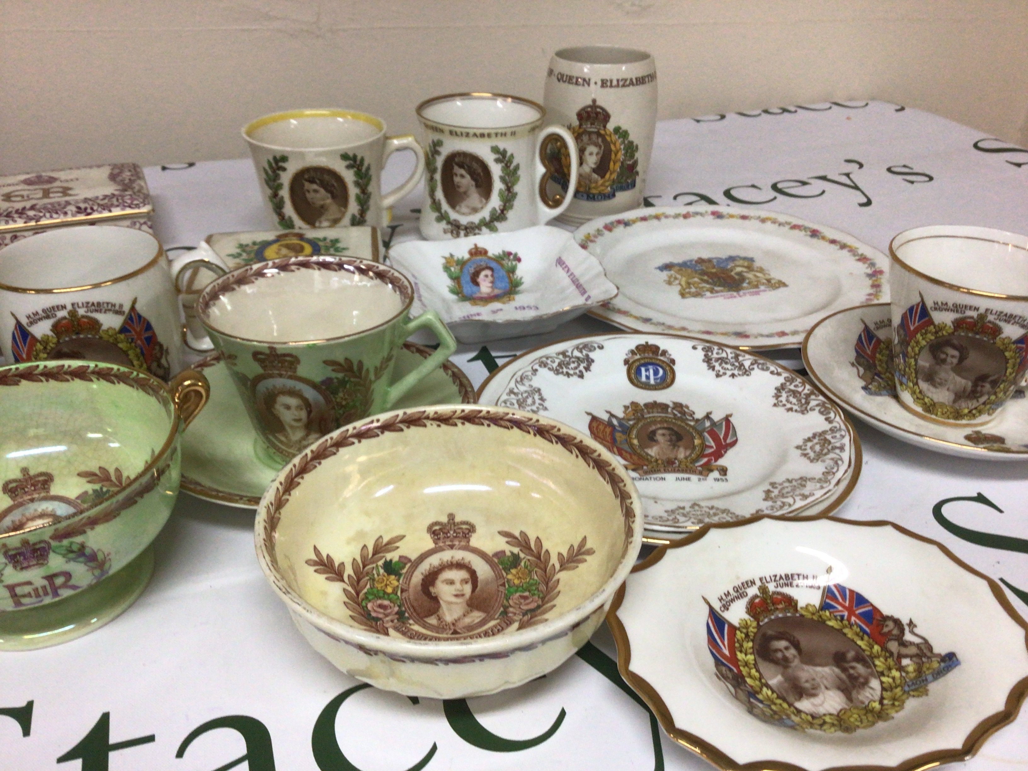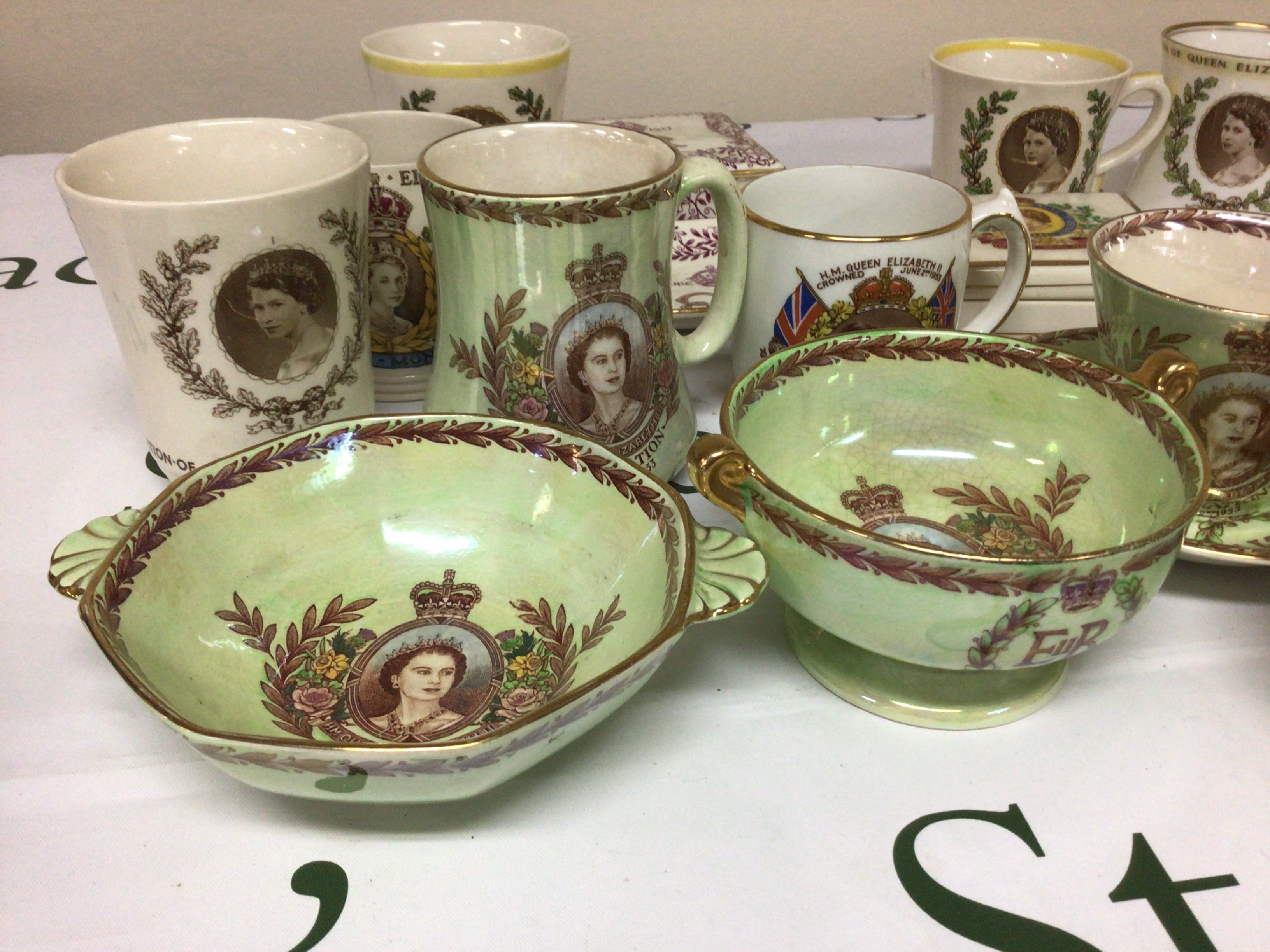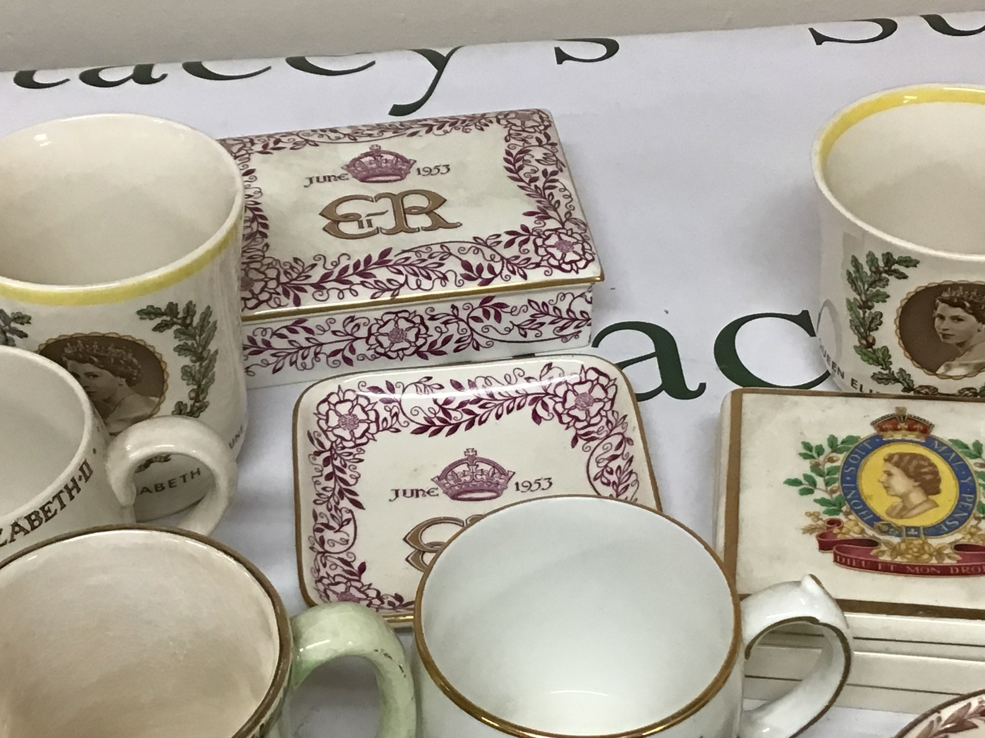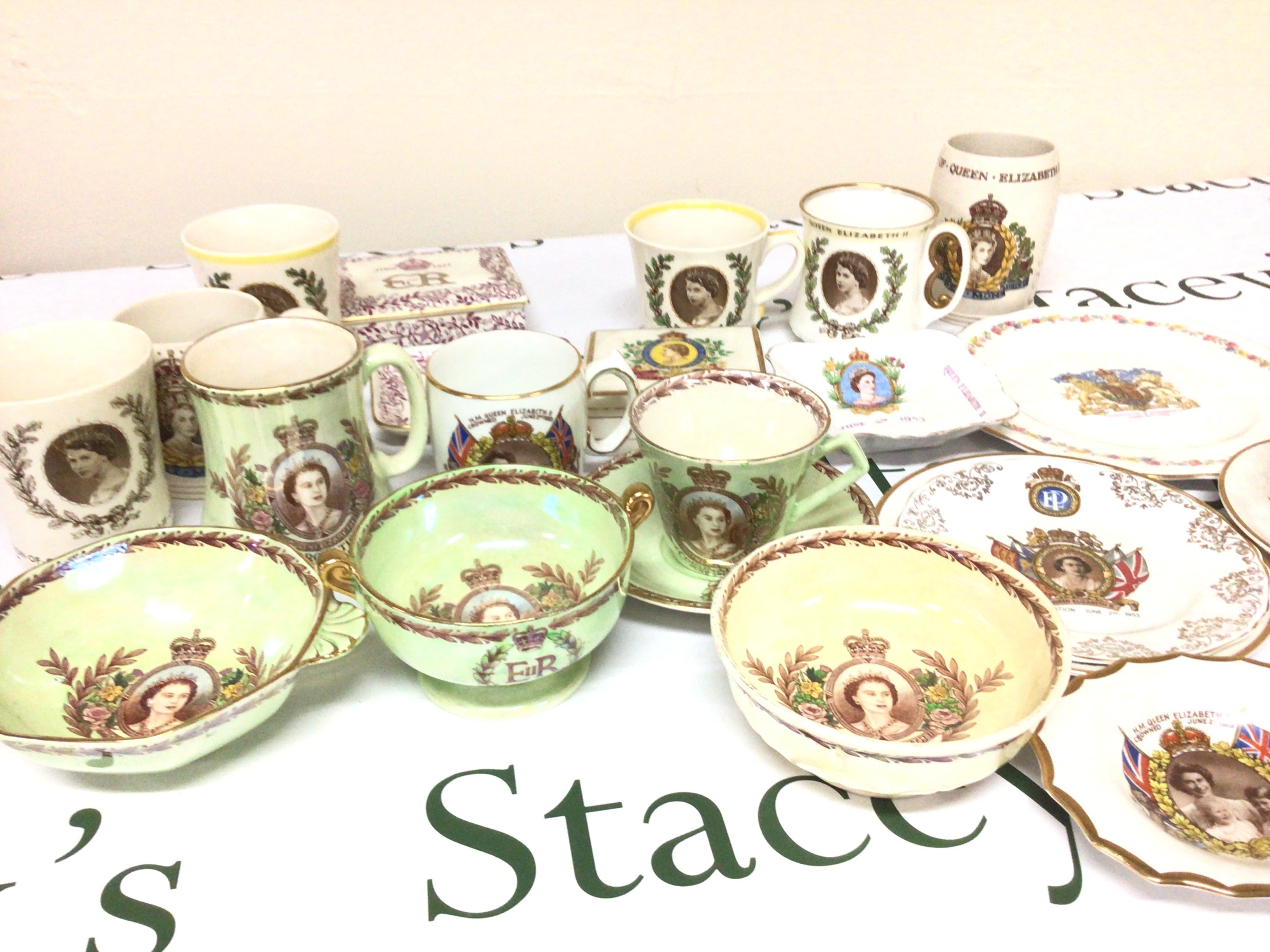 A collection of Elizabeth II commemorative ware including lustre colour mug cups and saucers a grays rectangular box and cover and other dishes. No obvious damage or restoration NO RESERVE.