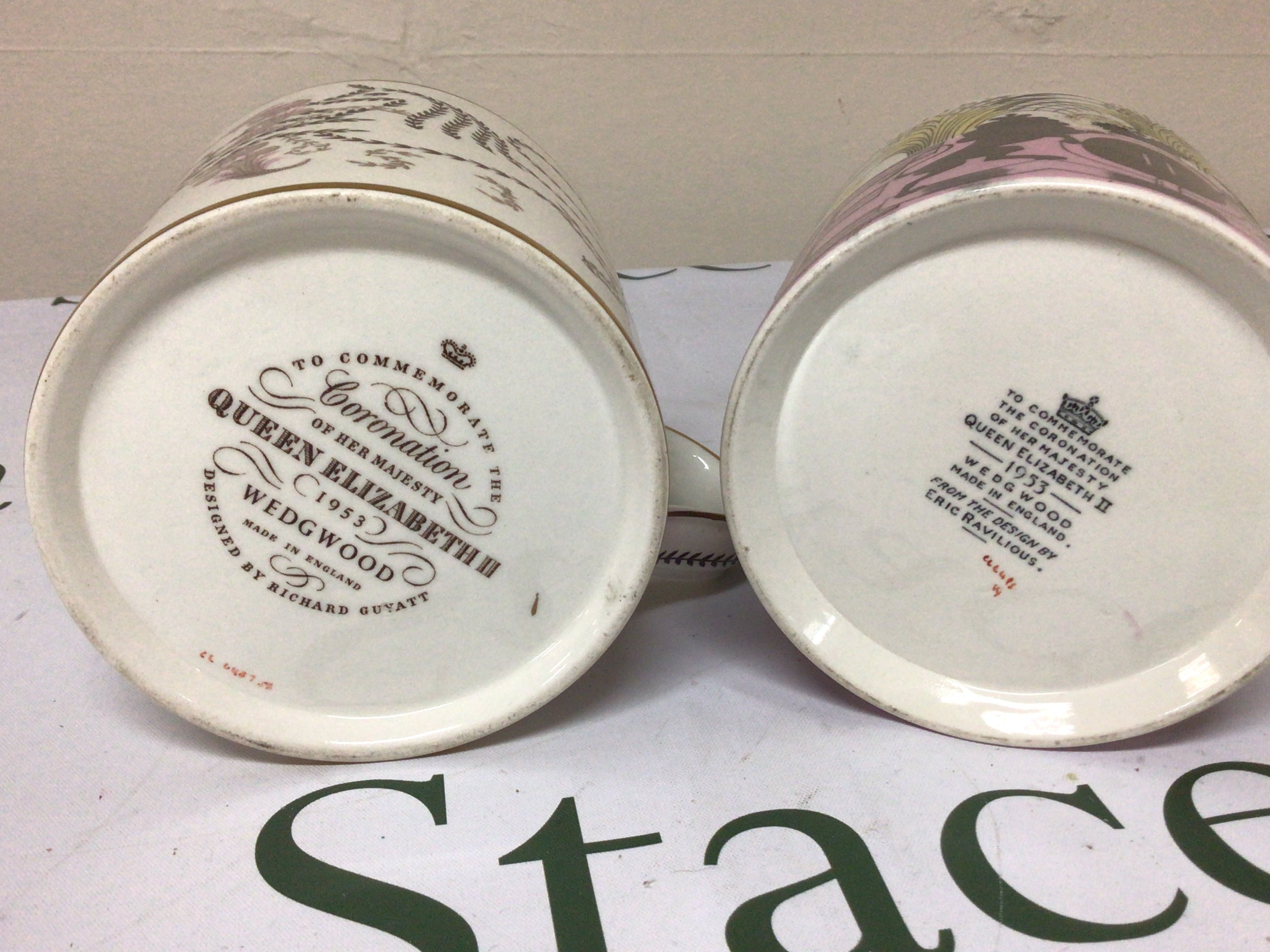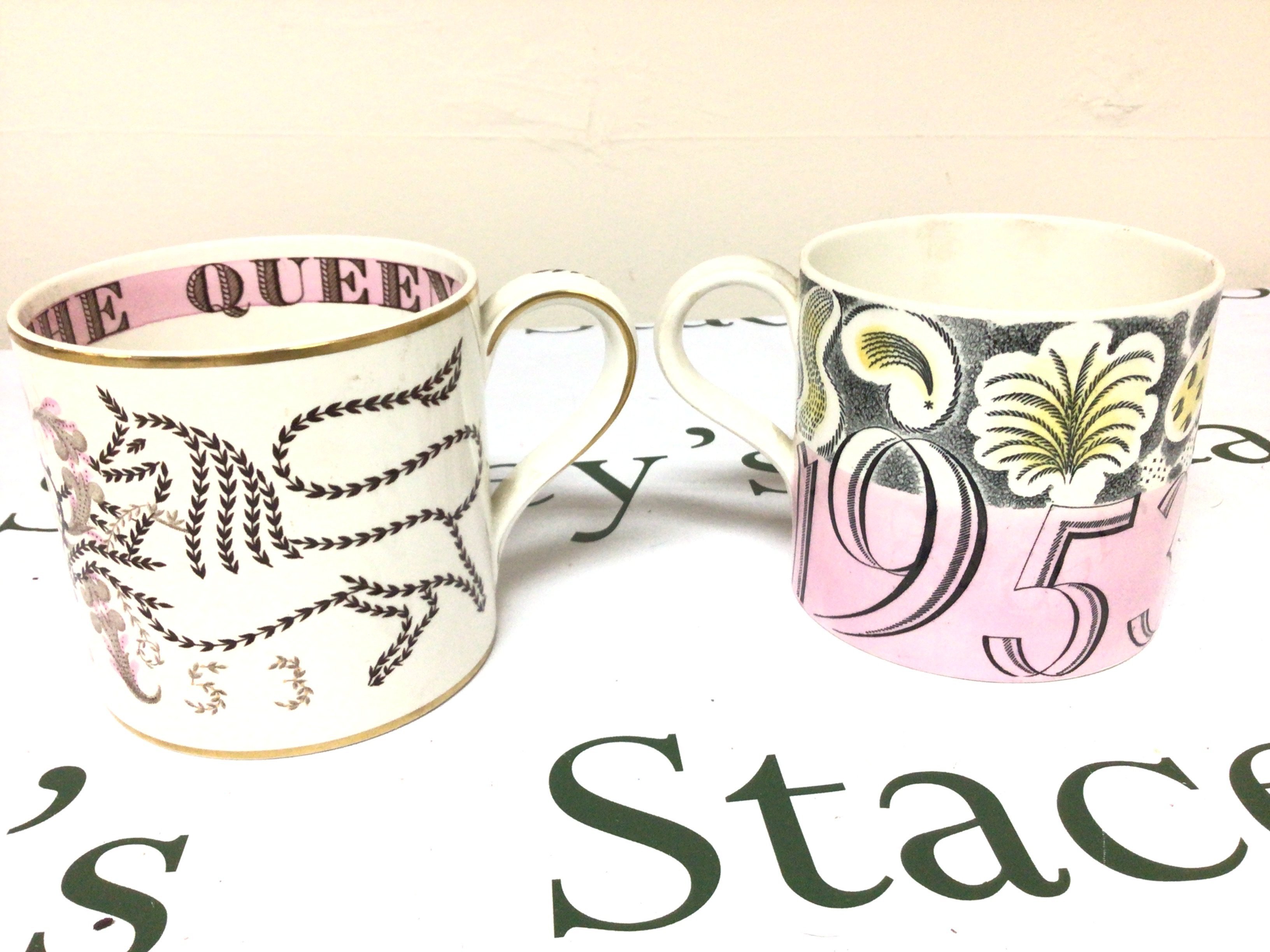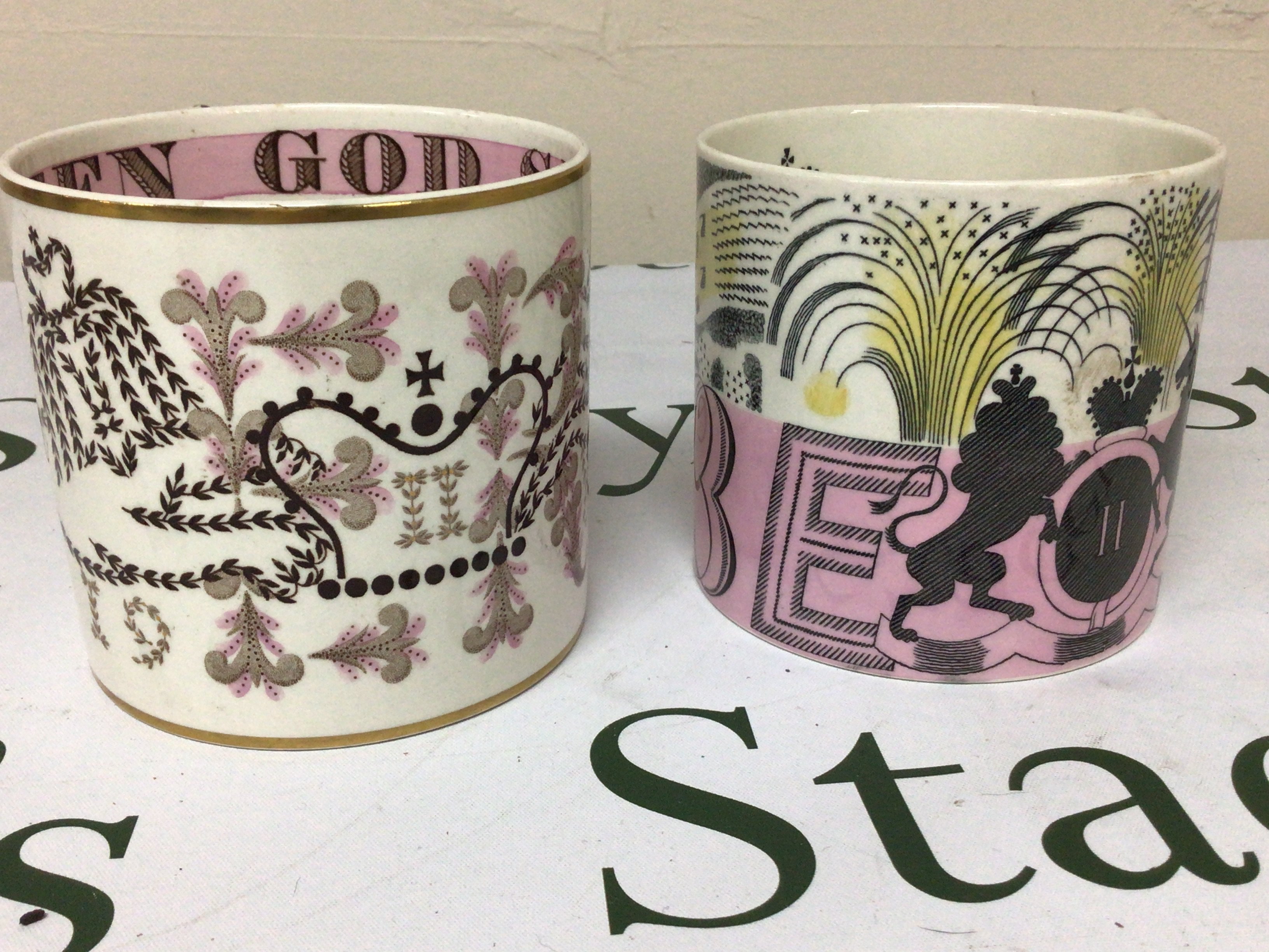 Two Wedgwood 1953 Elizabeth II commemorative large mugs designed by Eric Ravilious and Richard Guyatt. No obvious damage or restoration NO RESERVE.