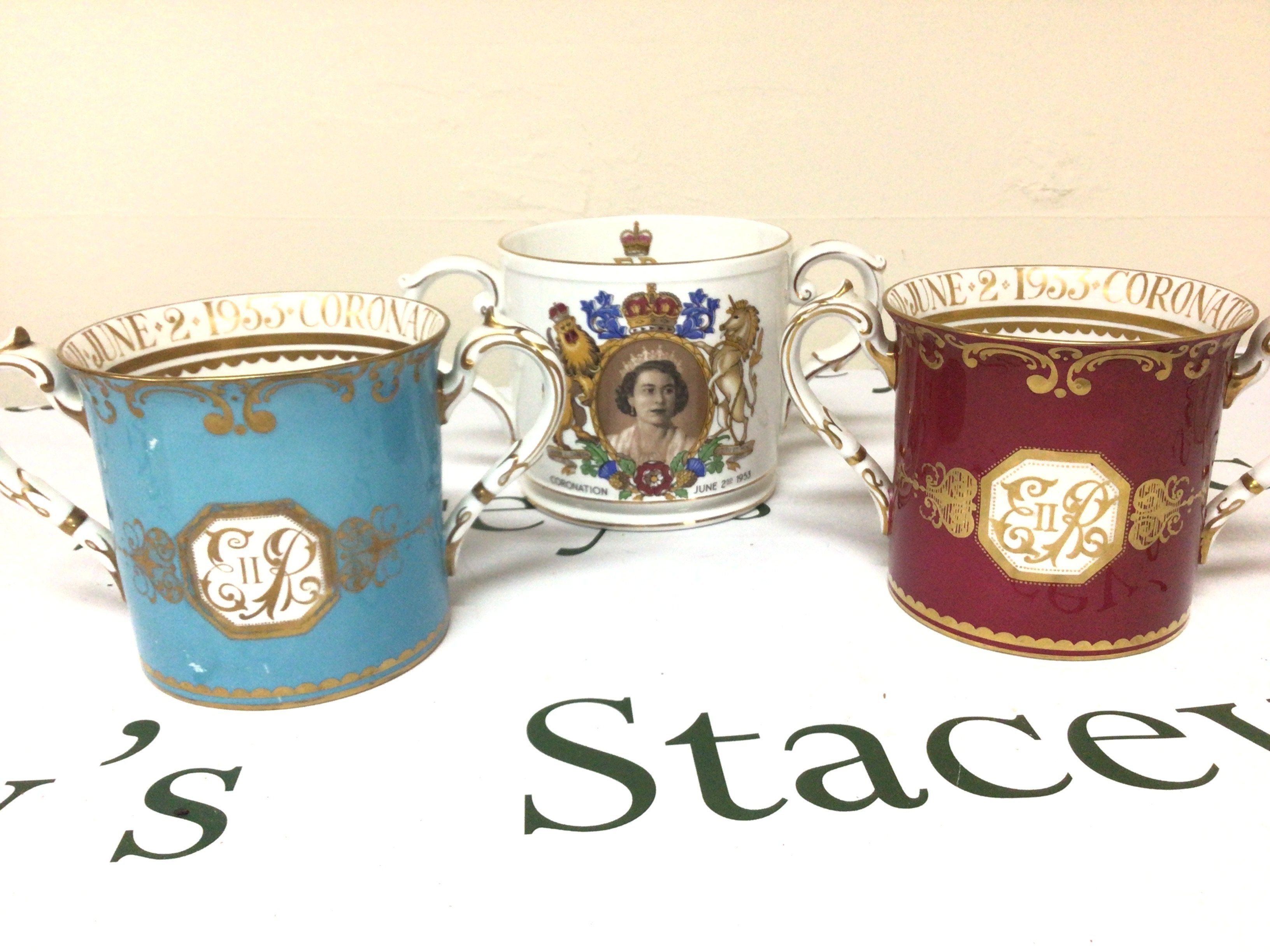 Two Royal Albert Porcelain two handled bone china 1953 Royal Elizabeth II commemorative mugs and Tuscan mug no obvious damage except very minor gilt edge rubbing on the Tuscan mug. NO RESERVE. (3)