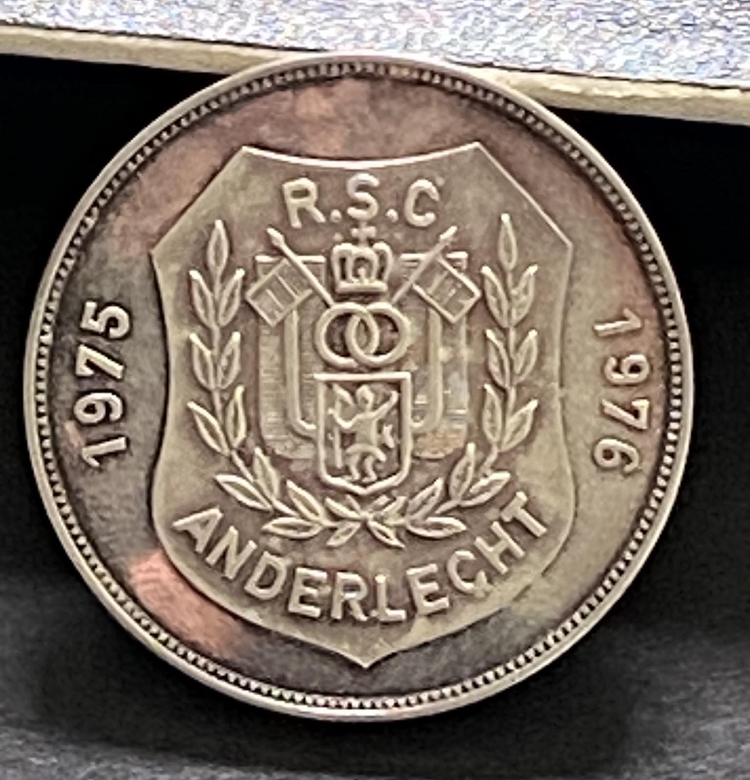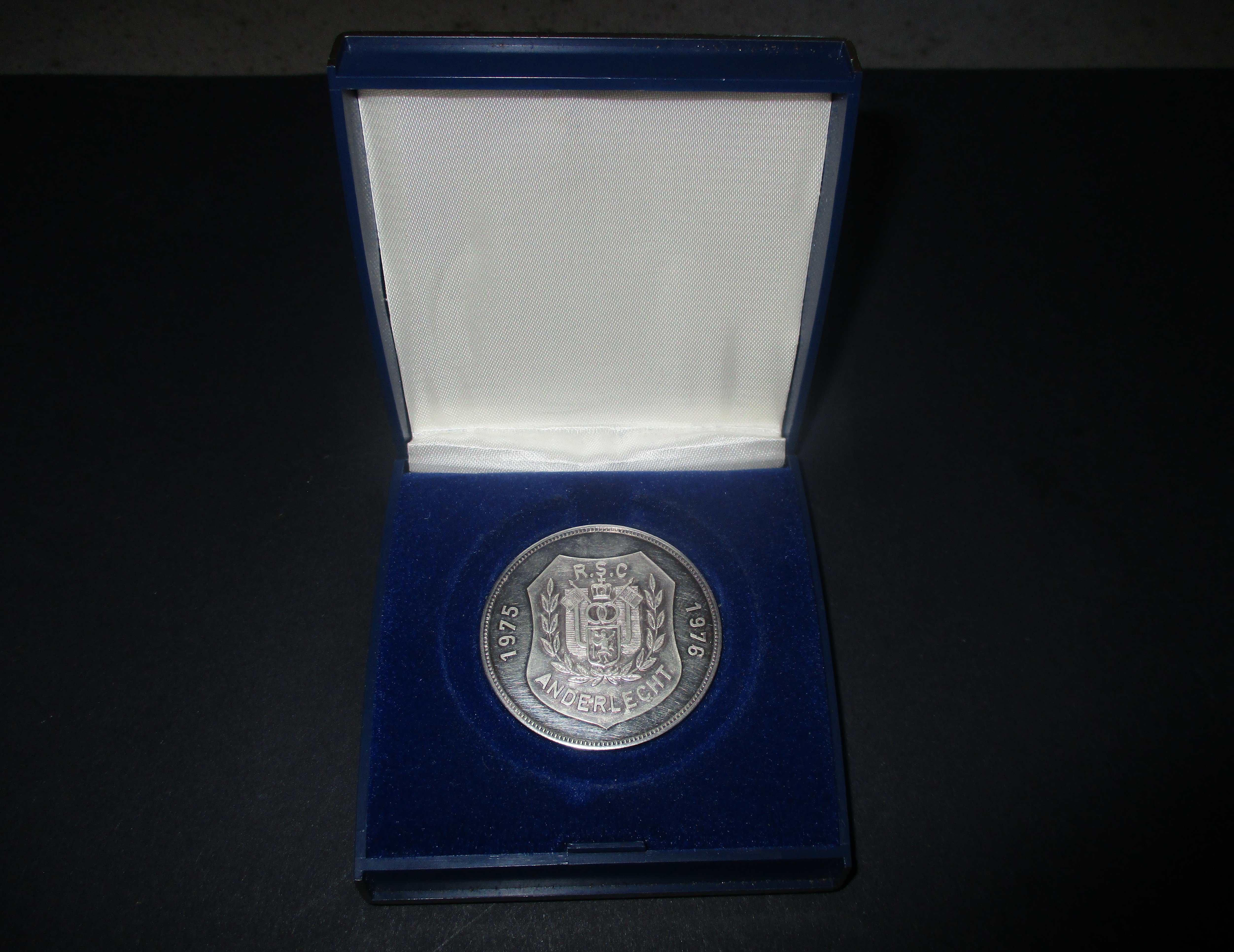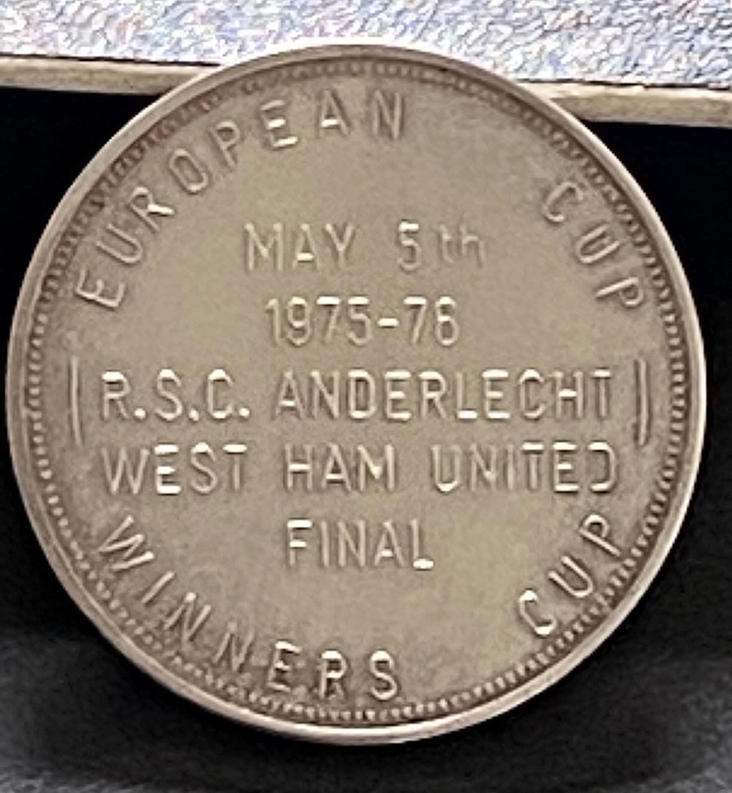 John Lyalls 1976 ECWC Final Exchange Football Medal: Given to Lyall by the opposing team Anderlecht at the final in Brussels before the match. Boxed medal states RSC Anderlecht 1975 1976 to one side. The reverse reads European Cup Winners Cup May 5th 1975-76 RSC Anderlecht West Ham United Final. Rare item in original box. Not to be confused with the one issued by UEFA but probably more scarce.