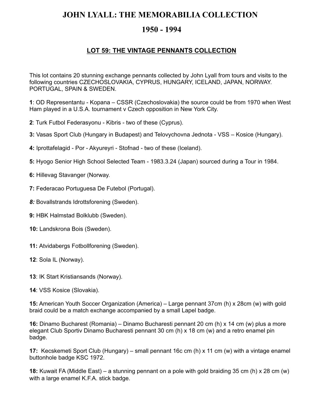 John Lyalls Football Pennant Collection: 20 pennants picked up in his career and listed by his family which can be viewed with online pictures.
