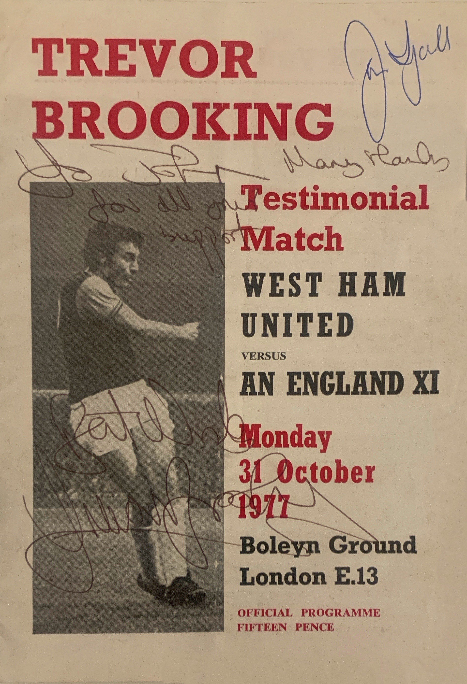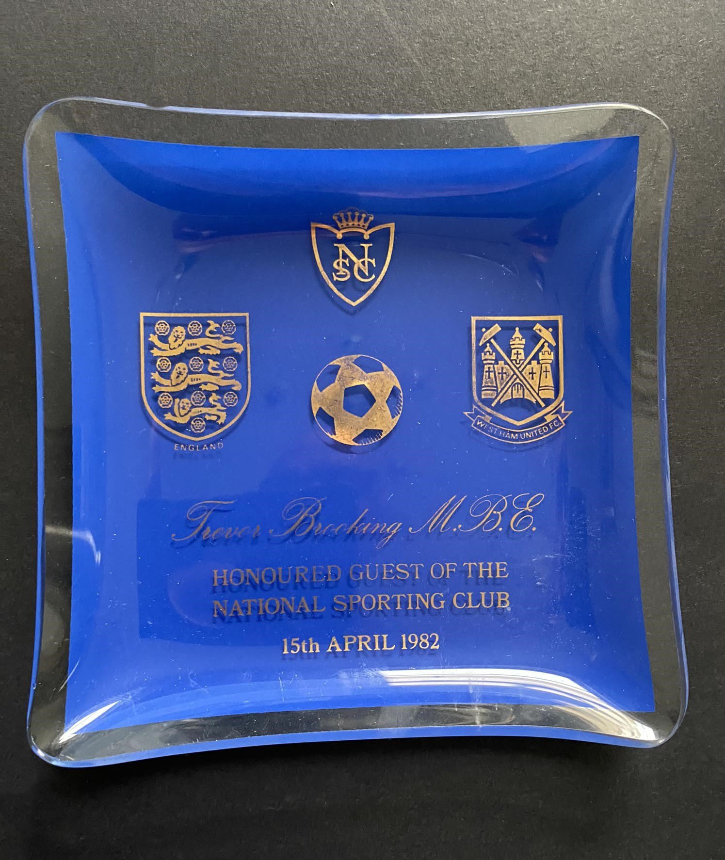 Trevor Brooking Football Memorabilia: From John Lyalls personal collection over the years to include an ashtray from the Royal Sporting Club 1982. Includes Freedom of Brentwood brochure signed by Lyall, 3 photos and Brookings testimonial programme signed by Brooking and Lyall.