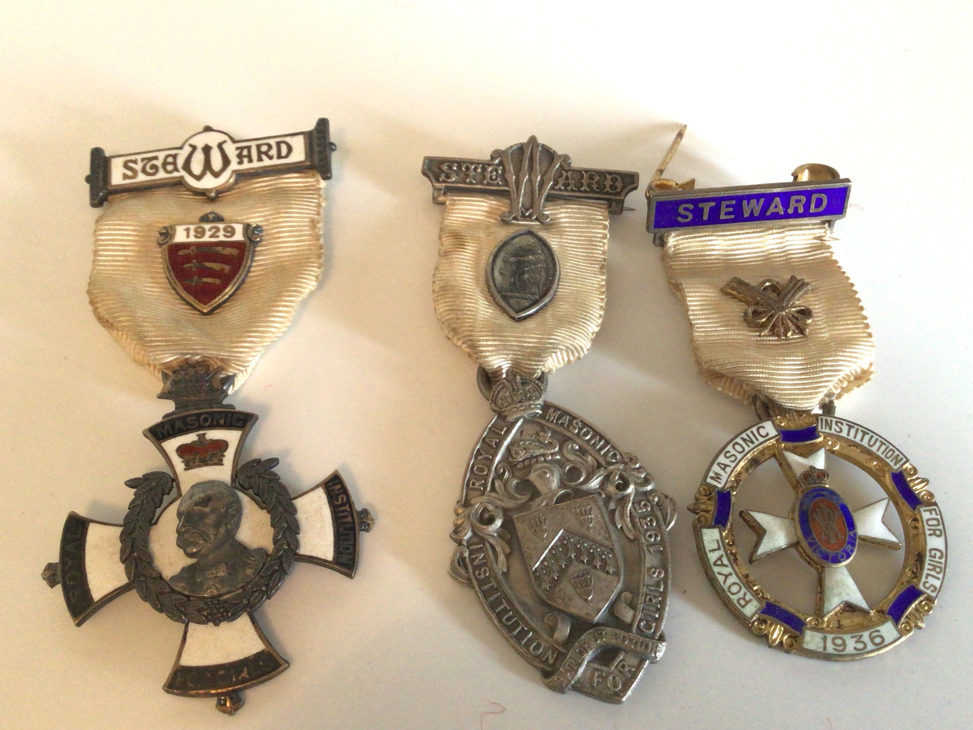 Three Silver and enamel Stewards jewels Essex 1929 another dated 1935 1936 (3)
