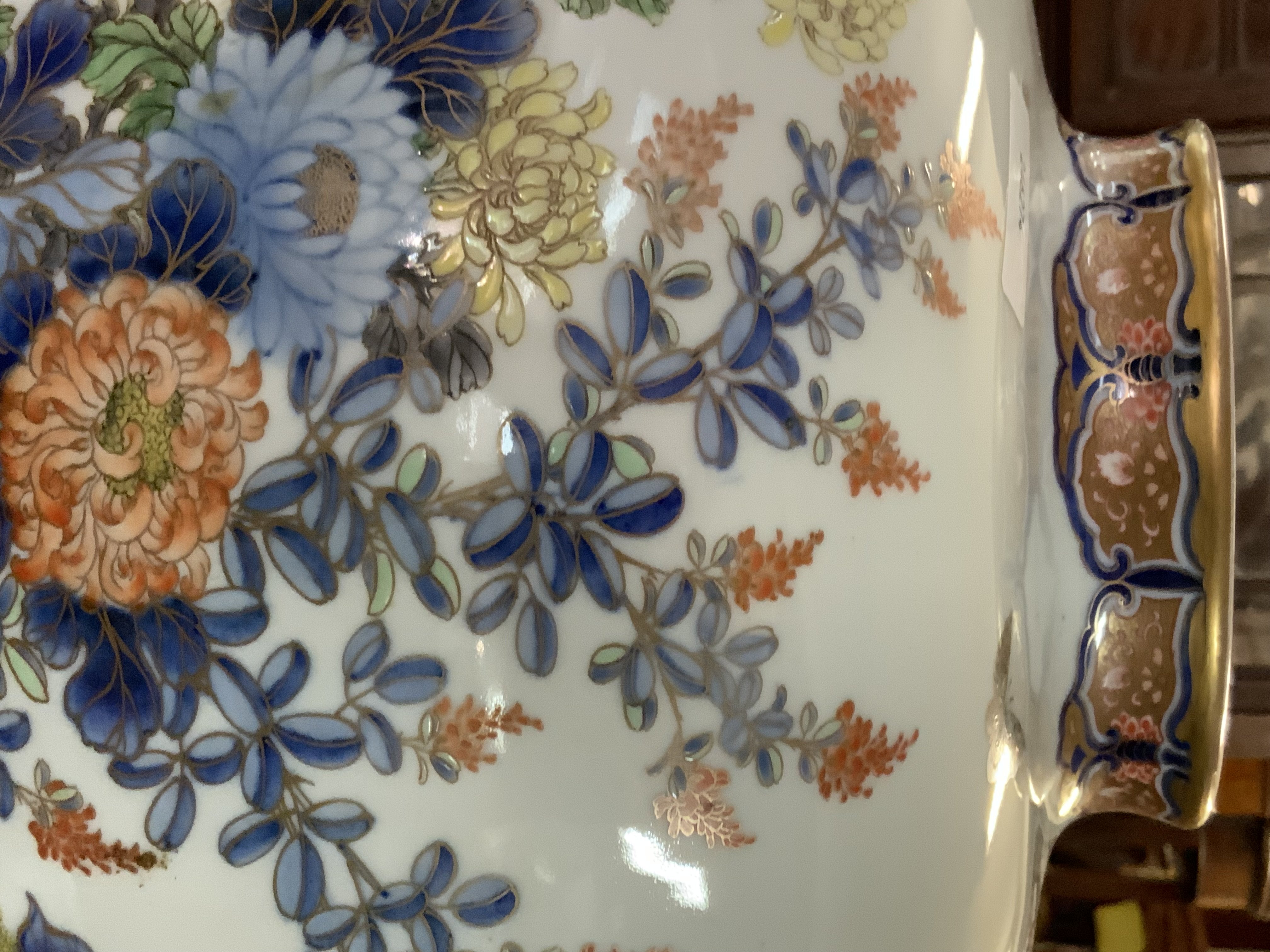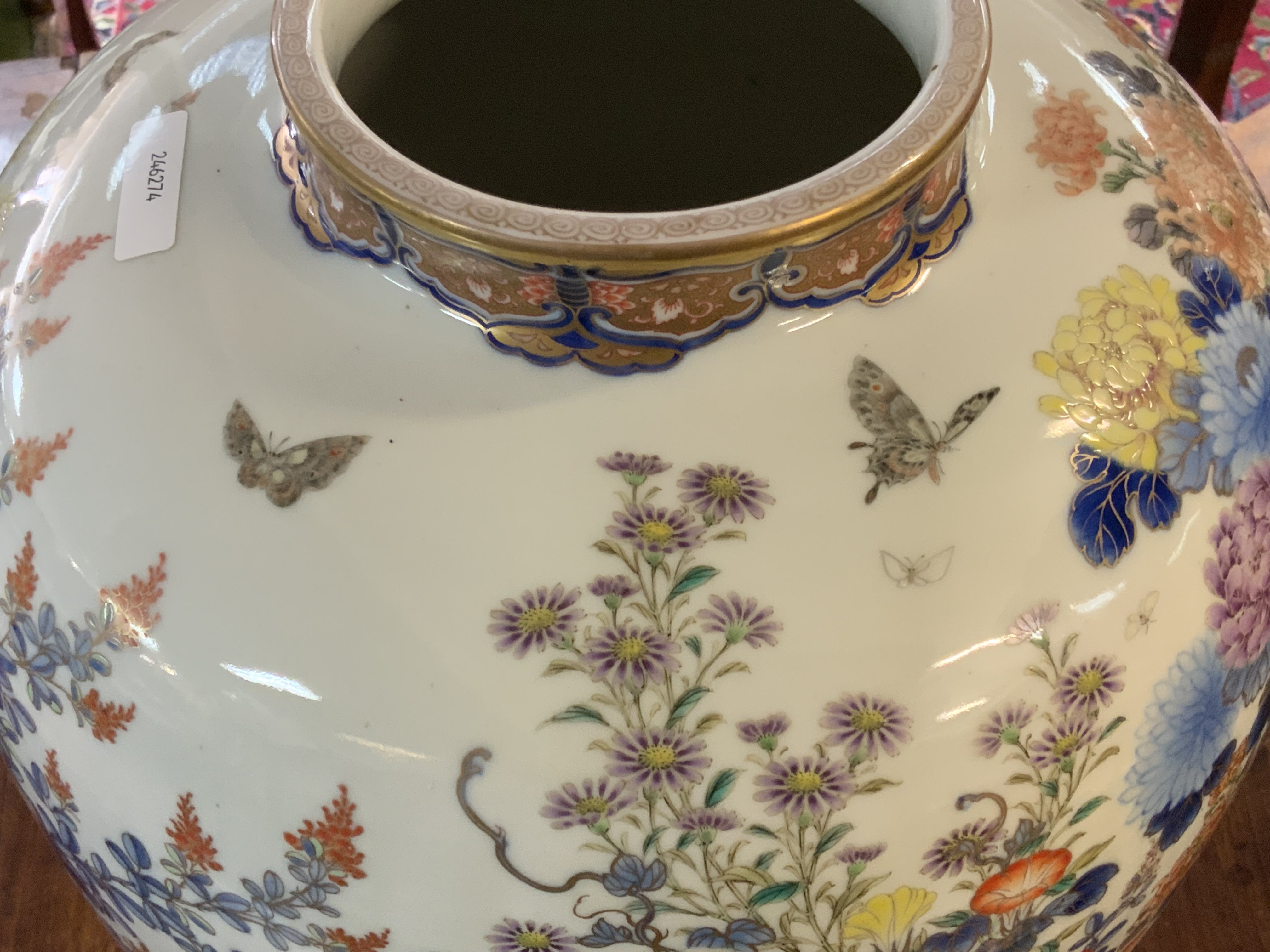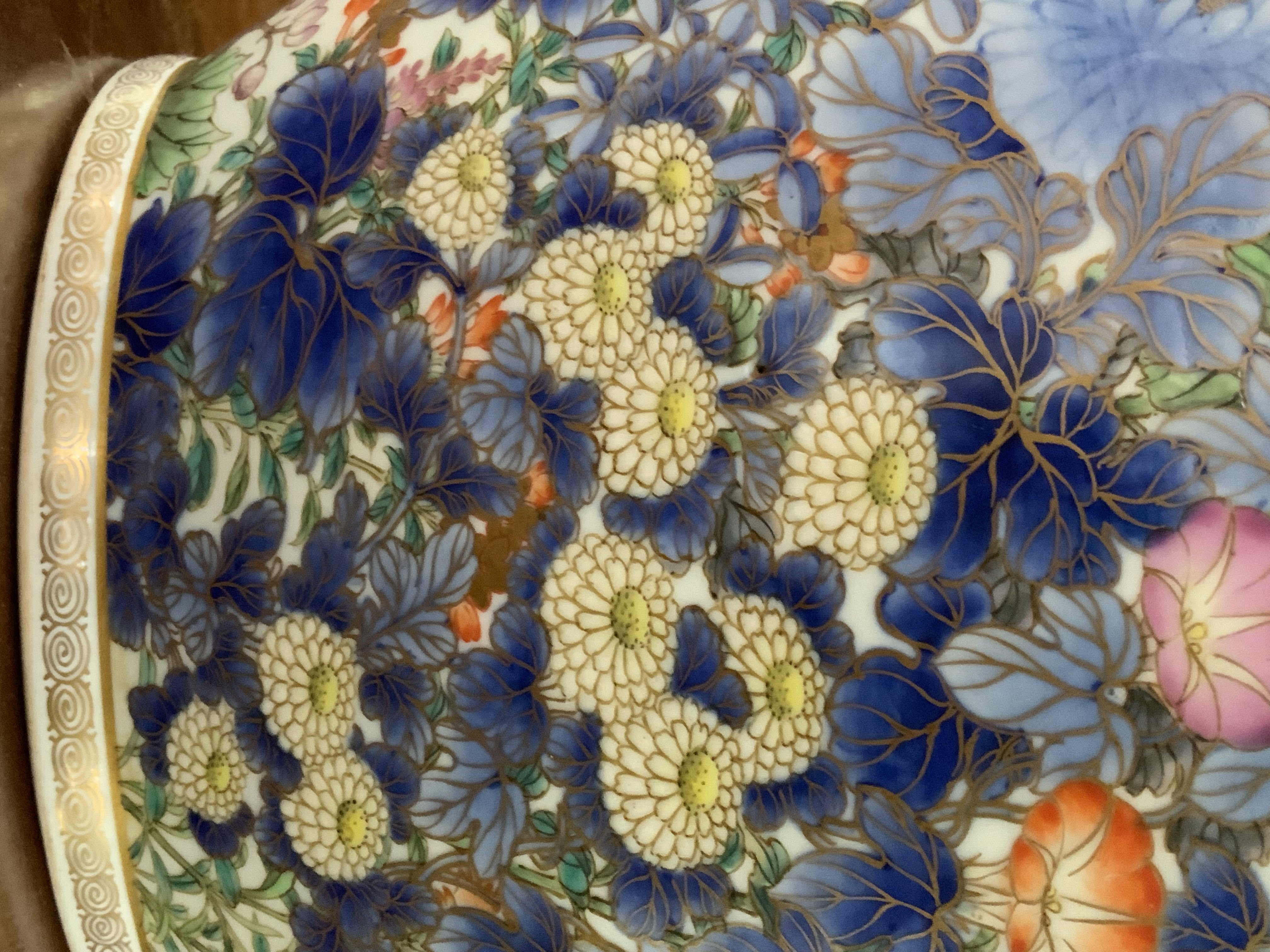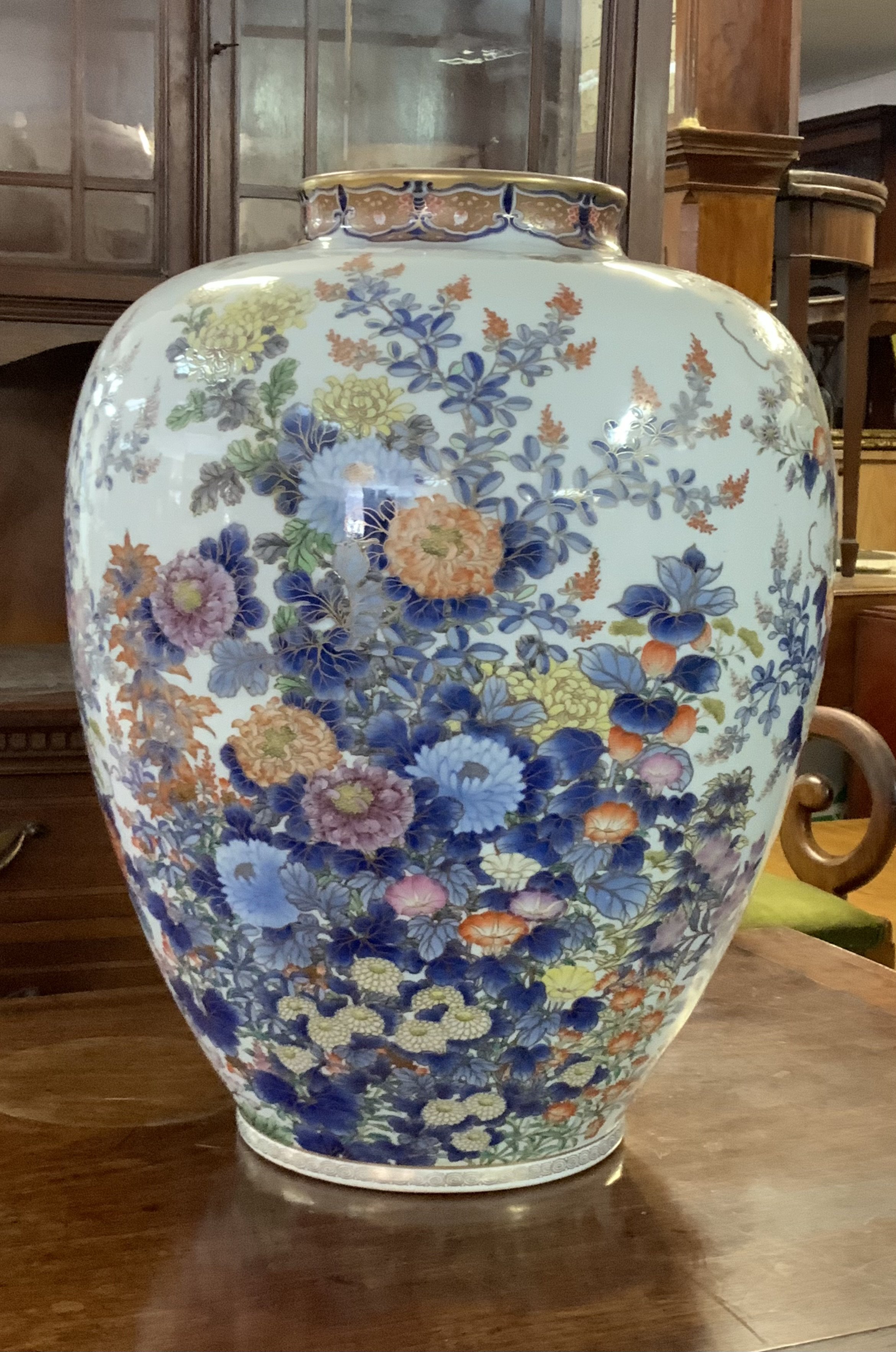 A good Koransha porcelain vase, c. 1880, the body painted in underglaze blue, Oranges, yellows and gilding to the chrysanthemums and foliage, underglaze blue signature, 40cm
