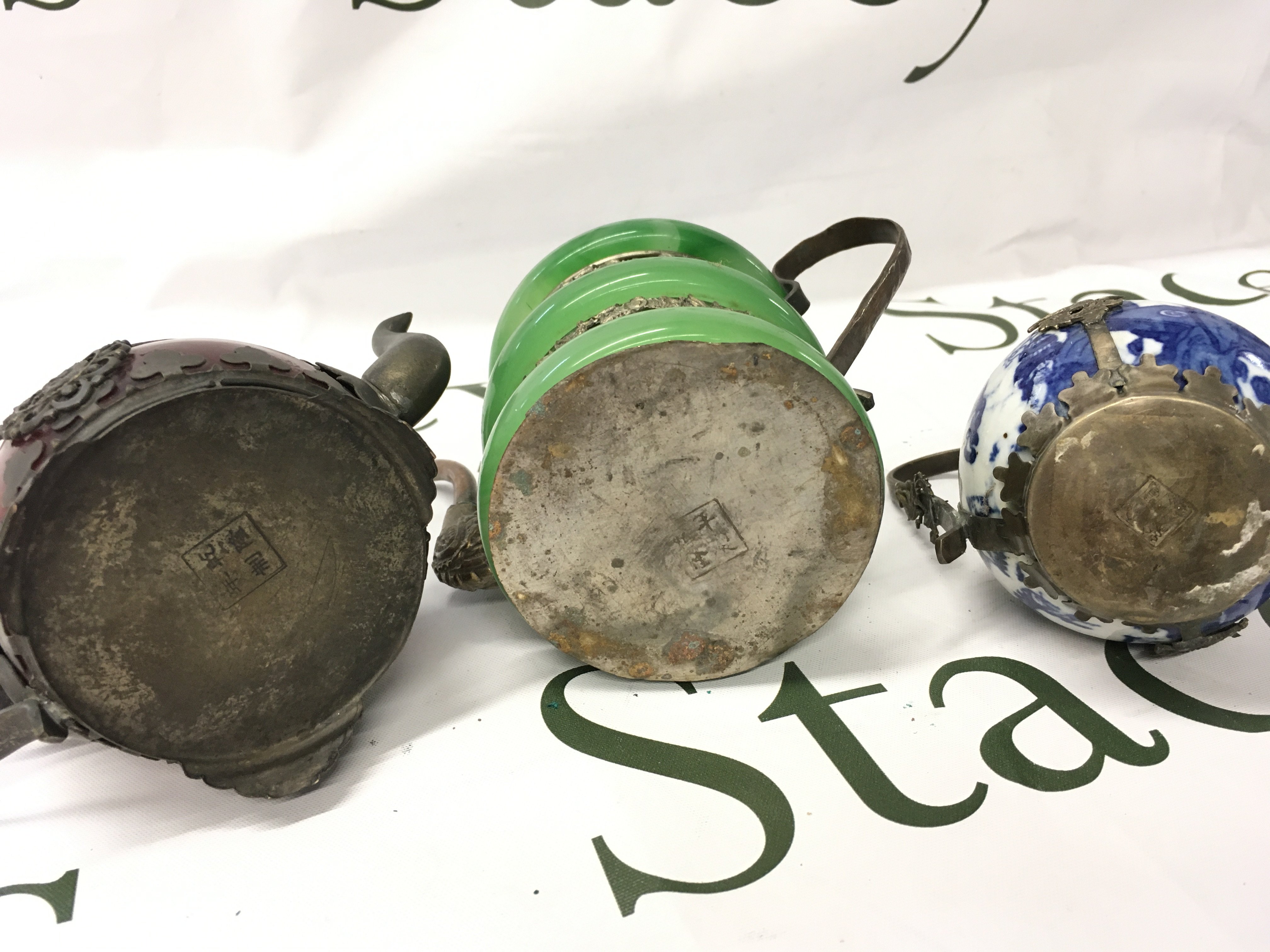 Three Chinese metal mounted tea pots. 9 to 12cm tall. With four character marks to base. This lot cannot be posted