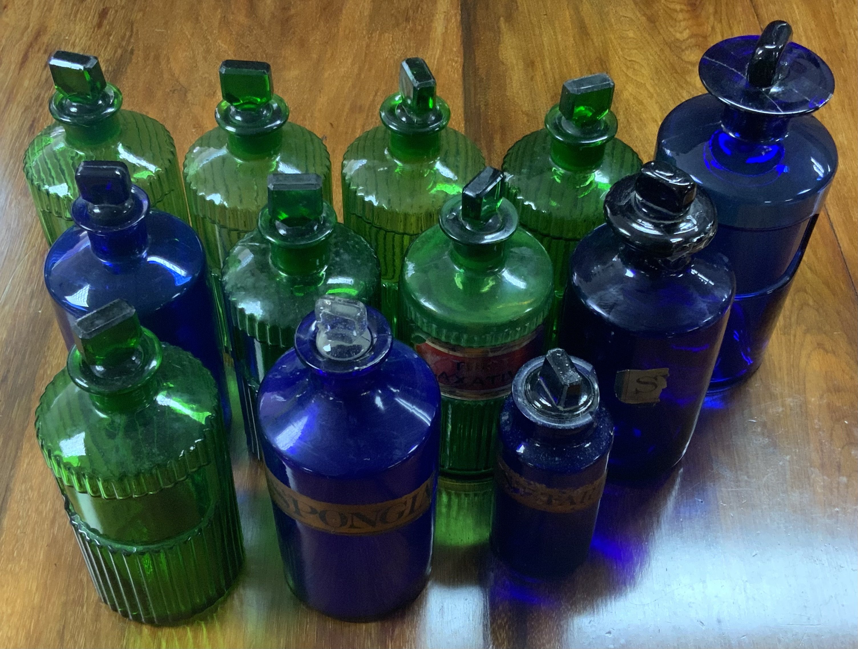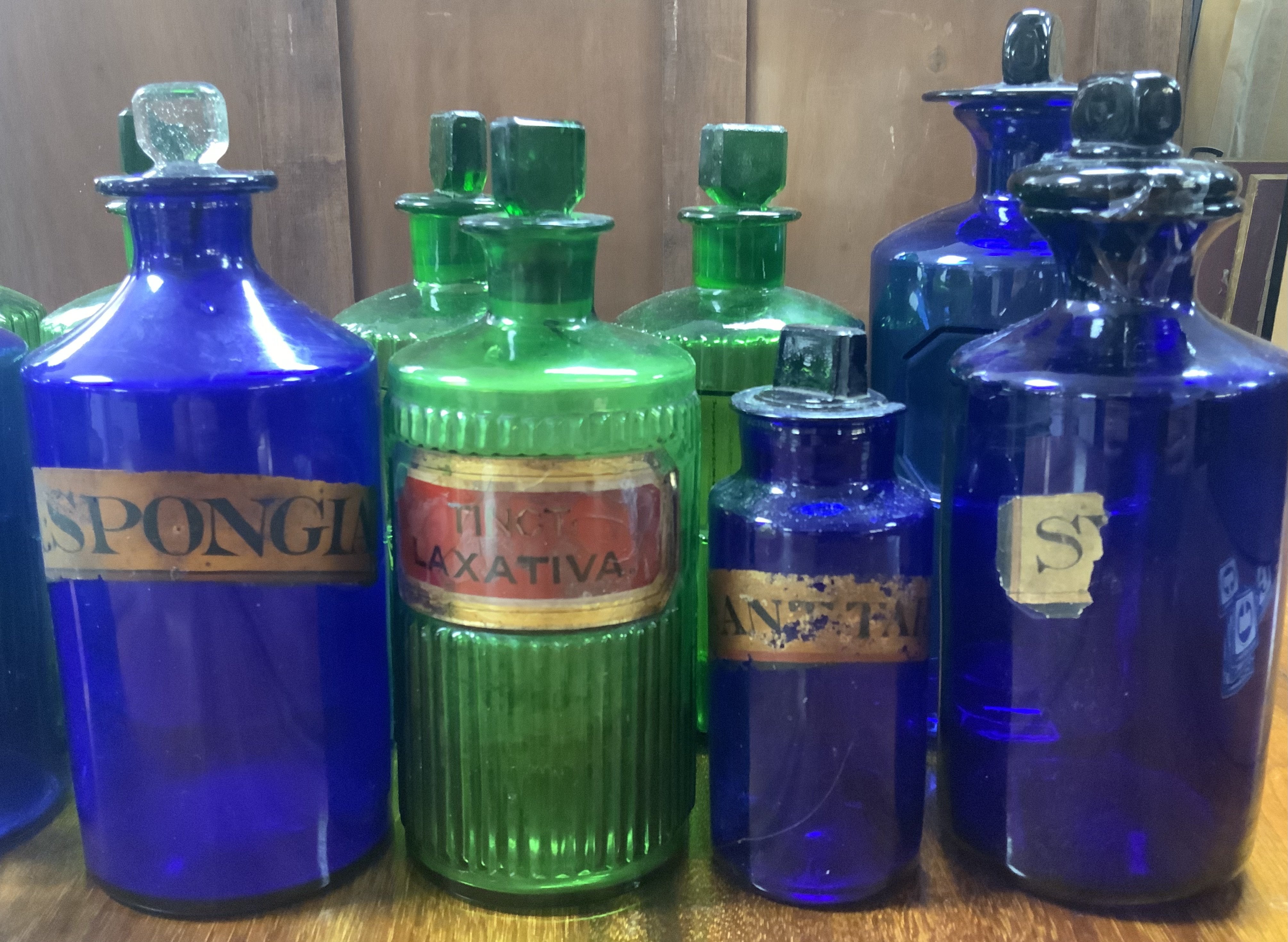 A collection of 19th Century Bristol Blue and Green glass apothecary bottles. 14/20/21cm (D) some damage., partial labels