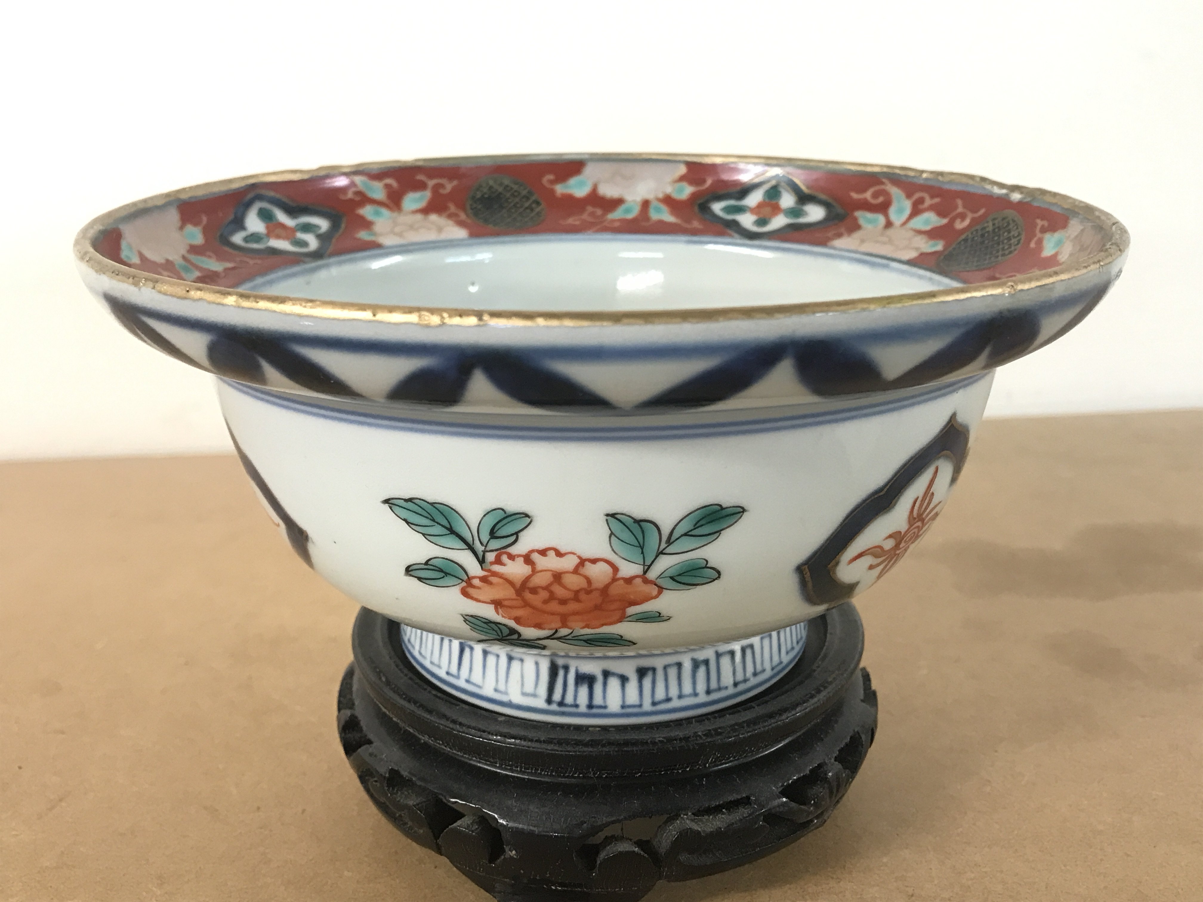 A Japanese Imari ware bowl with stand , 6 character mark at base. 8.5cm tall 18cm wide . This lot cannot be posted