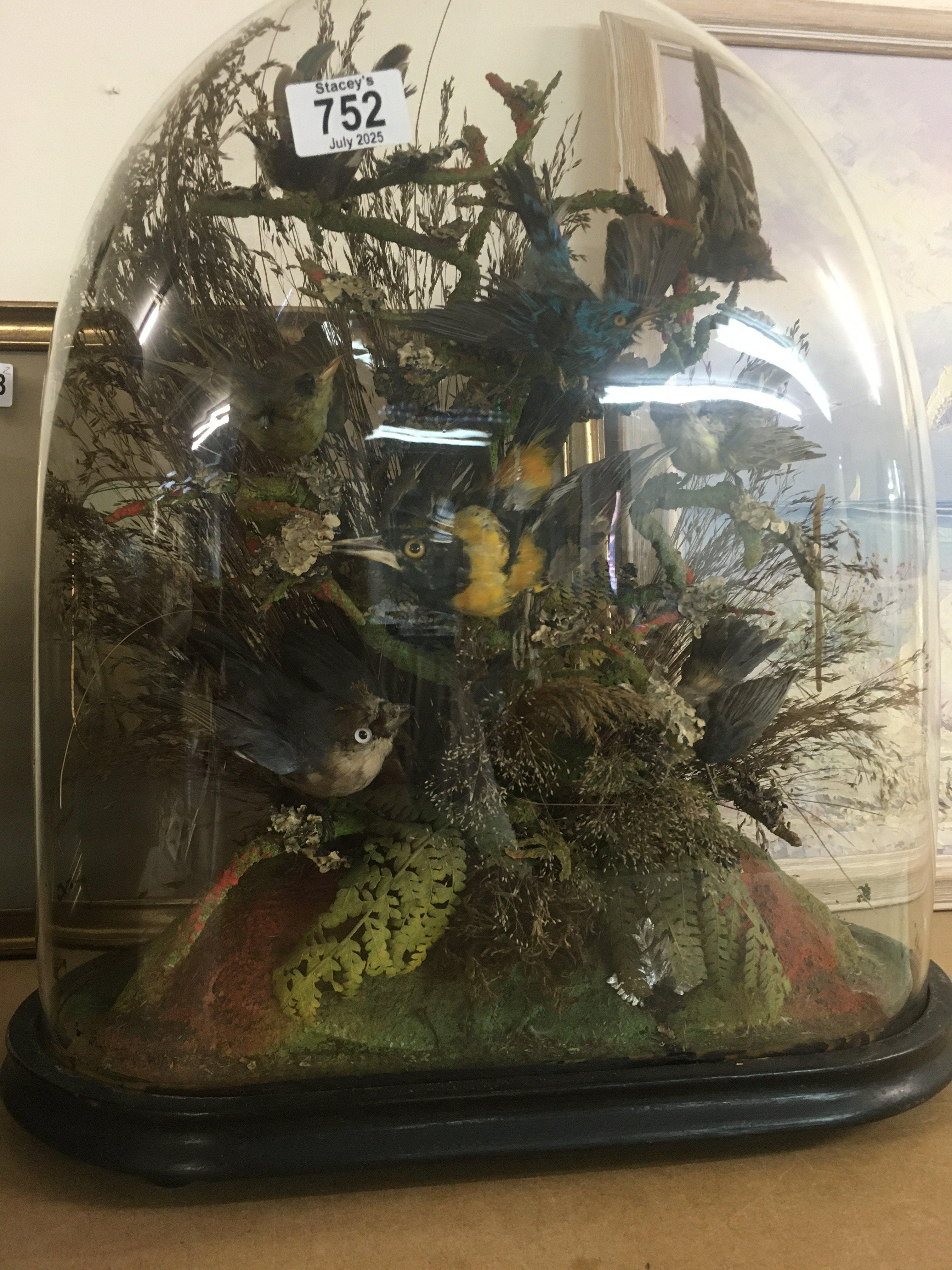 A Victorian taxidermy bird display under a glass dome .44cm .