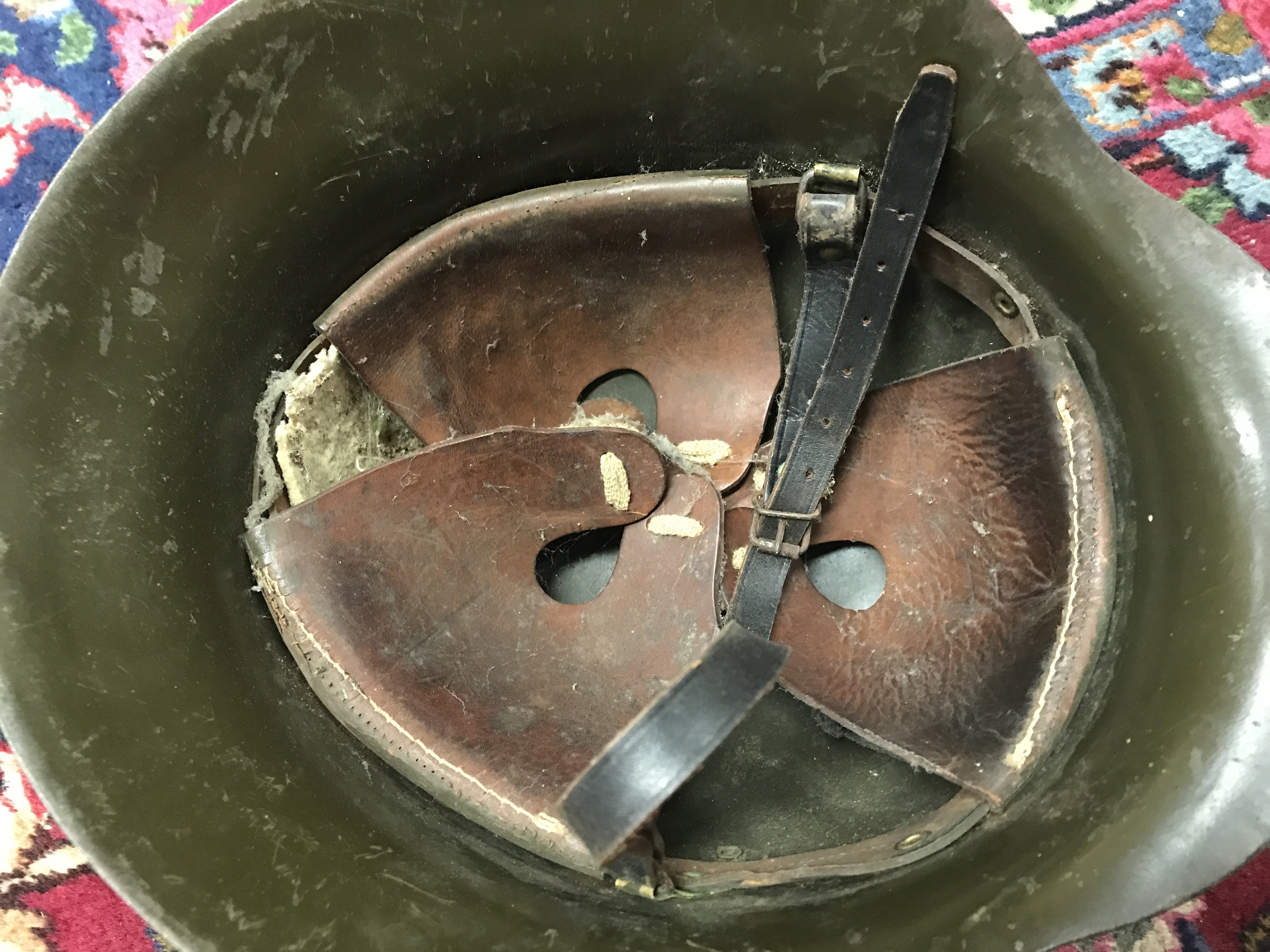 A German Third Reich M42 pattern helmet green with attached bracket above the peak thick cut leather liner. No obvious stamp marks.