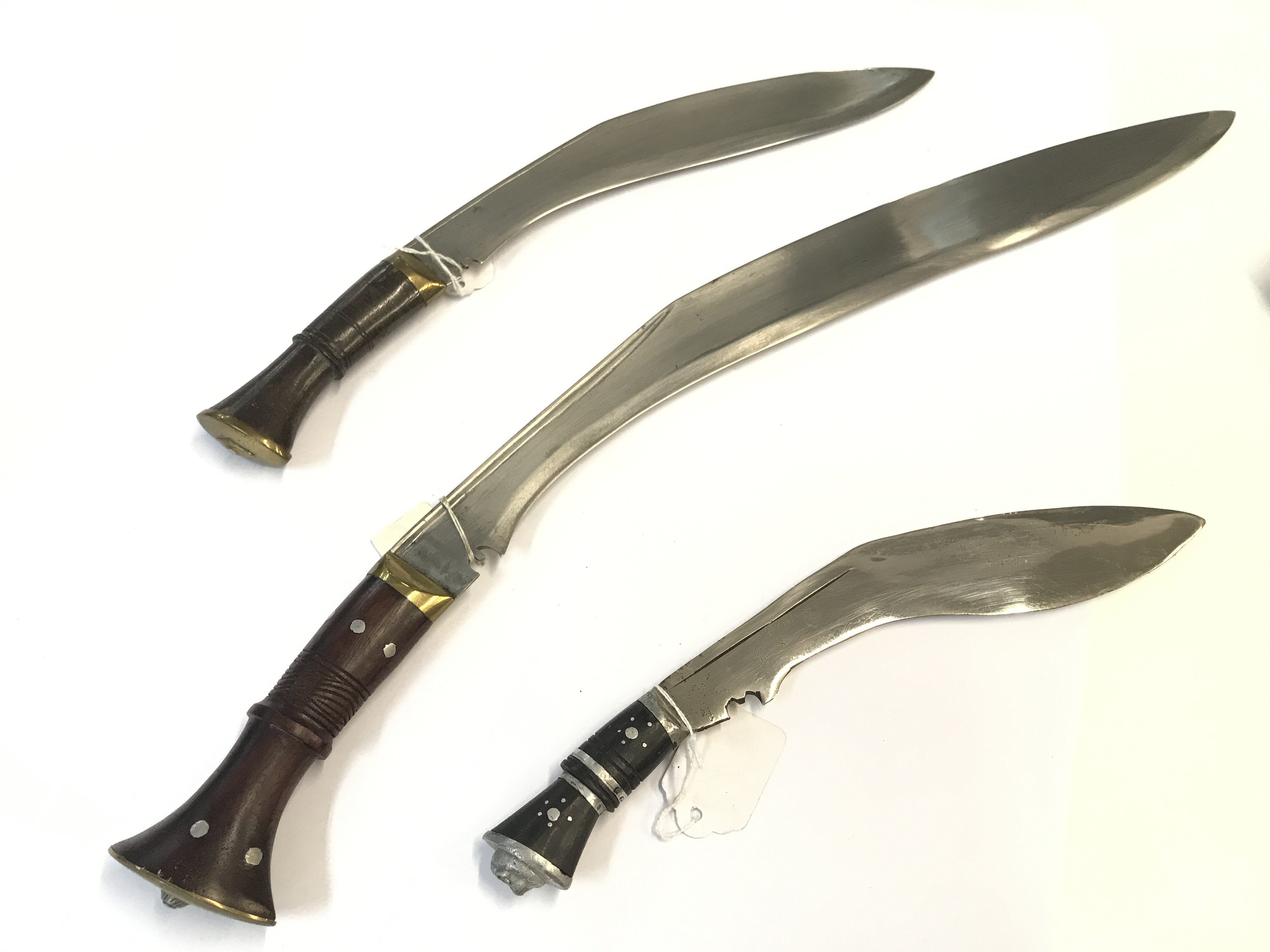 Three Early 20th Century Kukri Knifes The Traditional Nepalese knife. With brass set wood and horn handles including a smaller example (3)