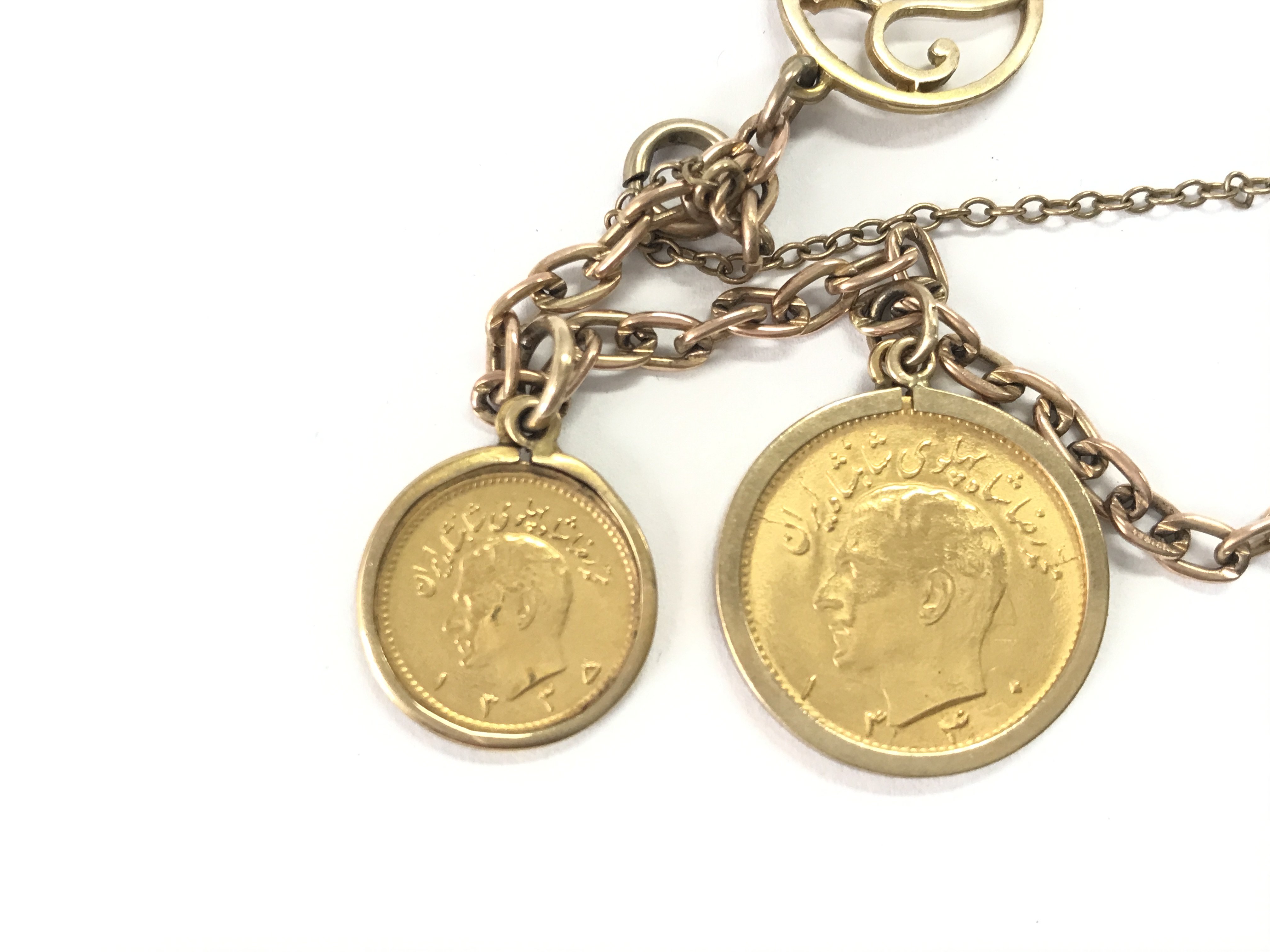 A 9ct gold charm bracelet with assorted charms and two Iranian gold coins. Approximately 18.35g Postage A