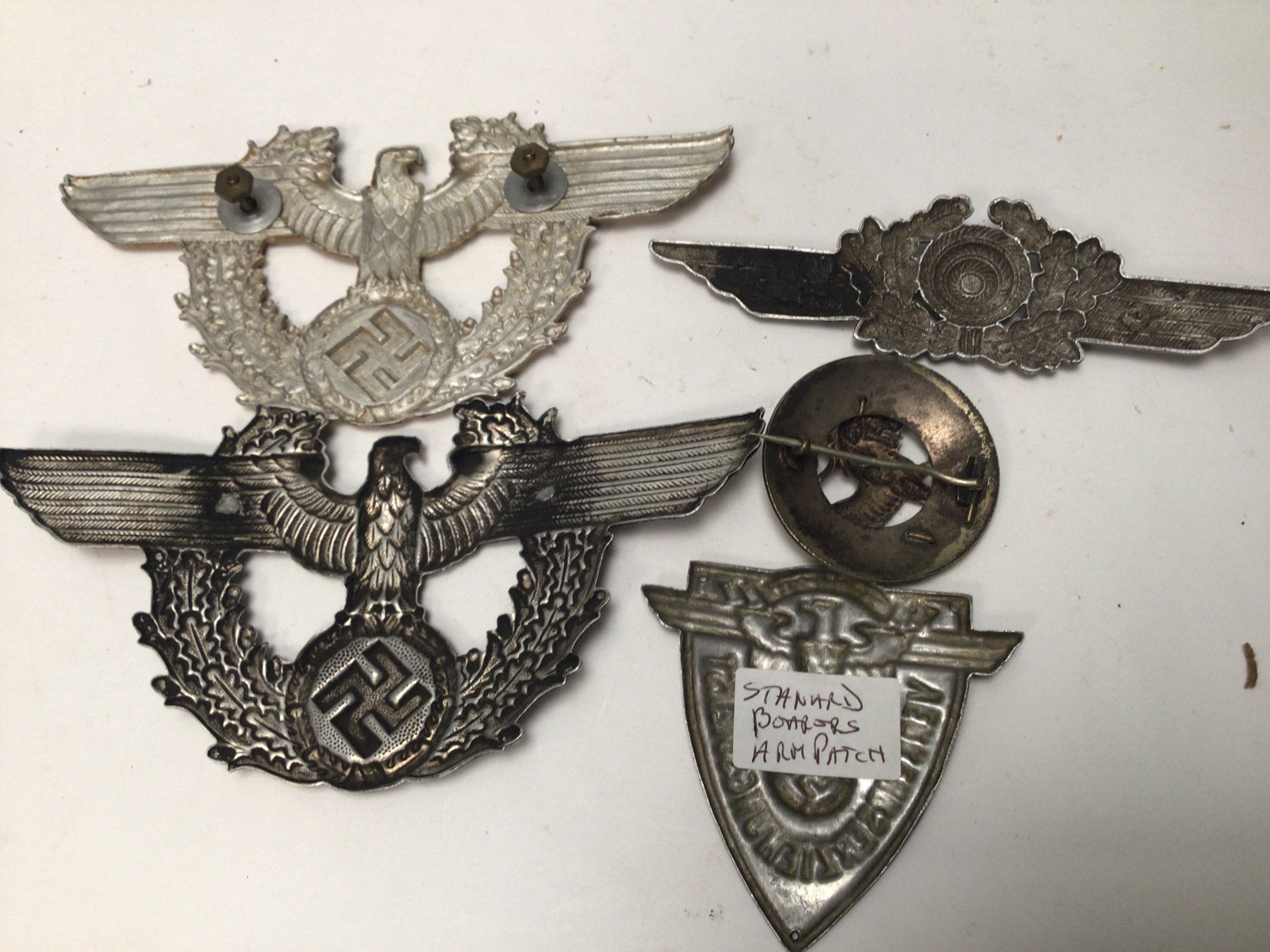 Two German Third Reich Police Shako Plates.Worn on the Nazi police helmet , the gold coloured example still w with both of its screwed fixing pins on the reverse side one other silver finish and Luftwaffe cap plate and two other badges.