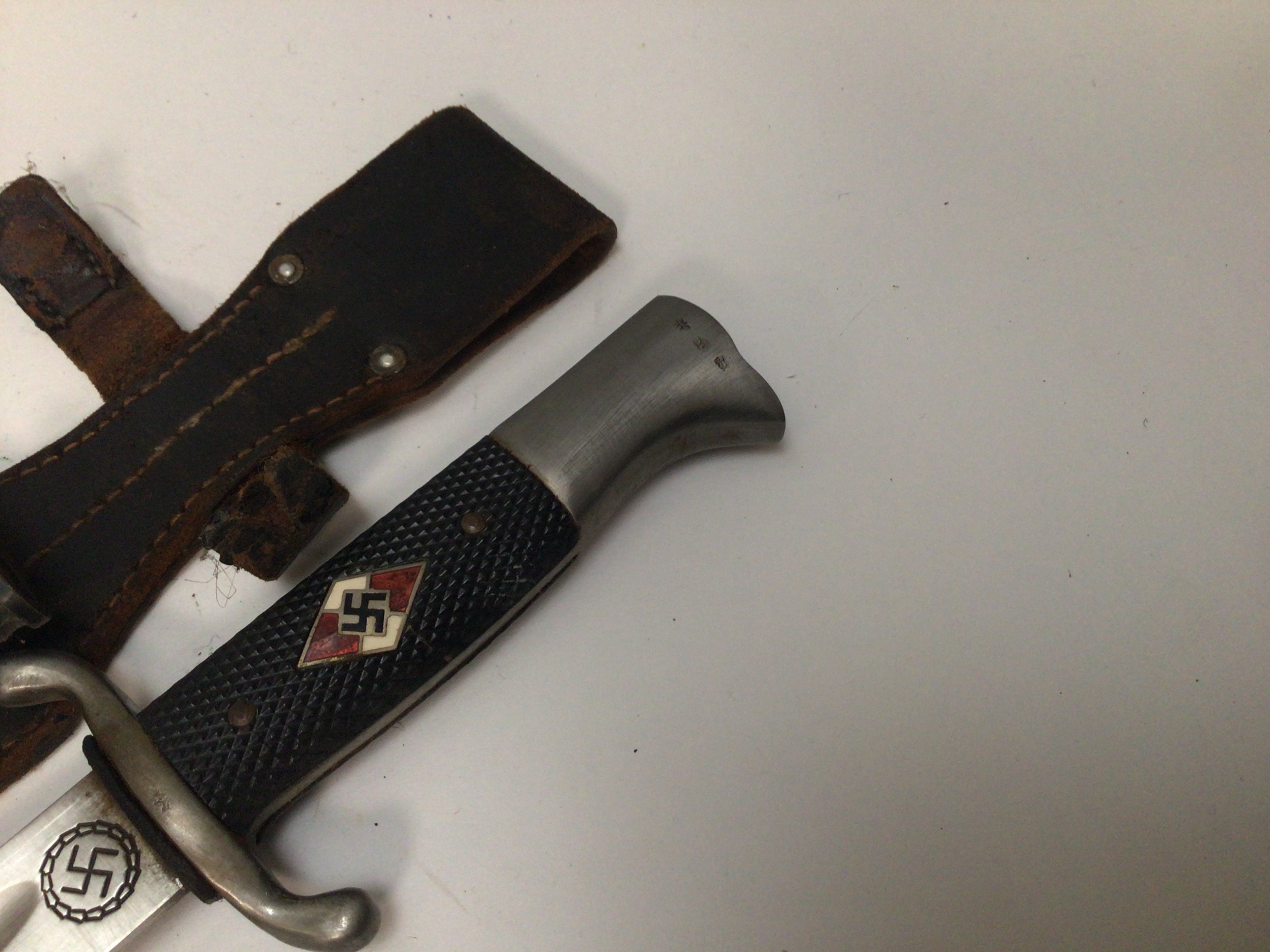 A good example of a German Hitler Youth dress bayonet with enamel decoration. Marks to the blade leather frog black steel scabbard.