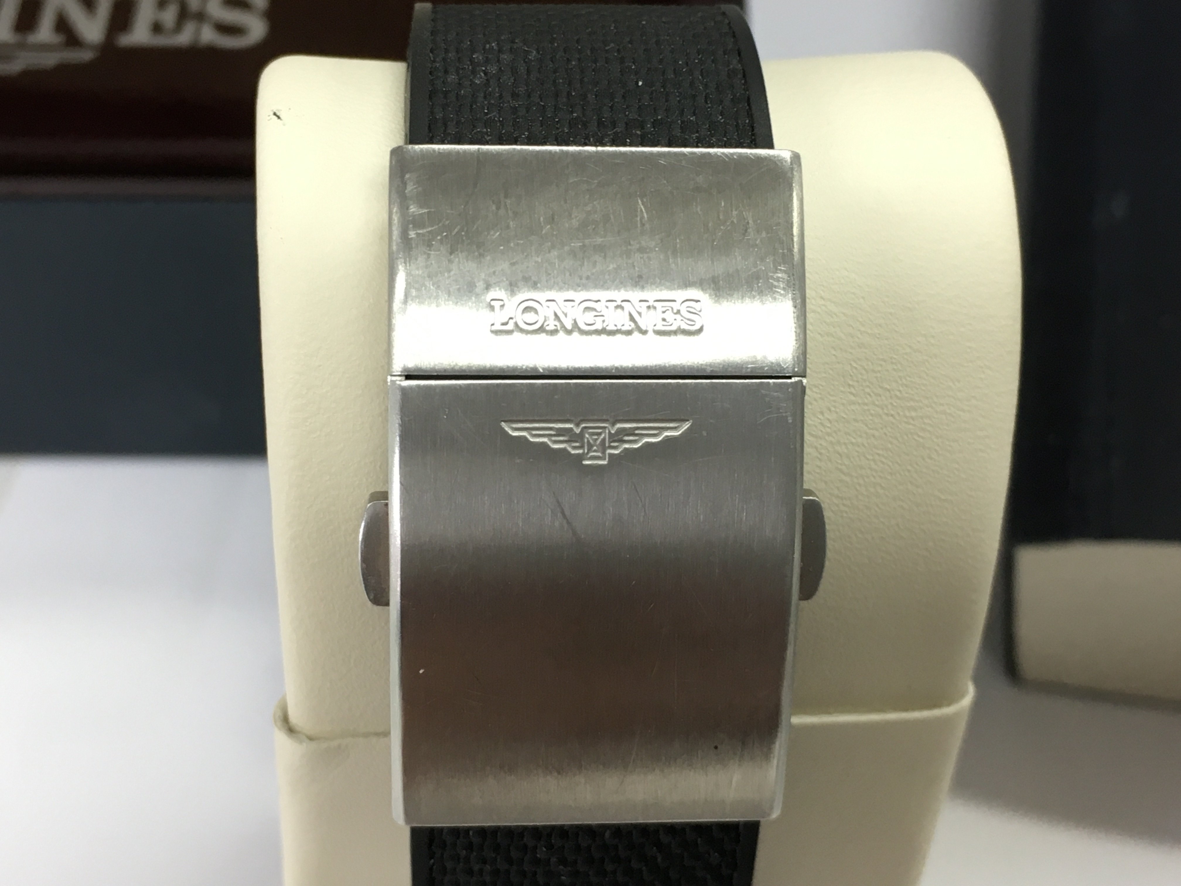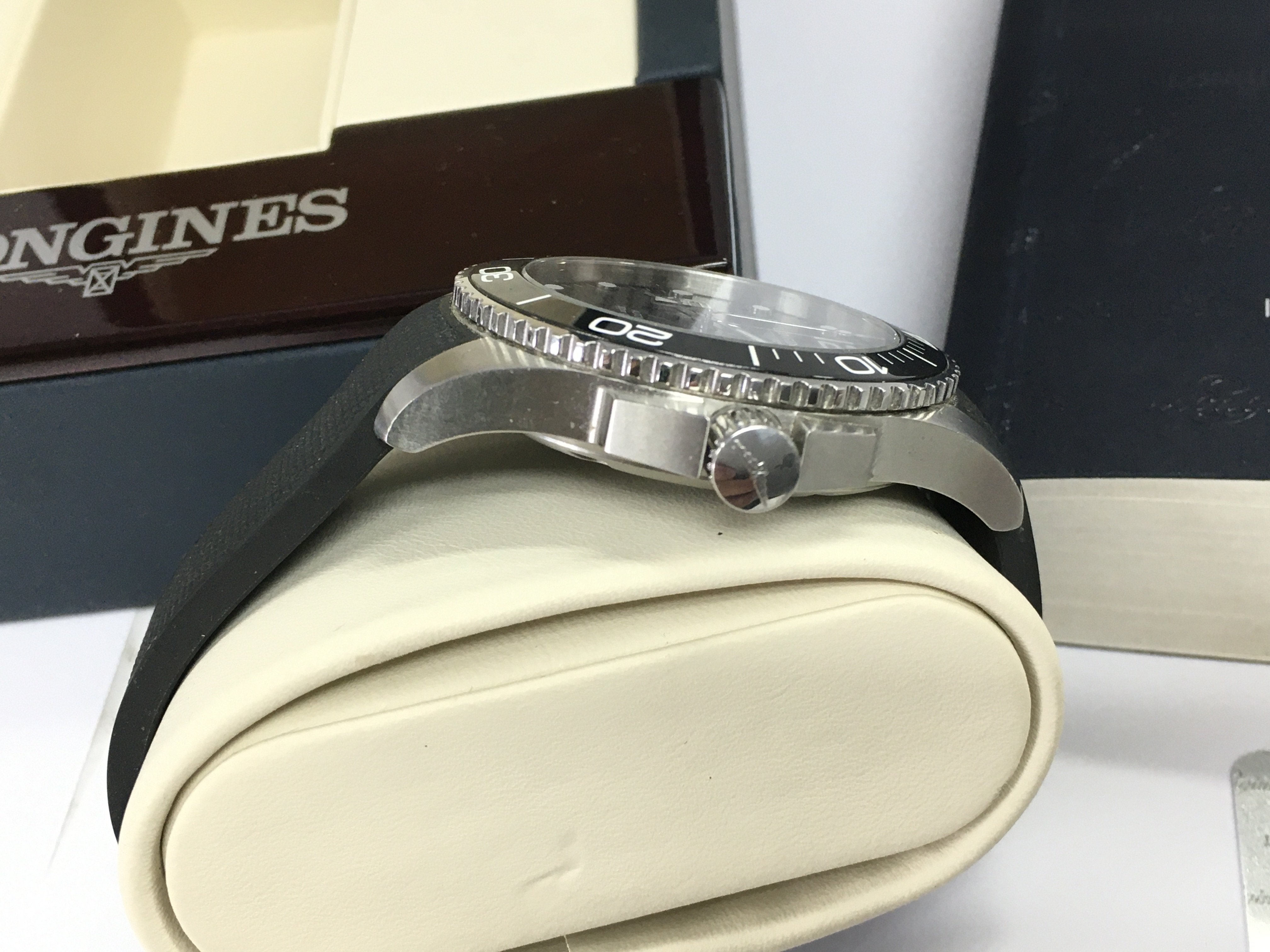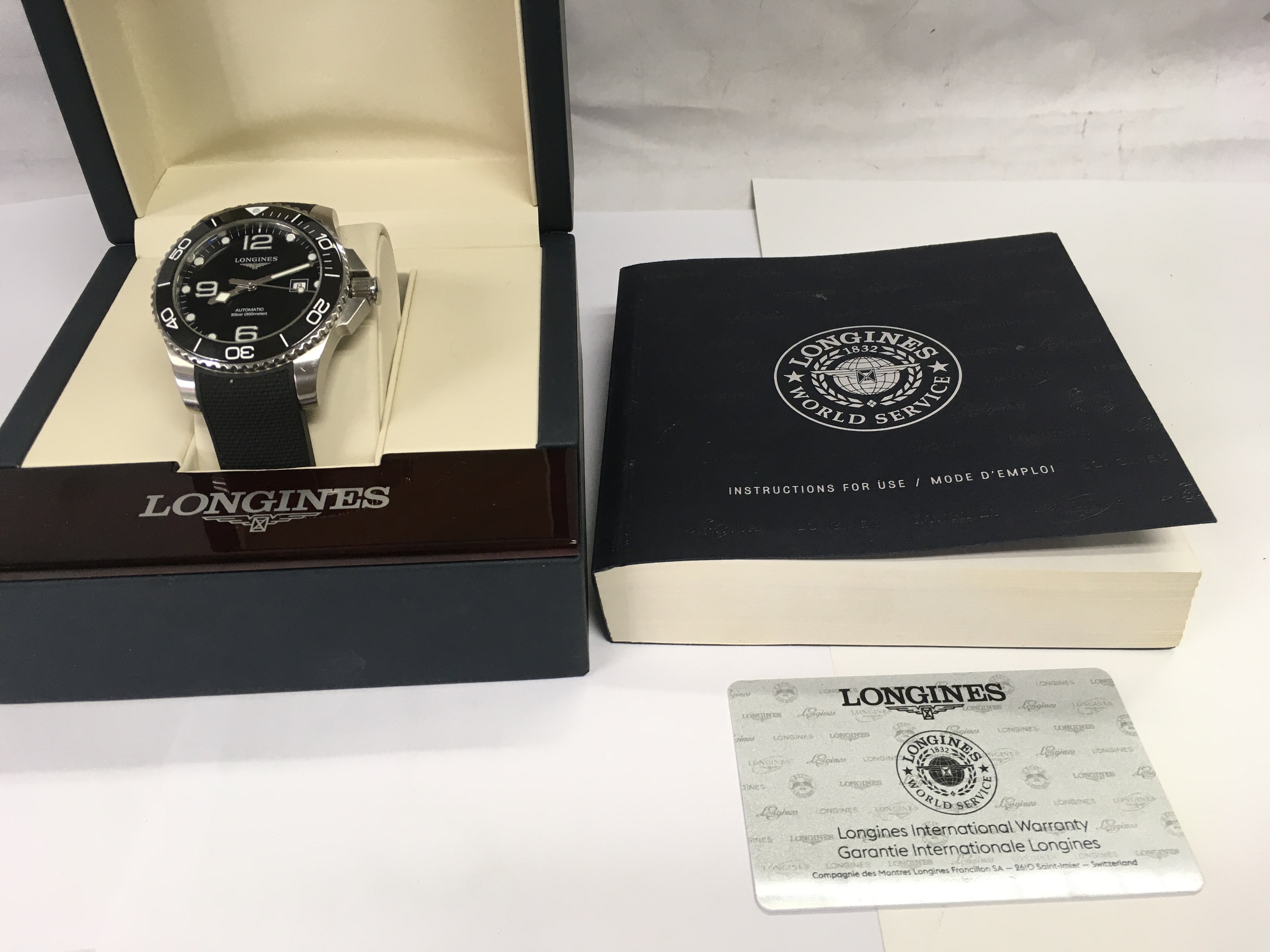 A Longines Hydroconquest gents watch. Black dial and steel case 43mm. In very good condition seen running. Comes with box and card. Postage B