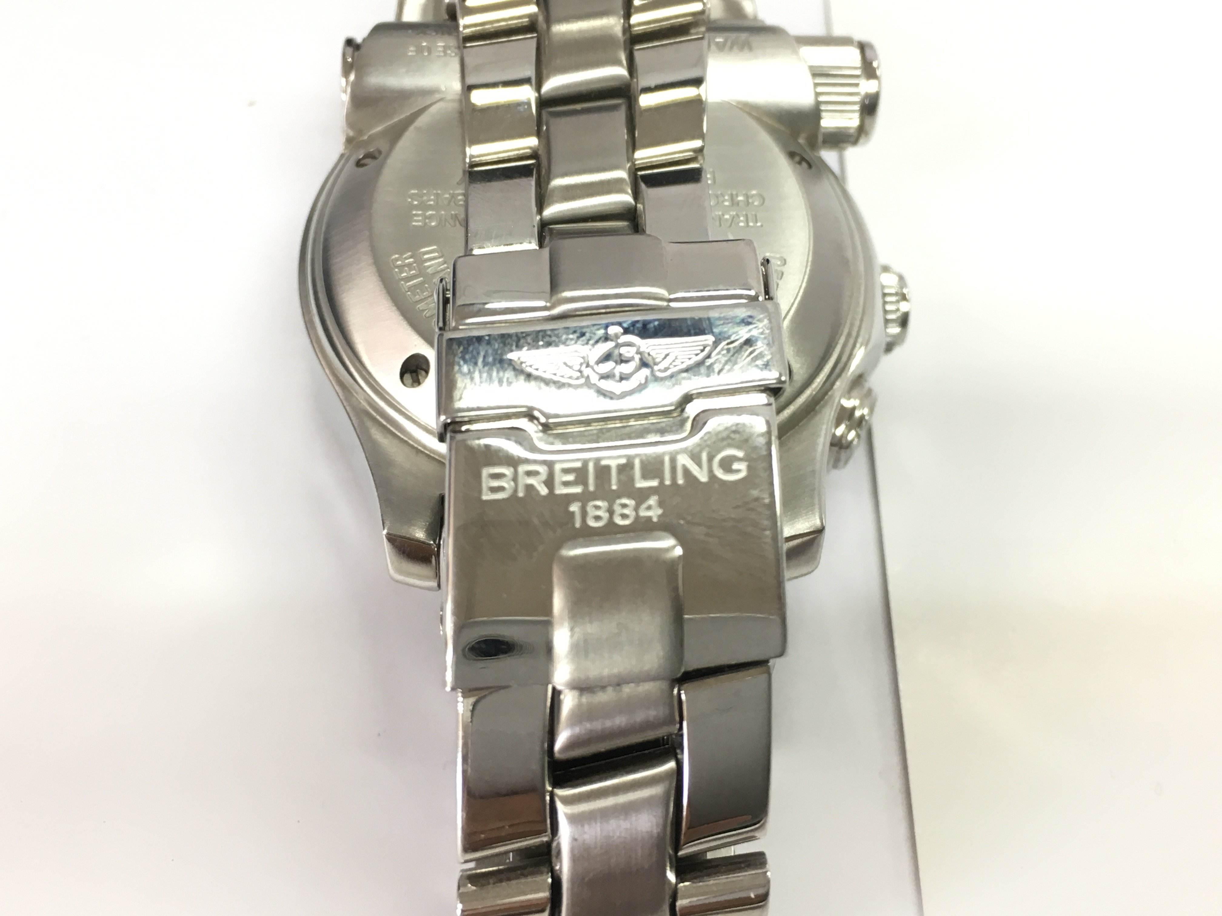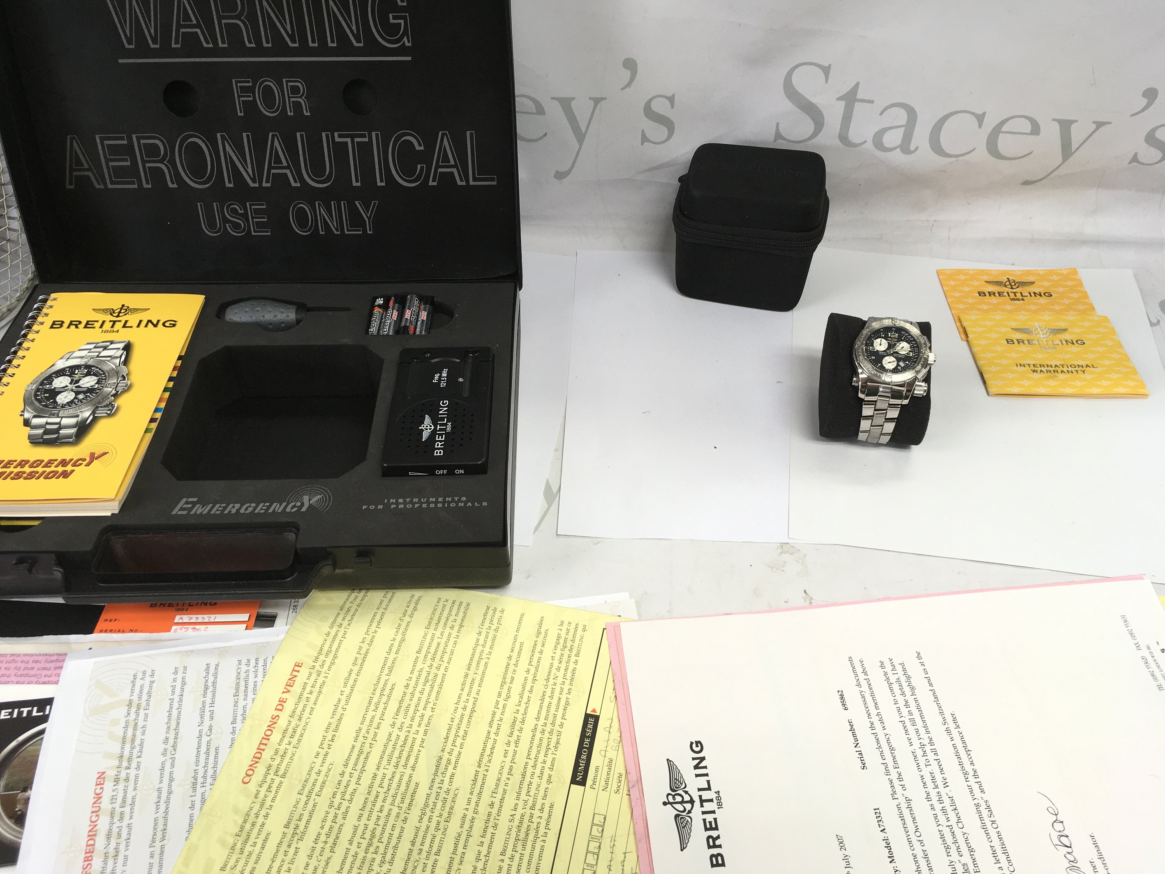 A gents Breitling emergency mission watch with box (missing original inner box) and paperwork. Has service paperwork. 45mm case. Seen running. Postage B