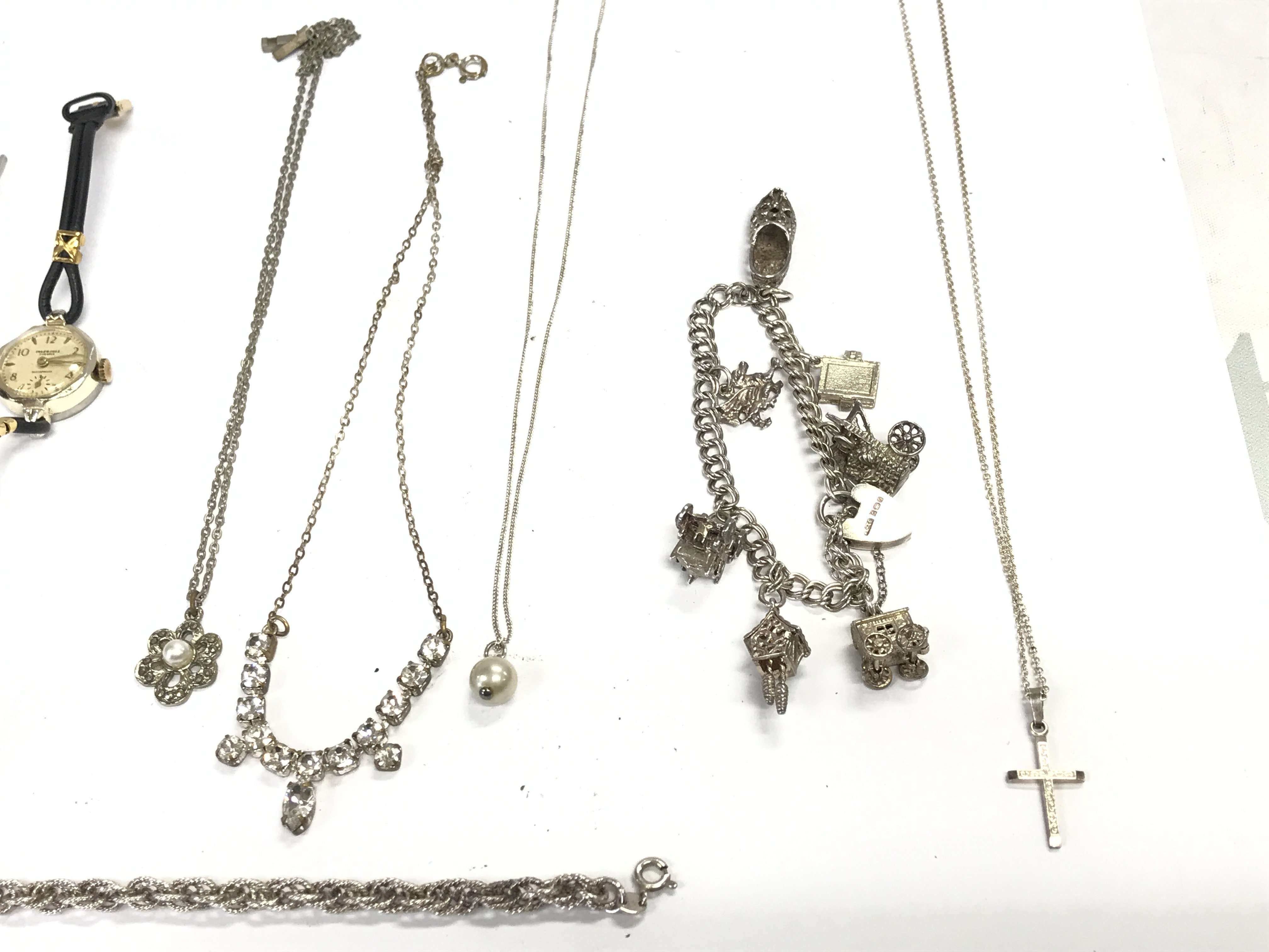 A collection of silver jewellery including a charm bracelet and some watches. Postage B