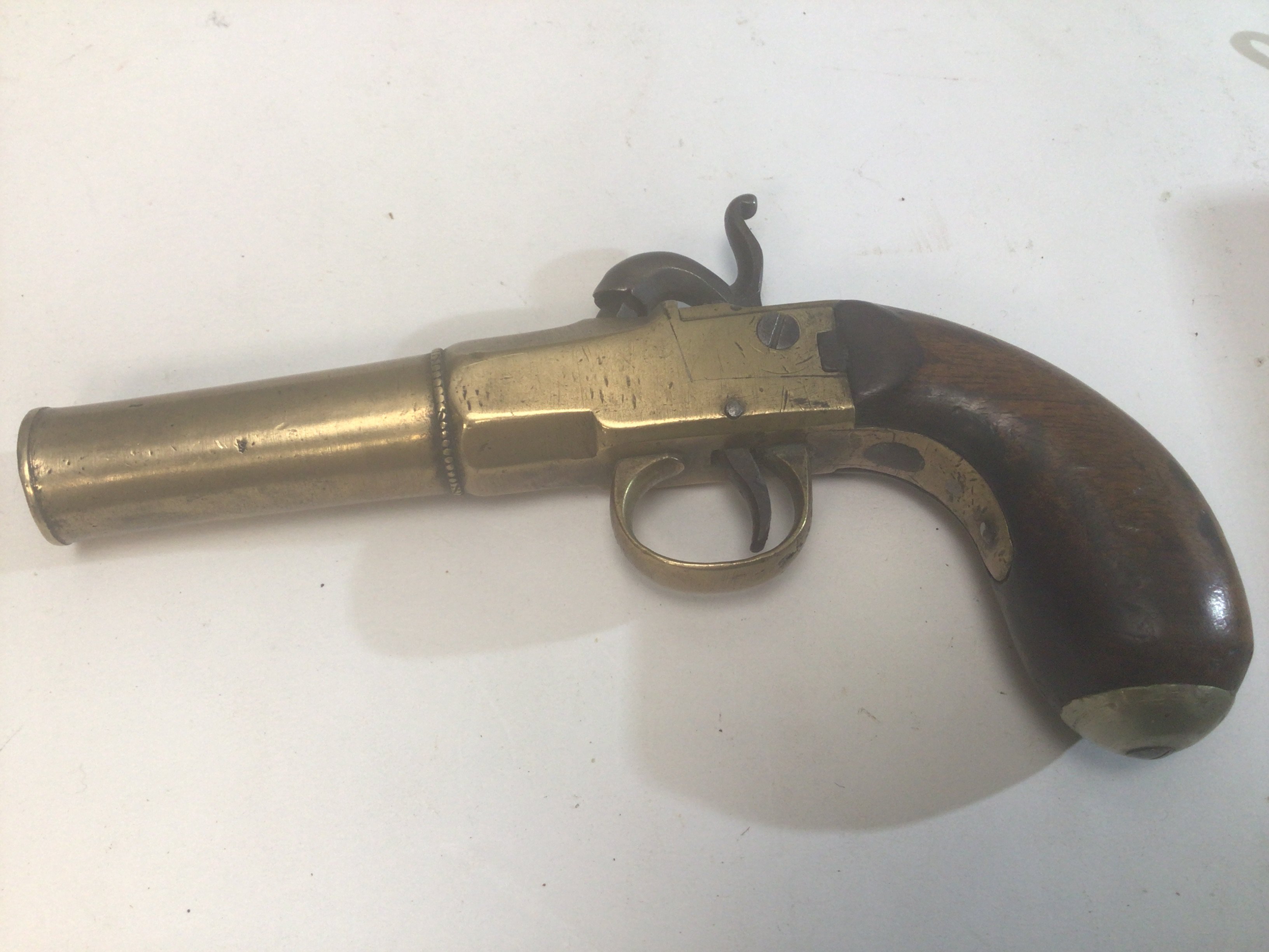 A 19th Century brass canon barrel Percussion pistol with central positioned hammer.