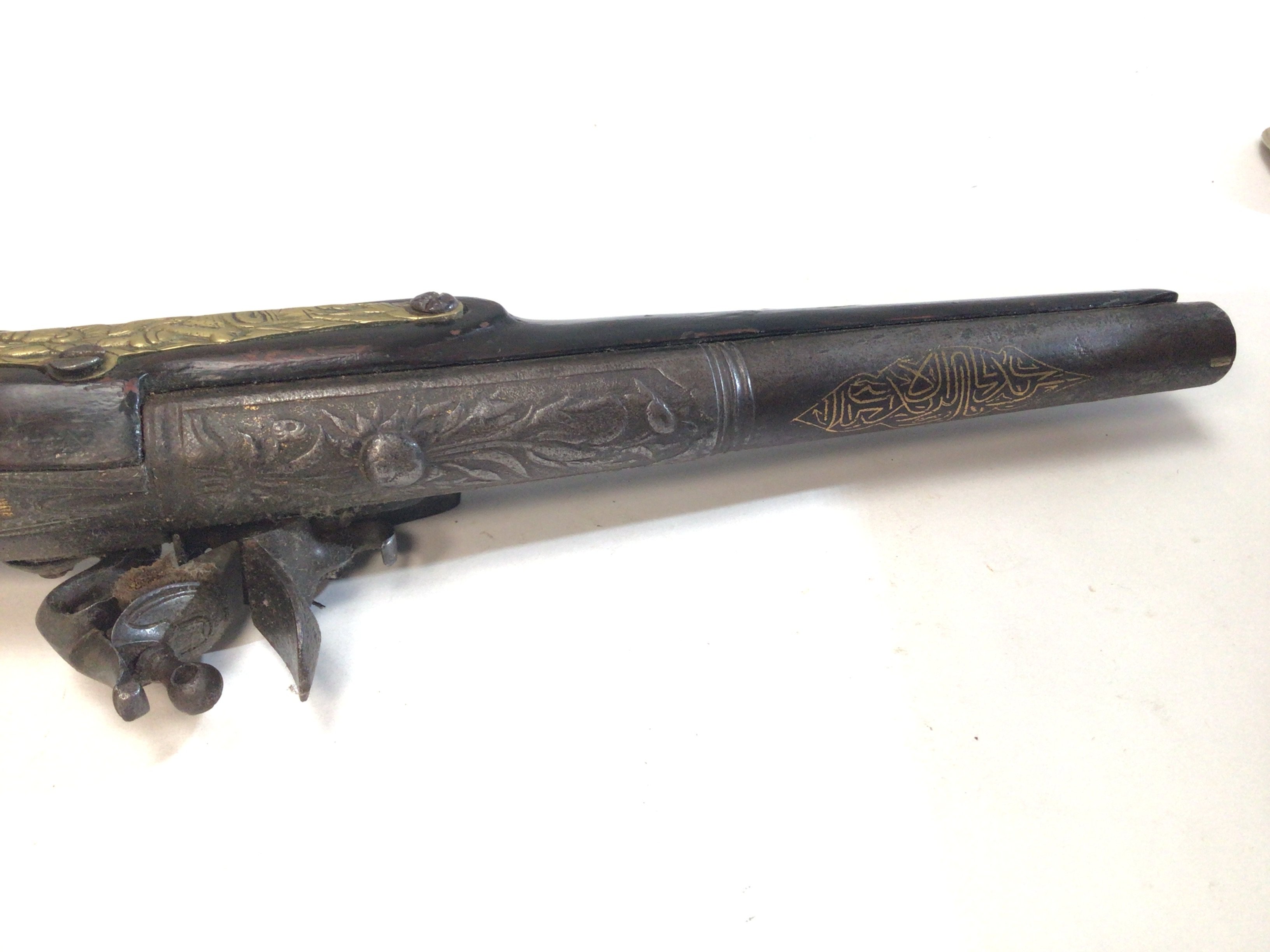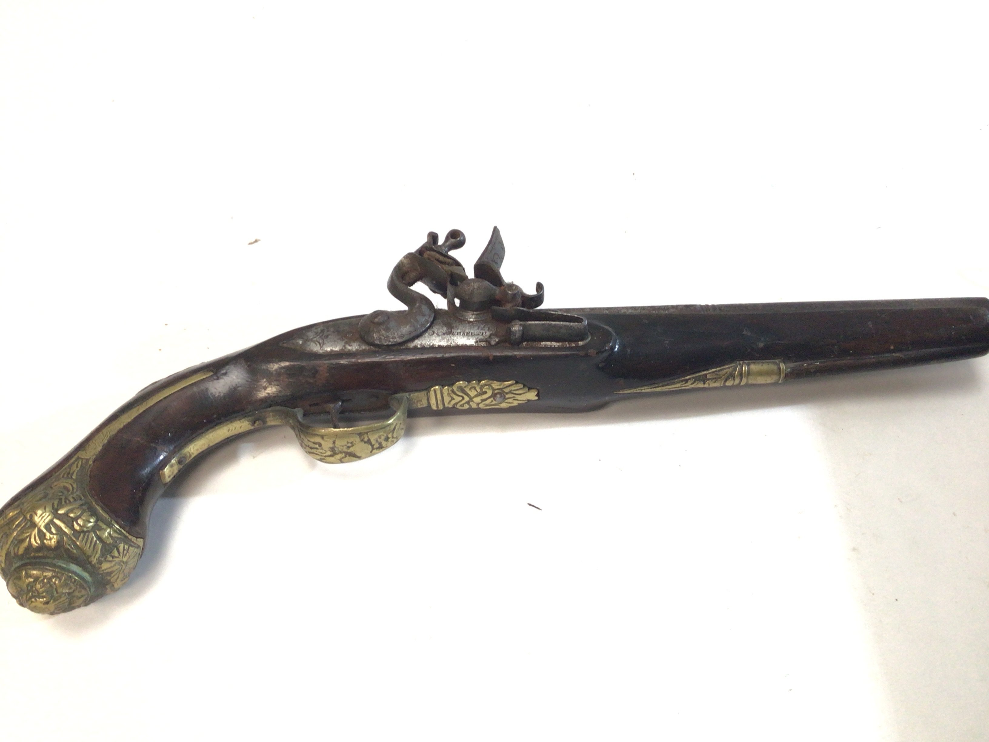 A French 18th century flintlock lock pistol maker Dumarest with brass mounts and ornamented cast barrel with applied gold decoration.