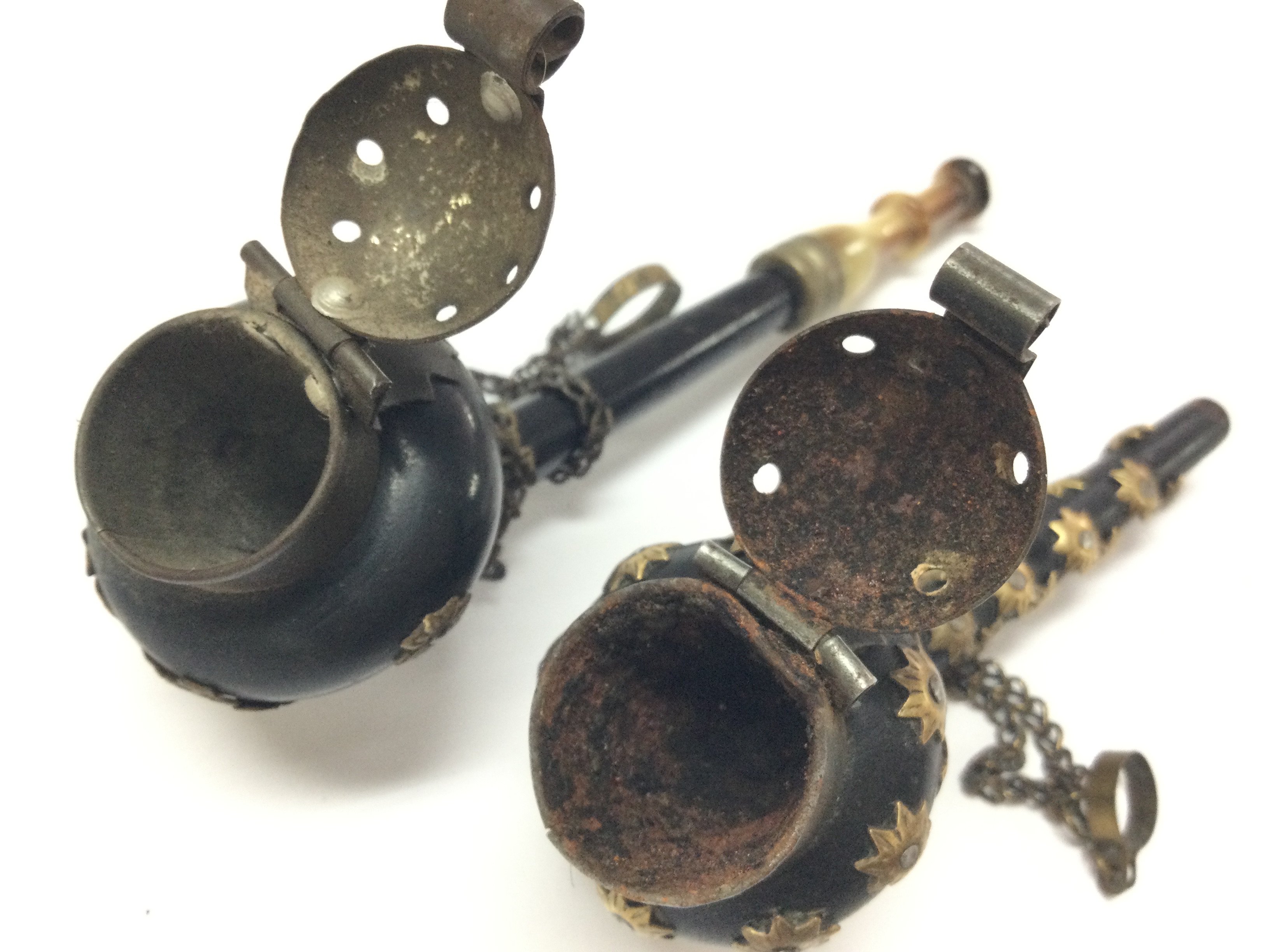 Two small Victorian smoking pipes, one decorated with brass stars and the other a small brass cow . 14 and 11cm long. Postage category A