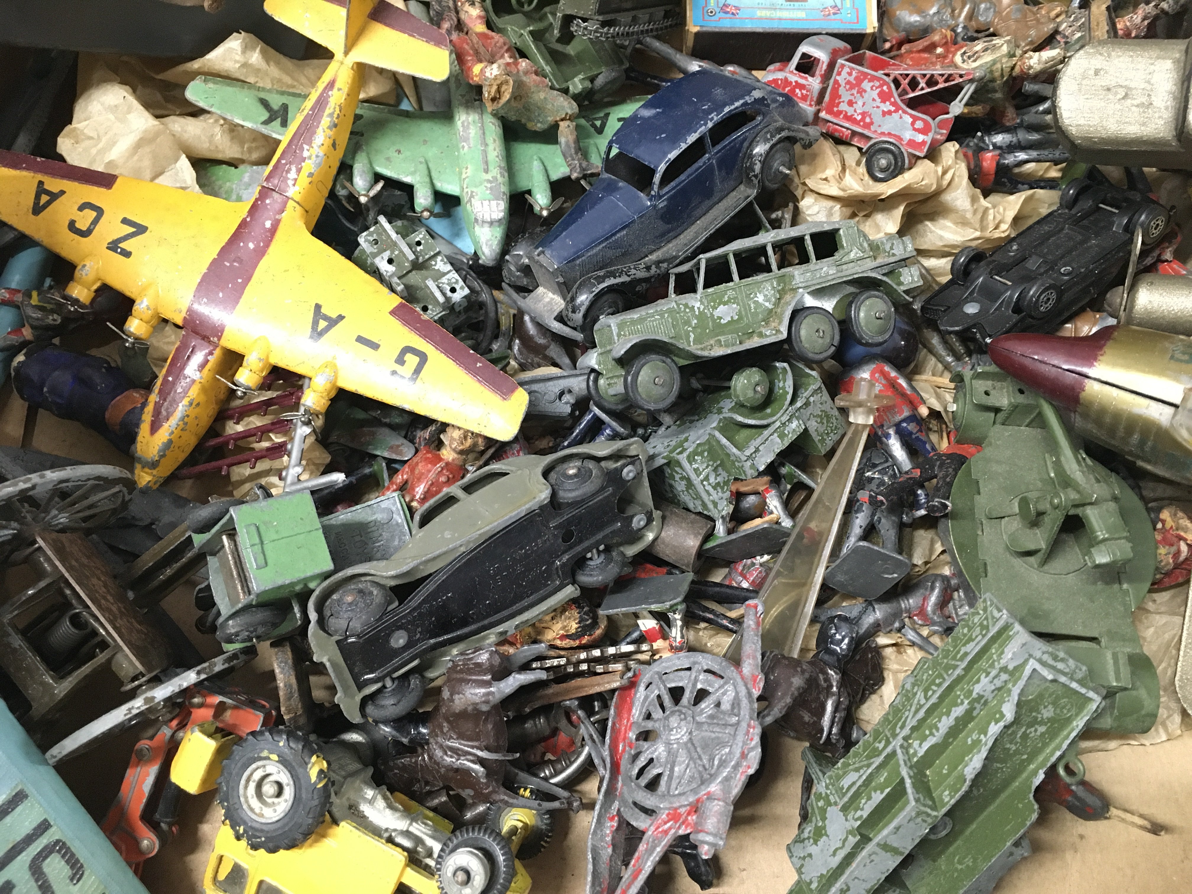 A Box Containing Playworn Toys Including Soldiers. And Aircraft. No Reserve.