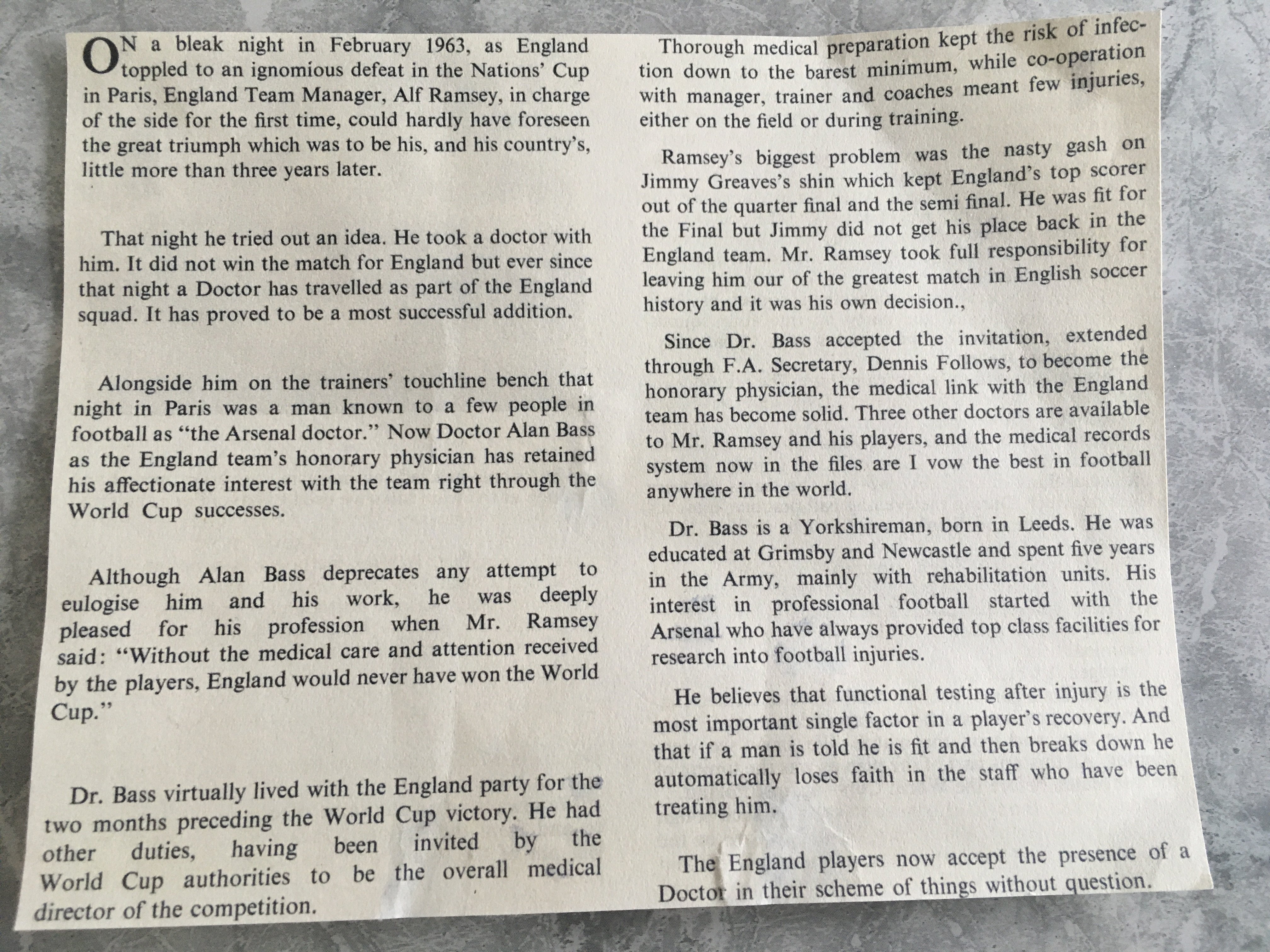 England 1966 World Cup Doctors Autograph: Very rare autograph of official doctor Alan Bass. Not many collectors will have this as they believe incorrectly that Neil Phillips was the official doctor. There is a famous photo of the trainers at the full time whistle with everyone looking excited except Ramsey and the person sitting next to him (Bass). Autograph is on a letter addressed to Alan Hardaker accepting to travel to Belgium in 1967 with England. Included is information on Bass claiming without him they would not have won the World Cup and the mentioned picture. Hard to obtain as he emigrated not long after.