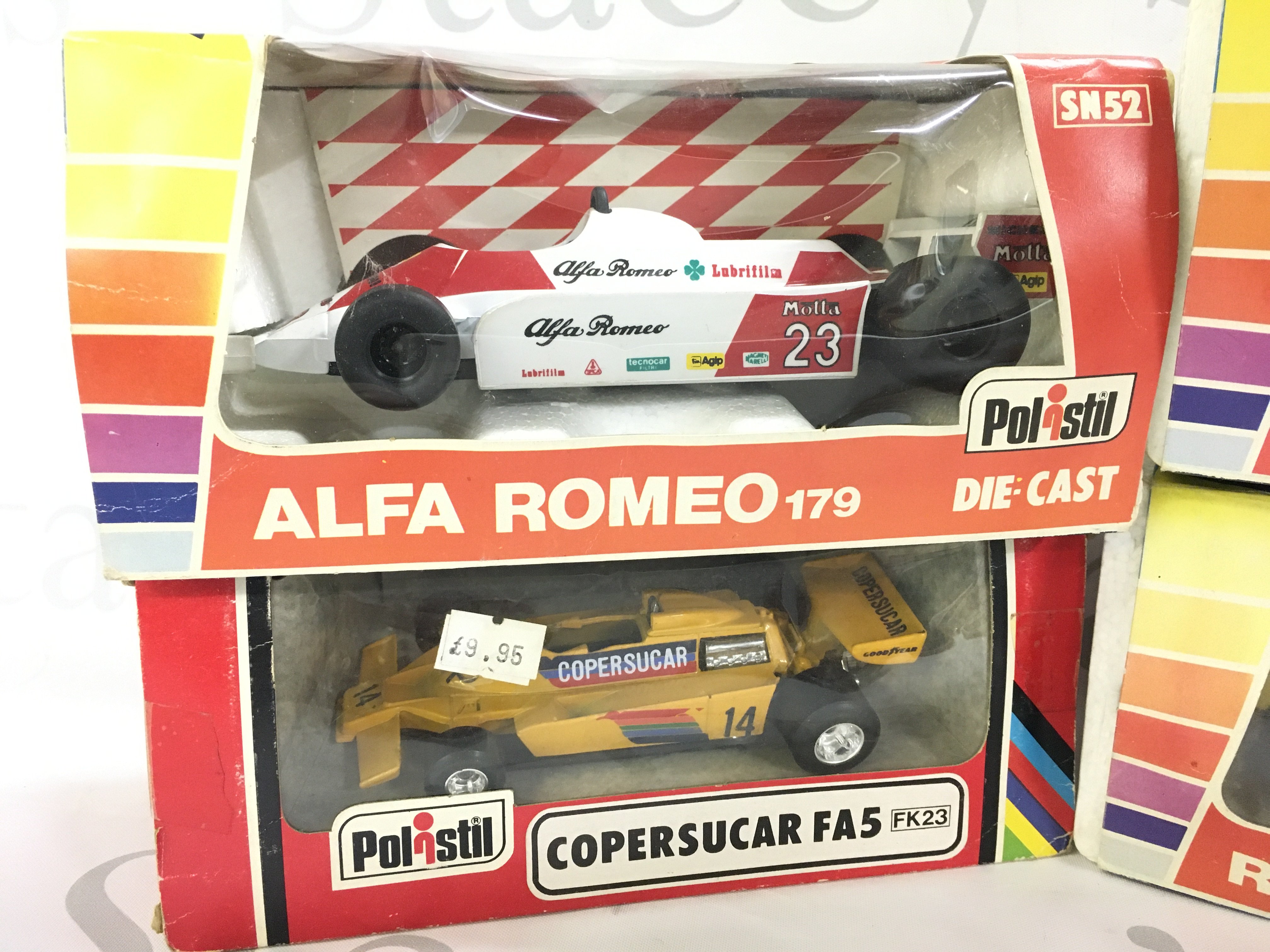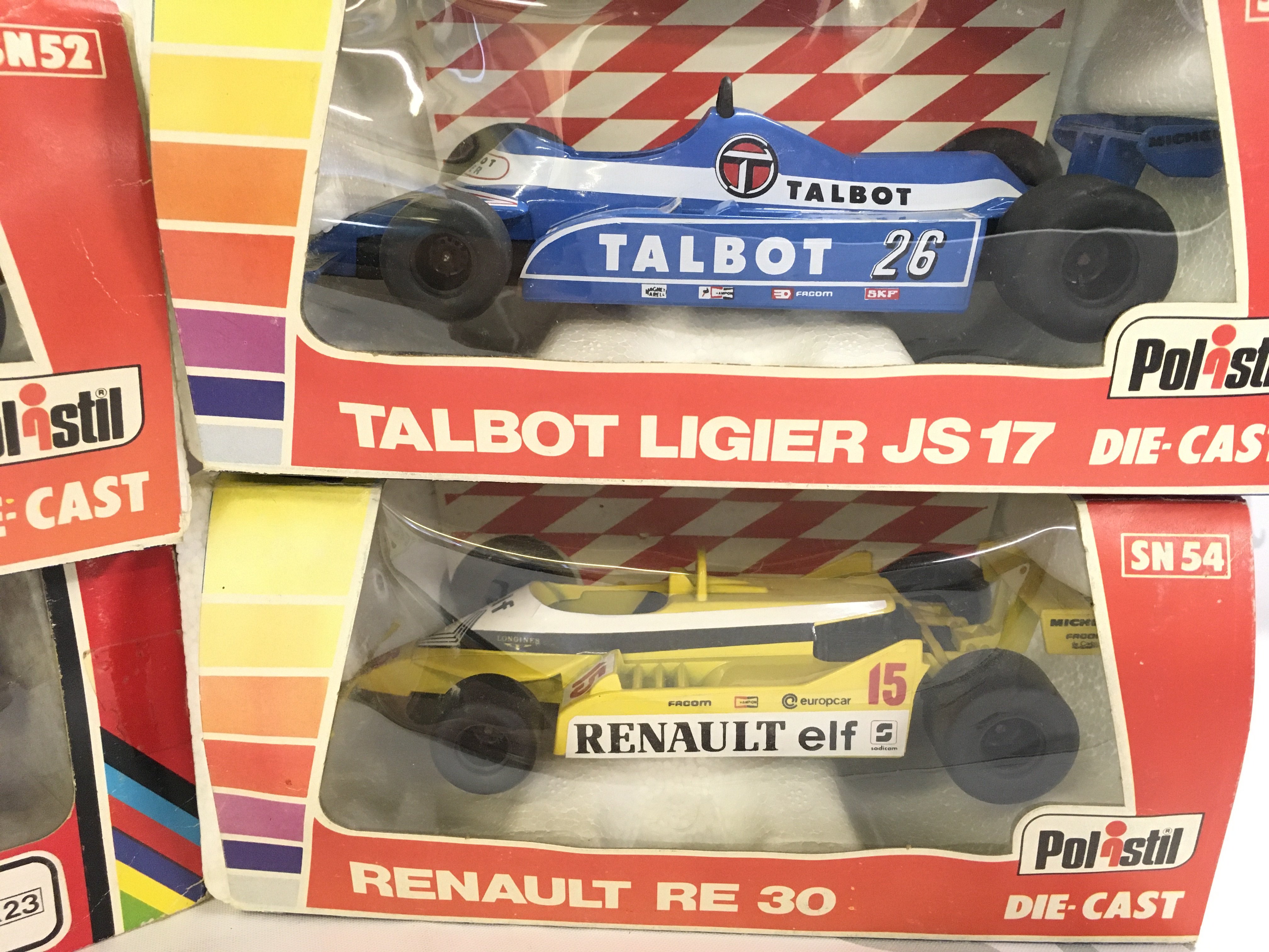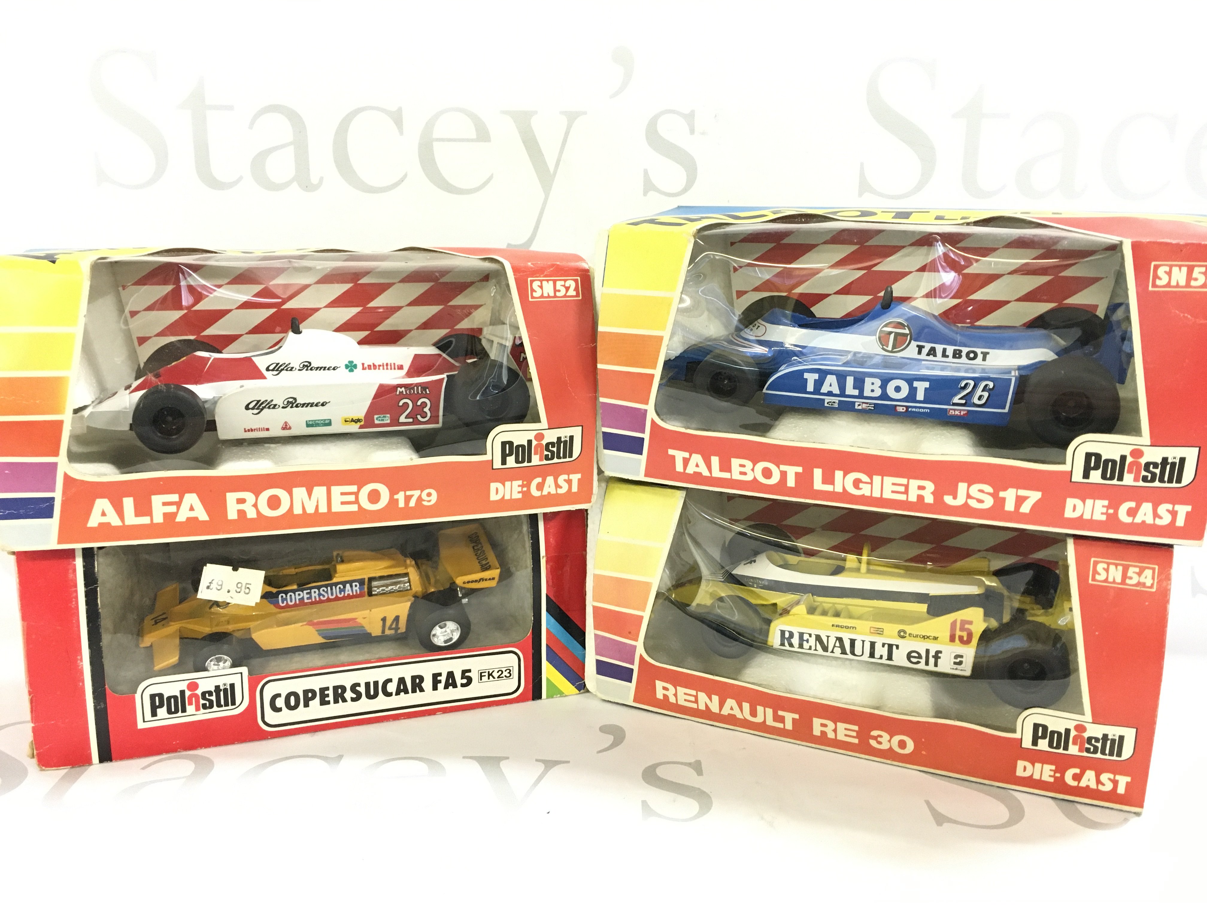 4 Boxed Polistil F1 Diecast Cars 1/22 Scale. An Alfa Romeo 179 A Talbot Ligier JD 17. A Copersucar FA5 And A Renault RE 30.