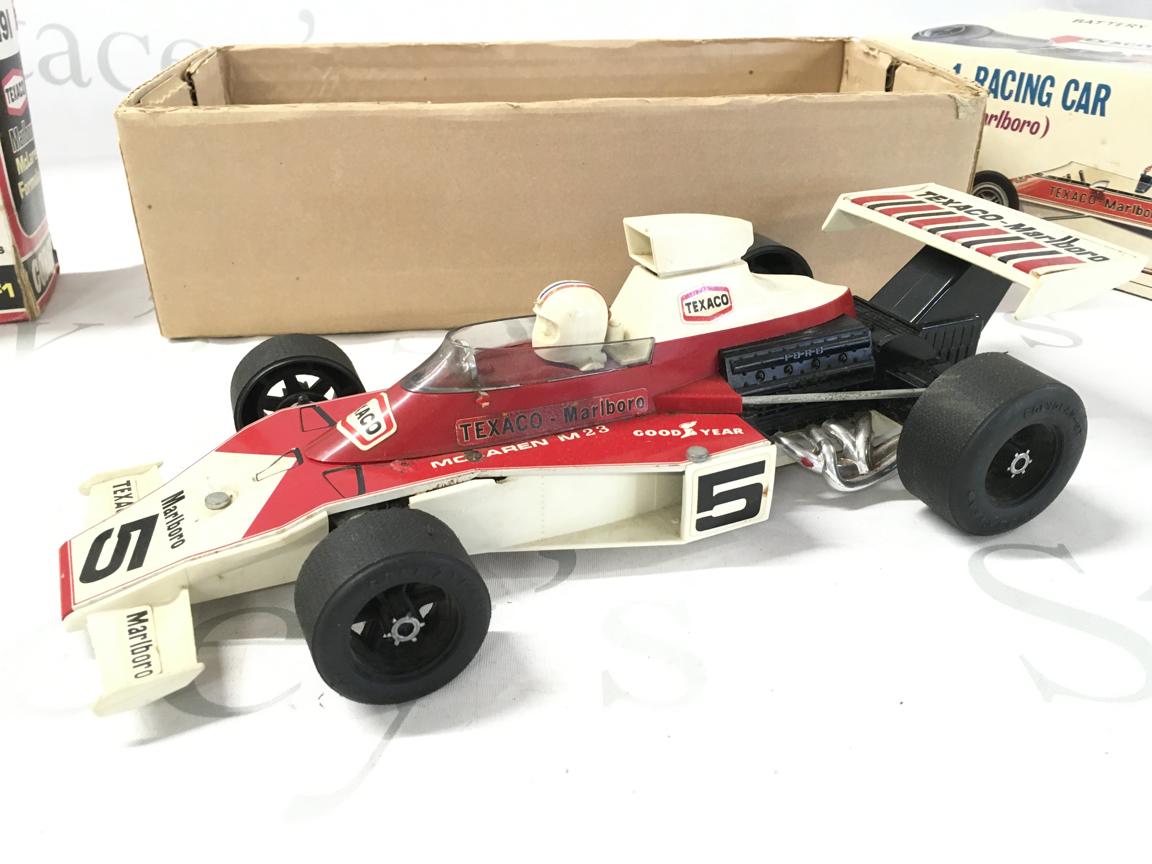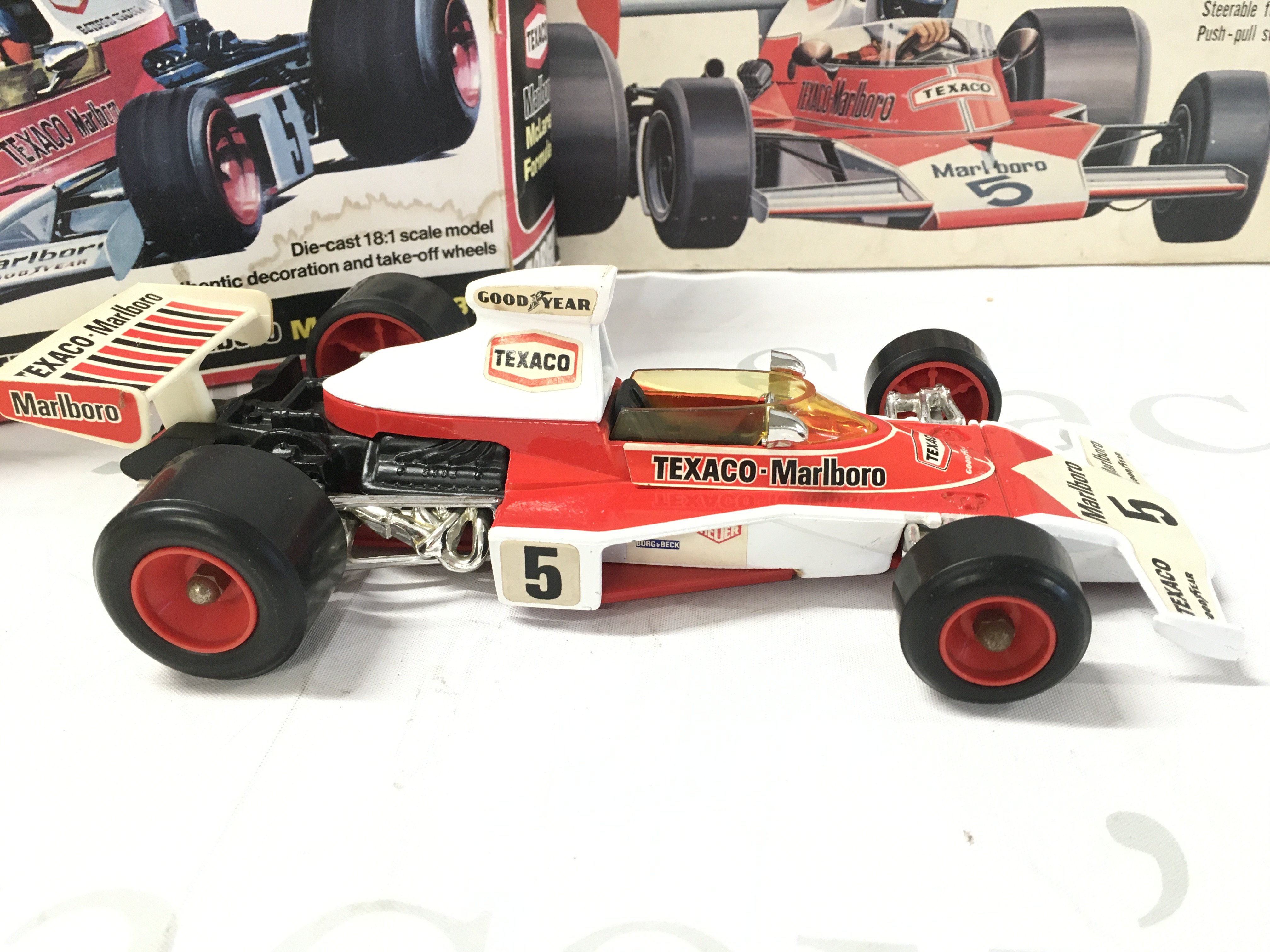 A Vintage Alps Japanese Battery Powered Formula 1 Smoking Race Car. And A Corgi Texaco-Marlboro McLaren M23F1 #191.
