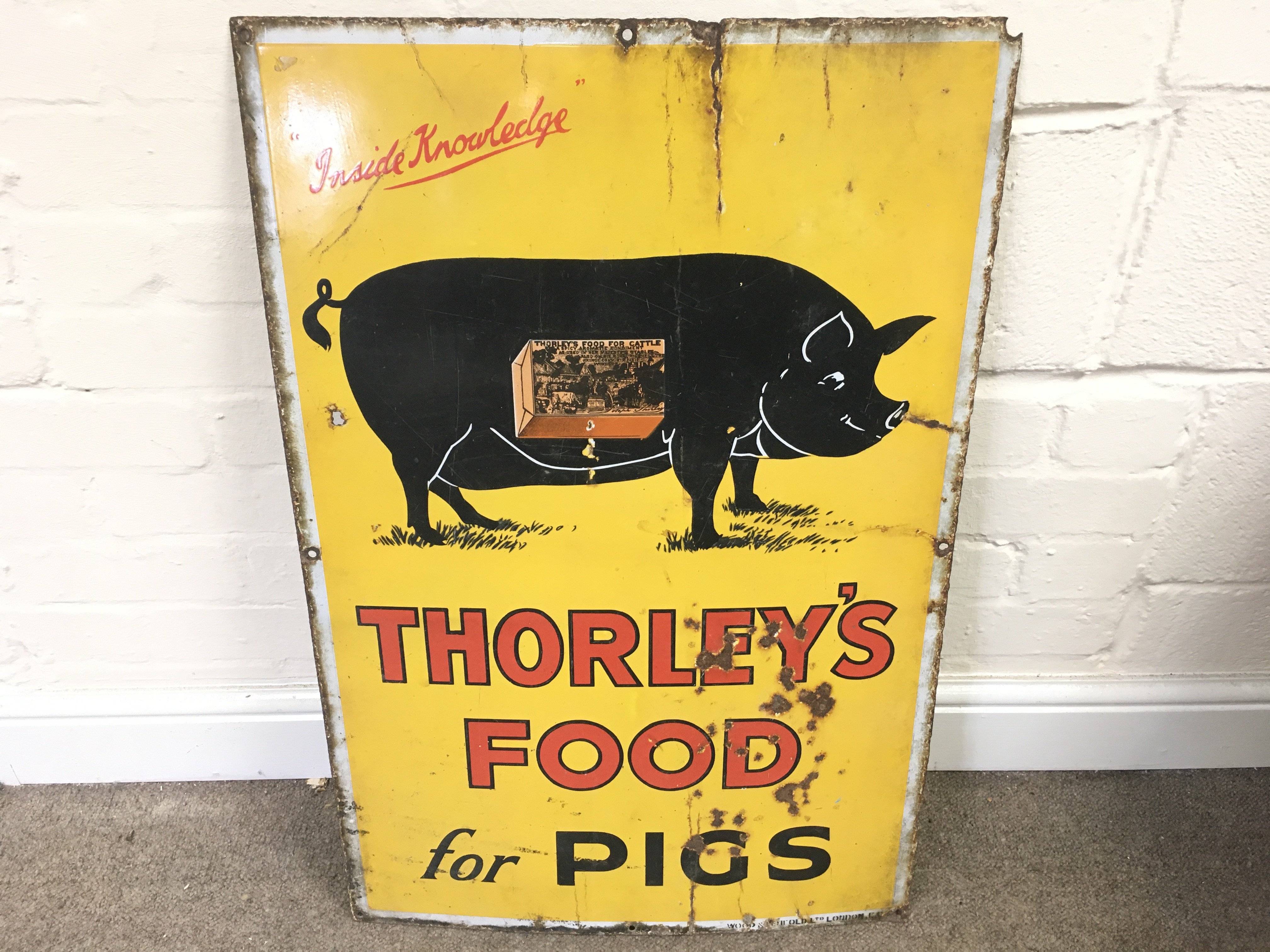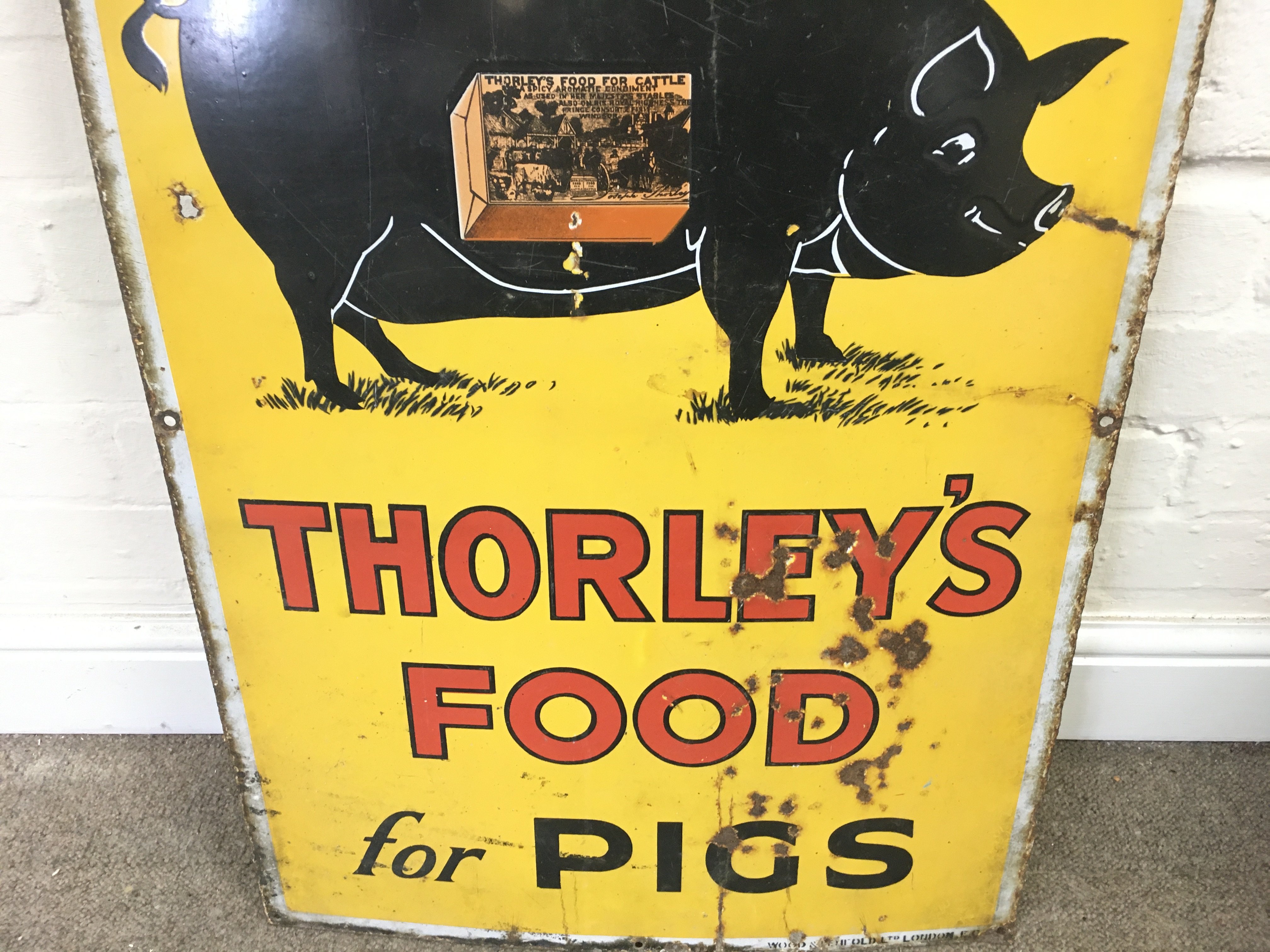 ENAMEL ADVERTISING SIGN "THORLEY'S FOOD FOR PIGS" 20 x 30 inches approximately