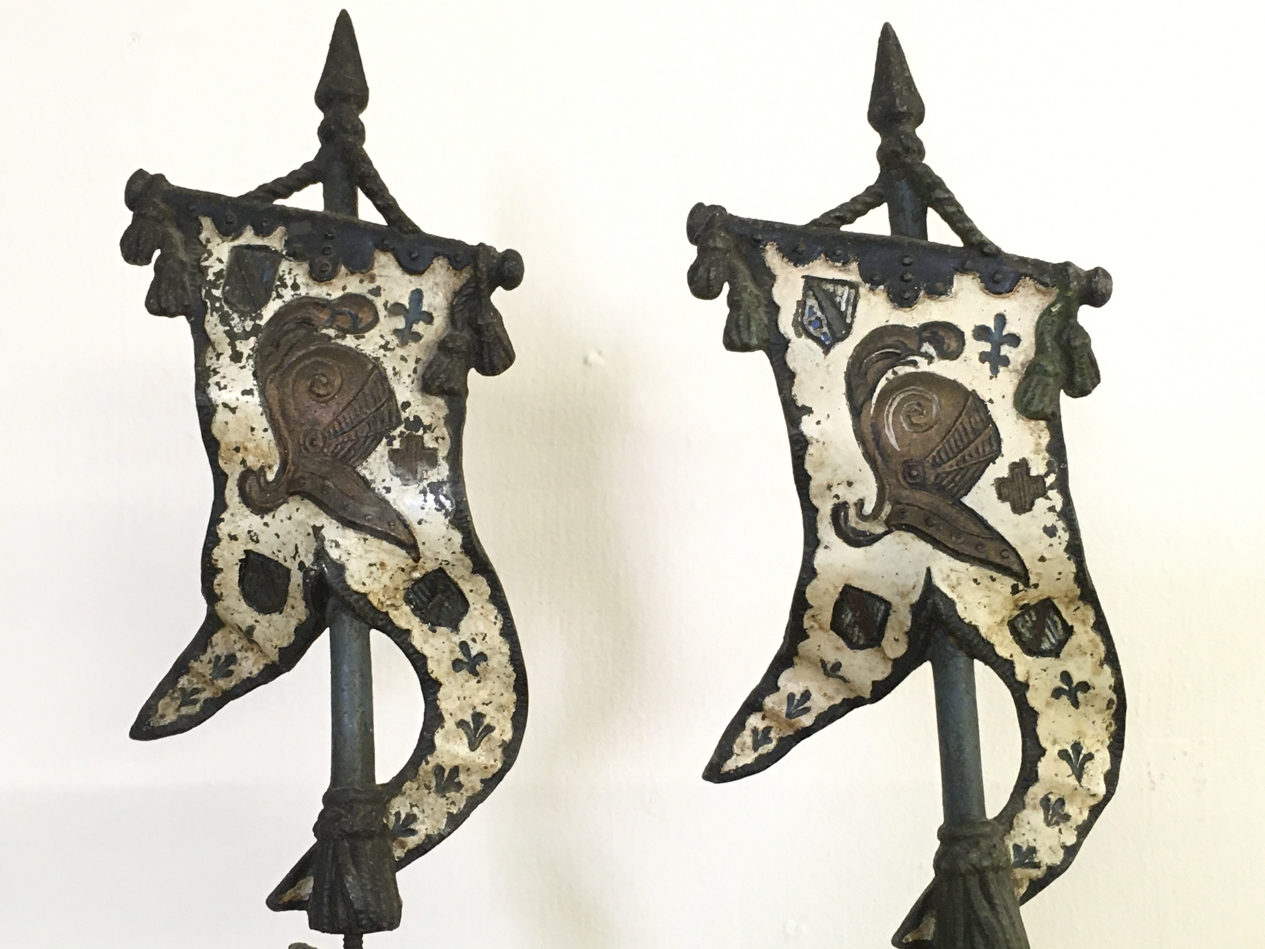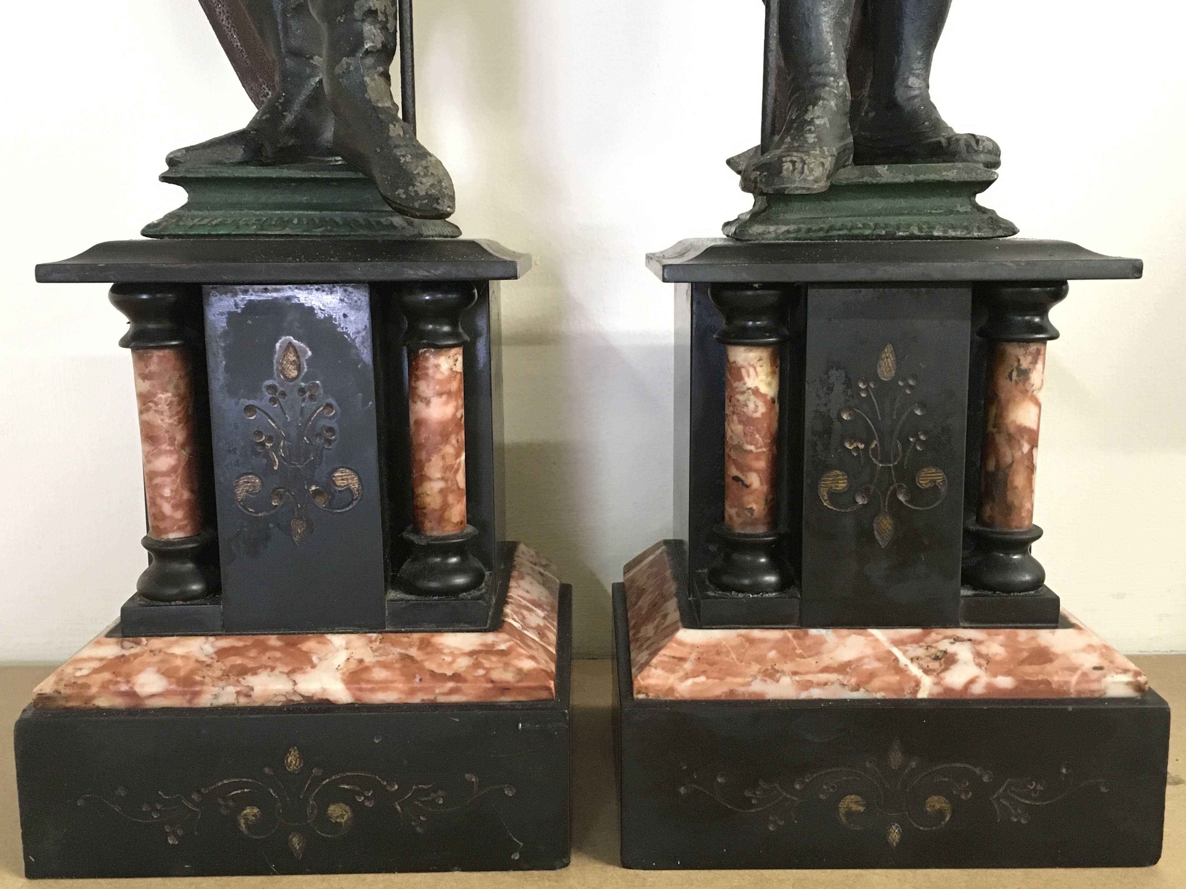 Two palace guards by A.P.S 1897 Painted spelter figures on marble and slate bases. 70cm tall