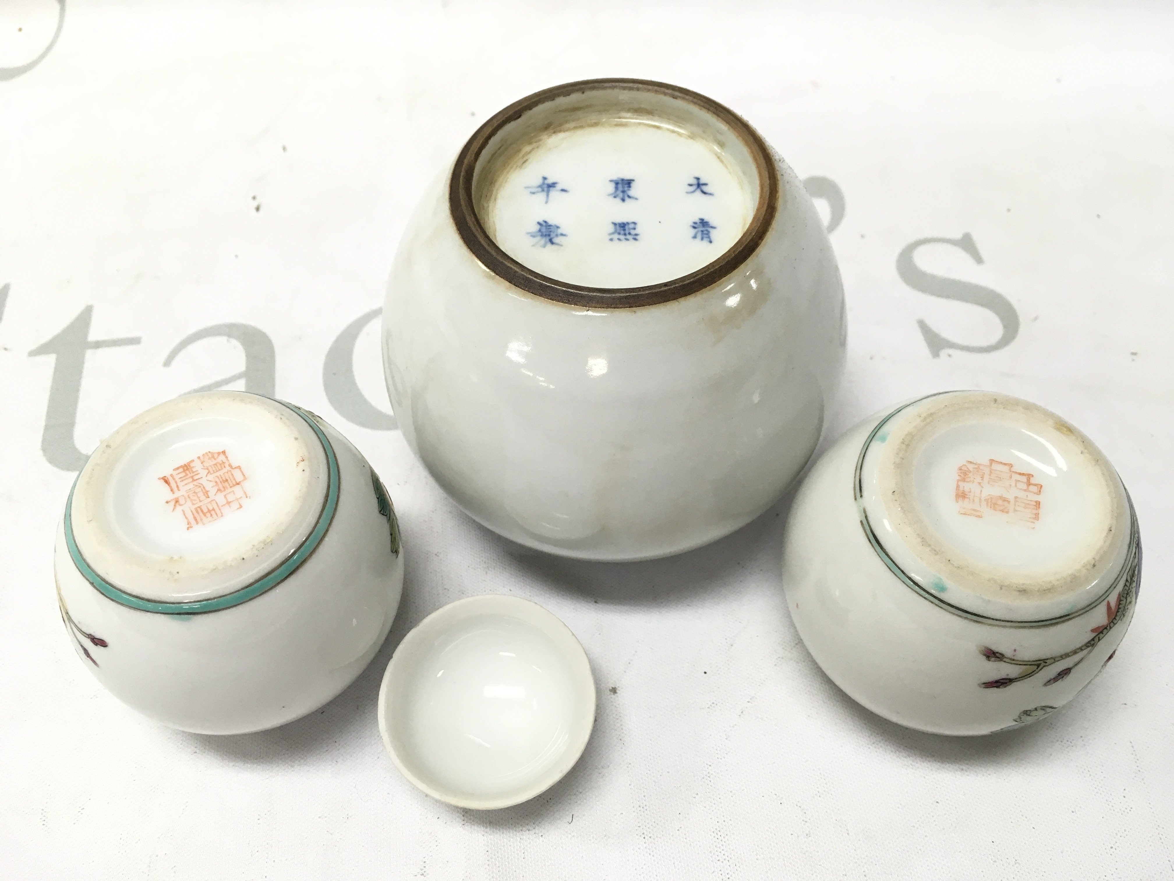 Three small Chinese jars including a pair of Famille rose jars (6cm tall 6cm wide), largest vase with a six character mark at base (8cm tall 9cm wide). This lot cannot be posted