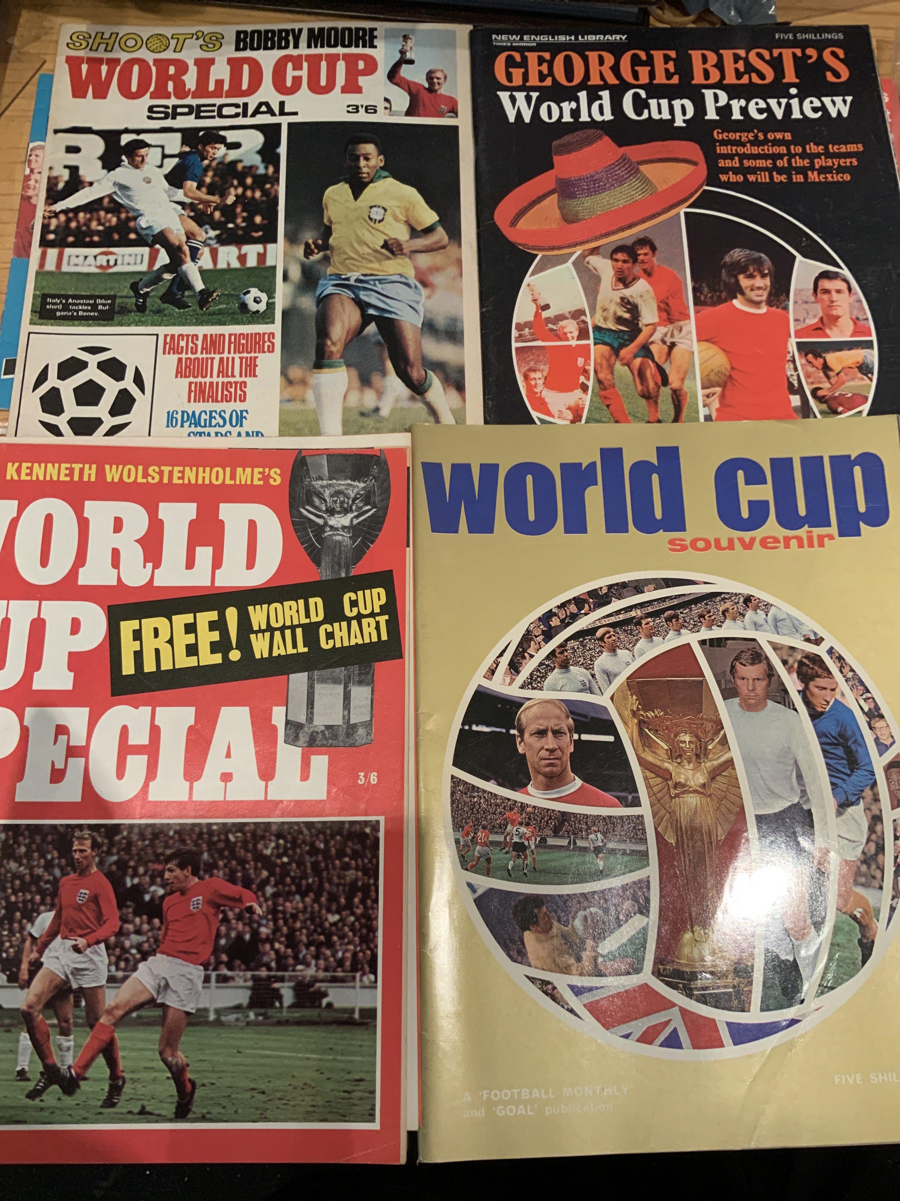 1966 + 1970 World Cup Football Memorabilia: From 1966 Shredded Wheat puzzle in original envelope, tournament brochure, Hornets World Cup scorebook and Wizard World Cup booklet. C/W from 1970 World Cup two programmes, Wolstenholmes wallchart and other guide books from Moore Best and others plus the England squad record.
