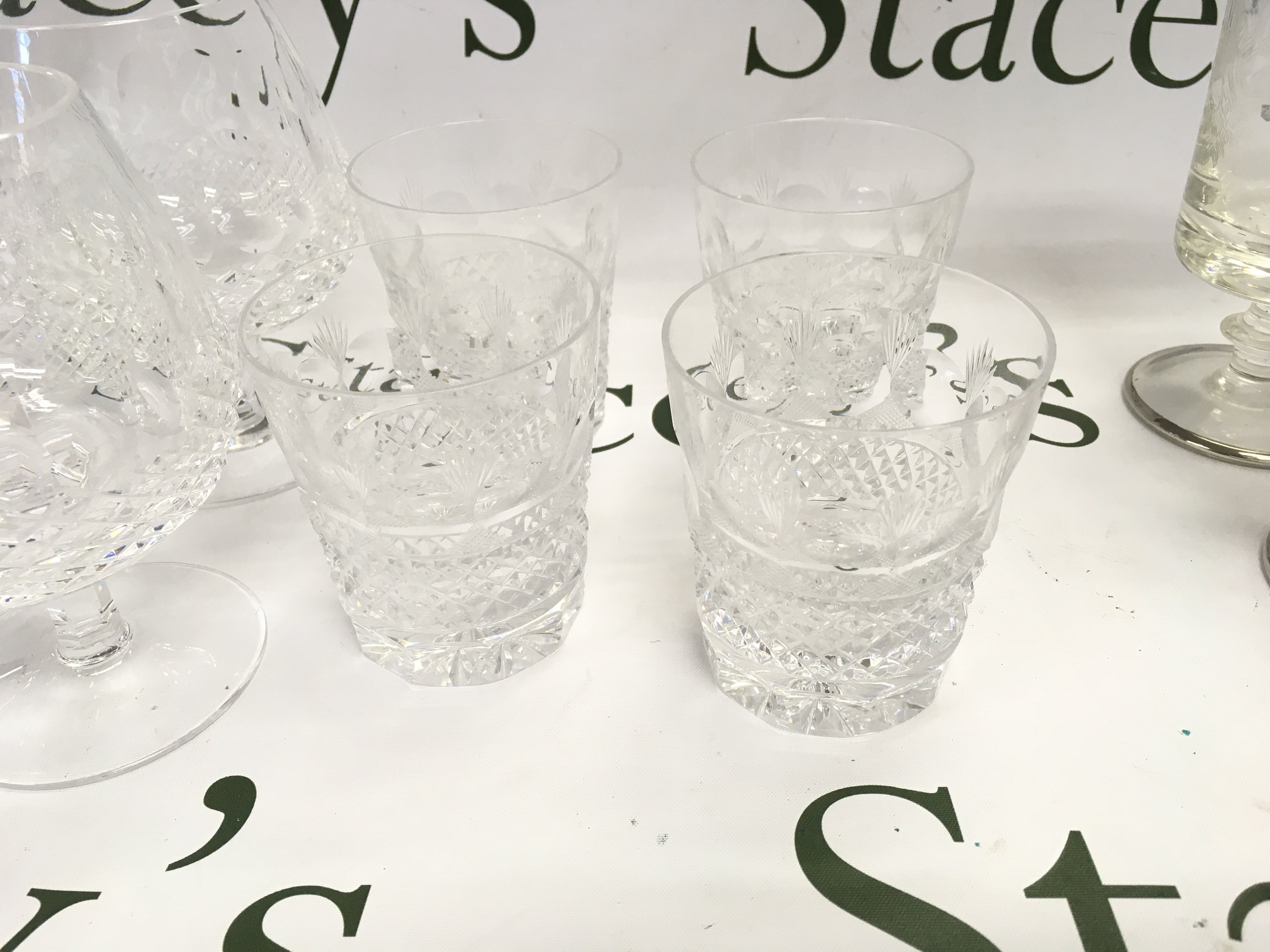 A collection of assorted glasses including 8 Waterford crystal glasses. Postage D
