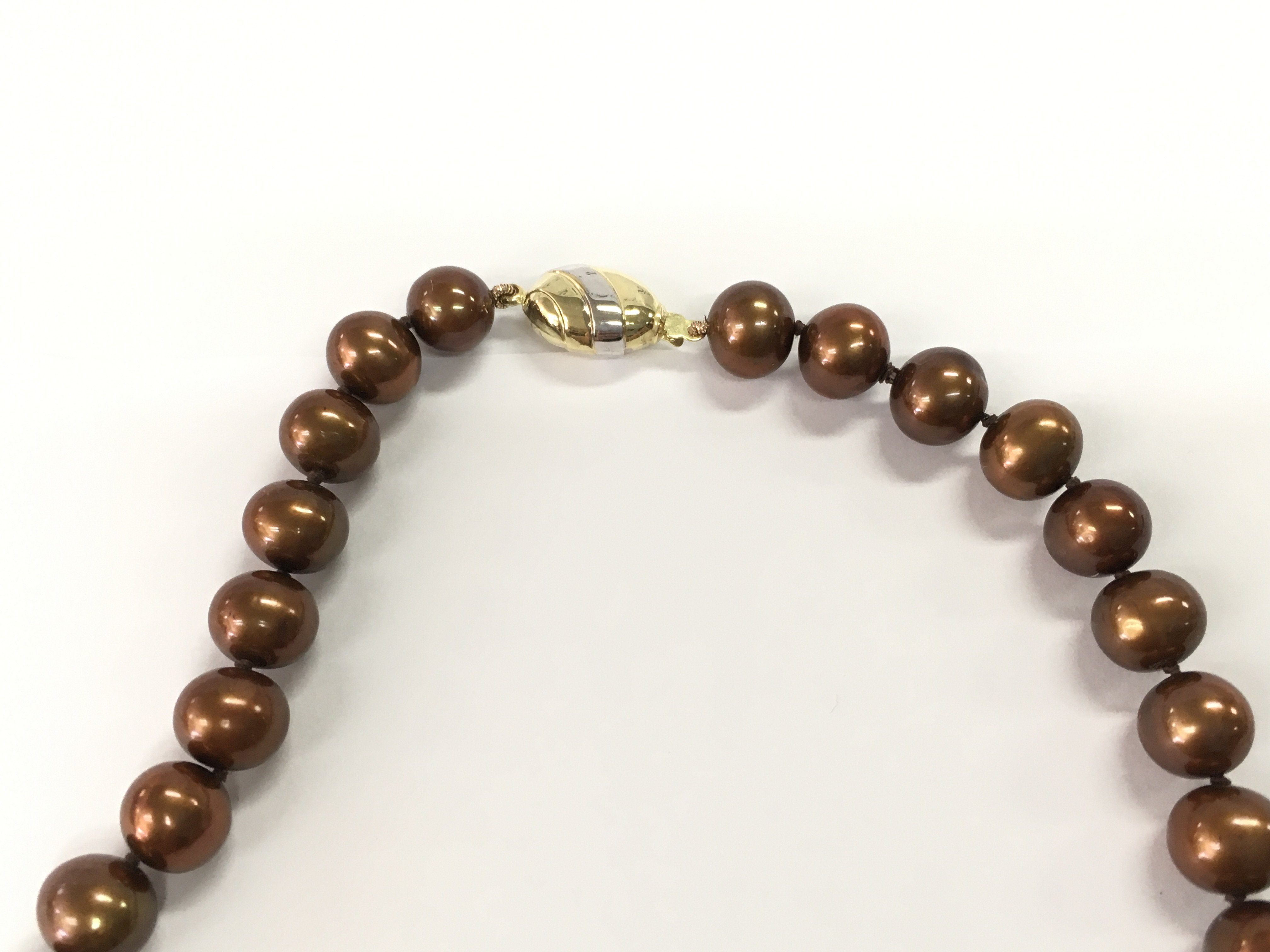 Necklace strung with cocoa cultured pearls fitted with a 9ct yellow and white gold clasp.