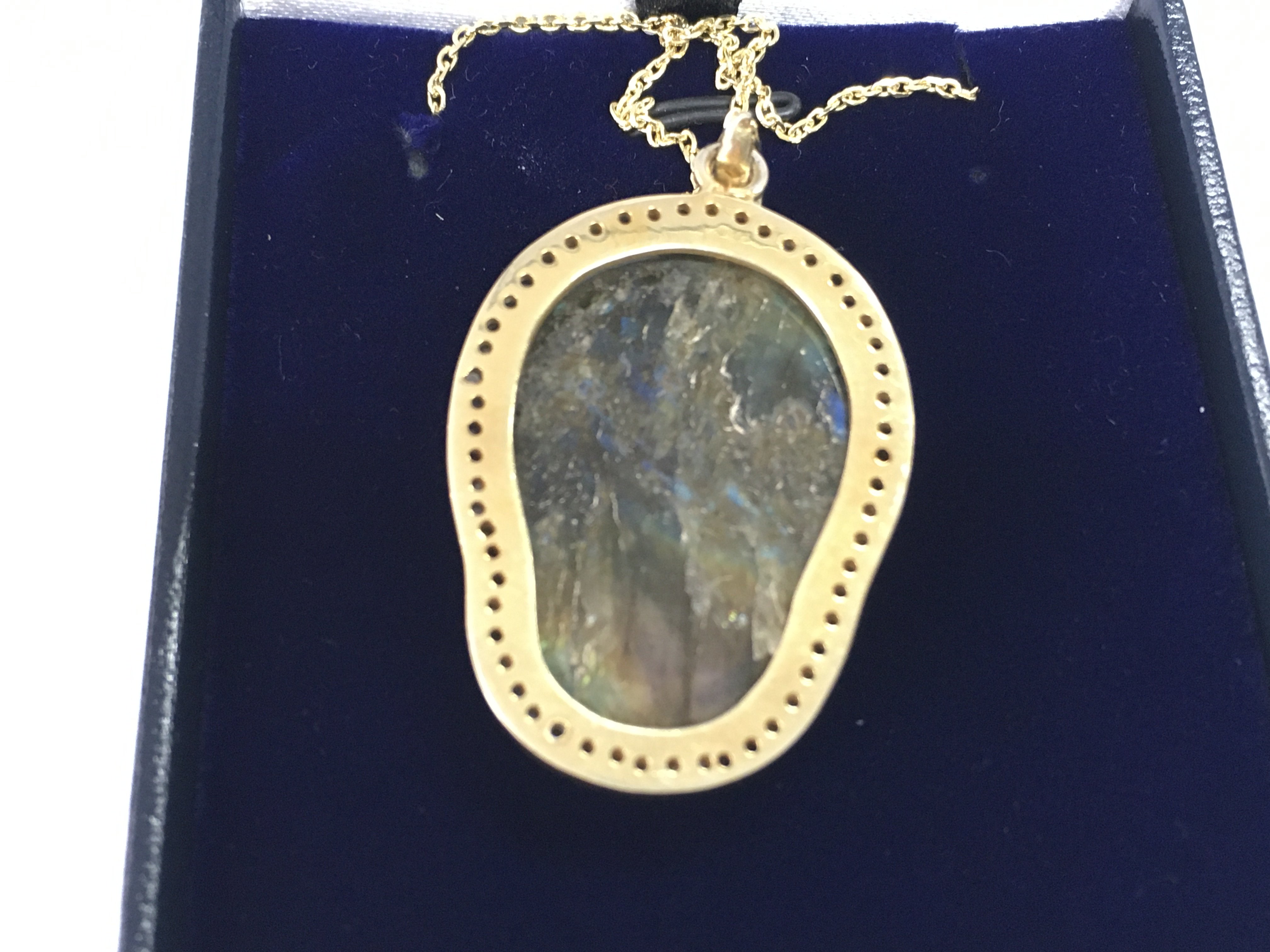 A large skull pendant in yellow metal with rose cut diamond set into a carved labradorite on a gold plated silver chain. Labradorite 37.55 and diamonds 0.81ct. Postage B