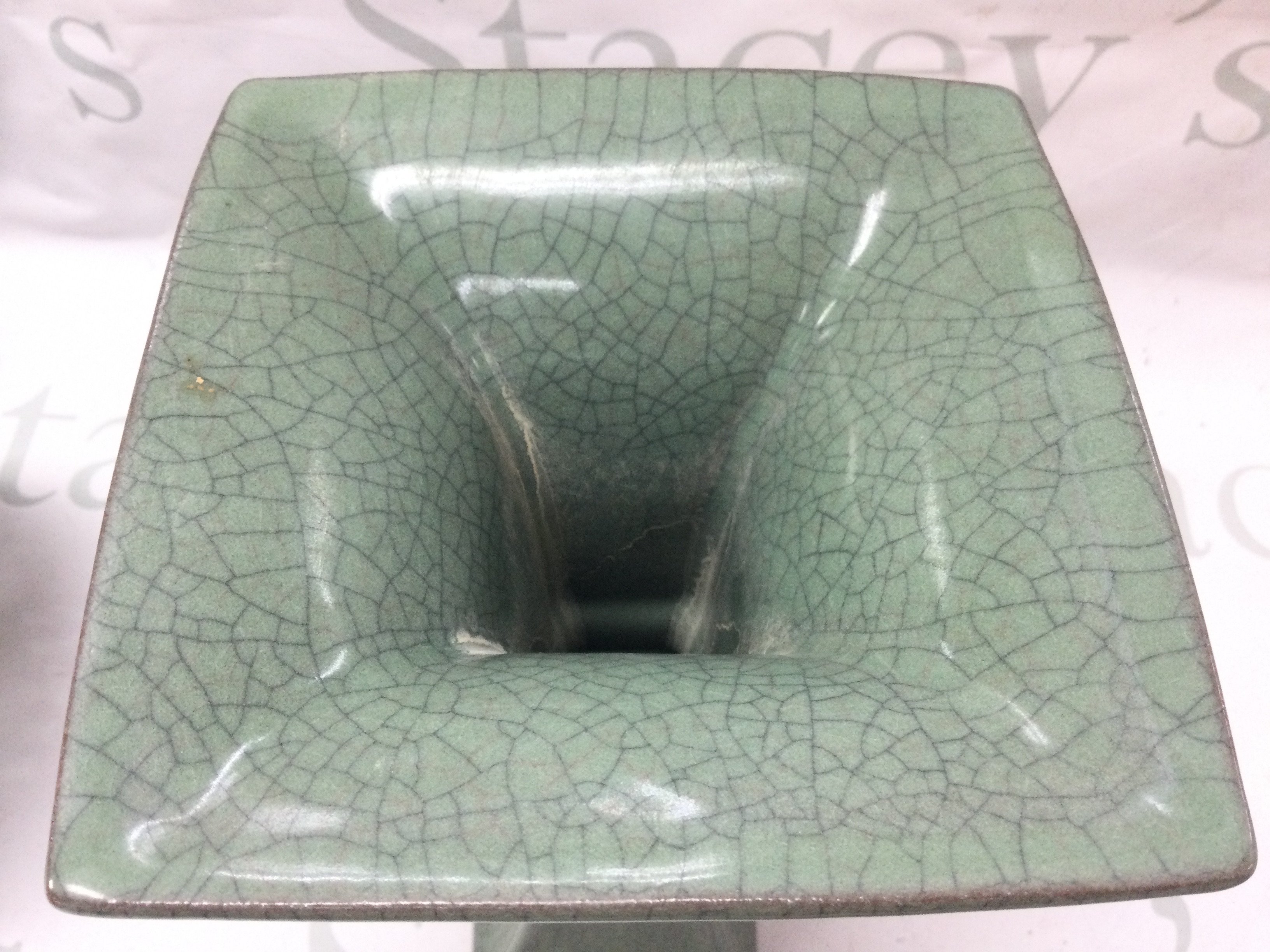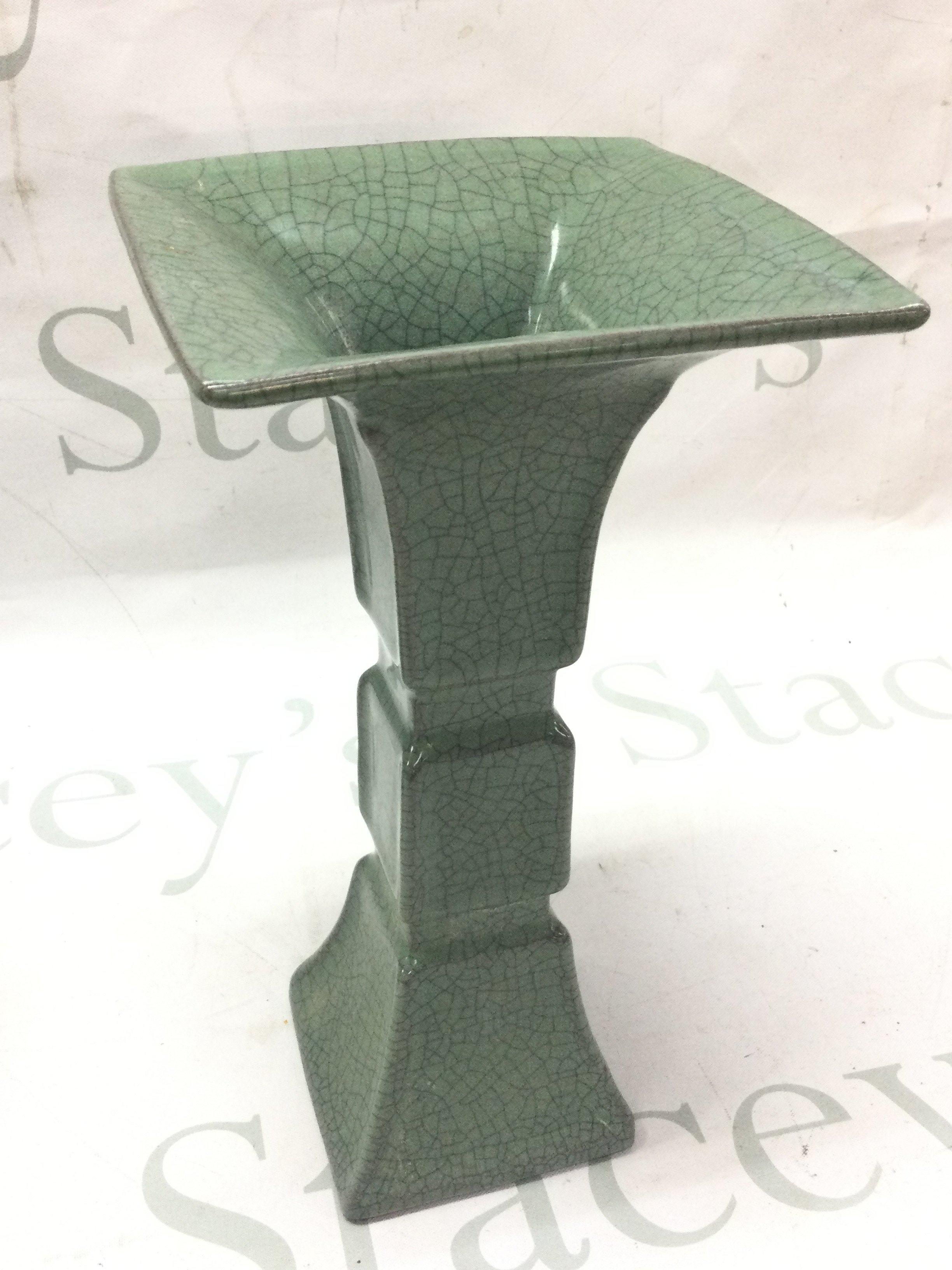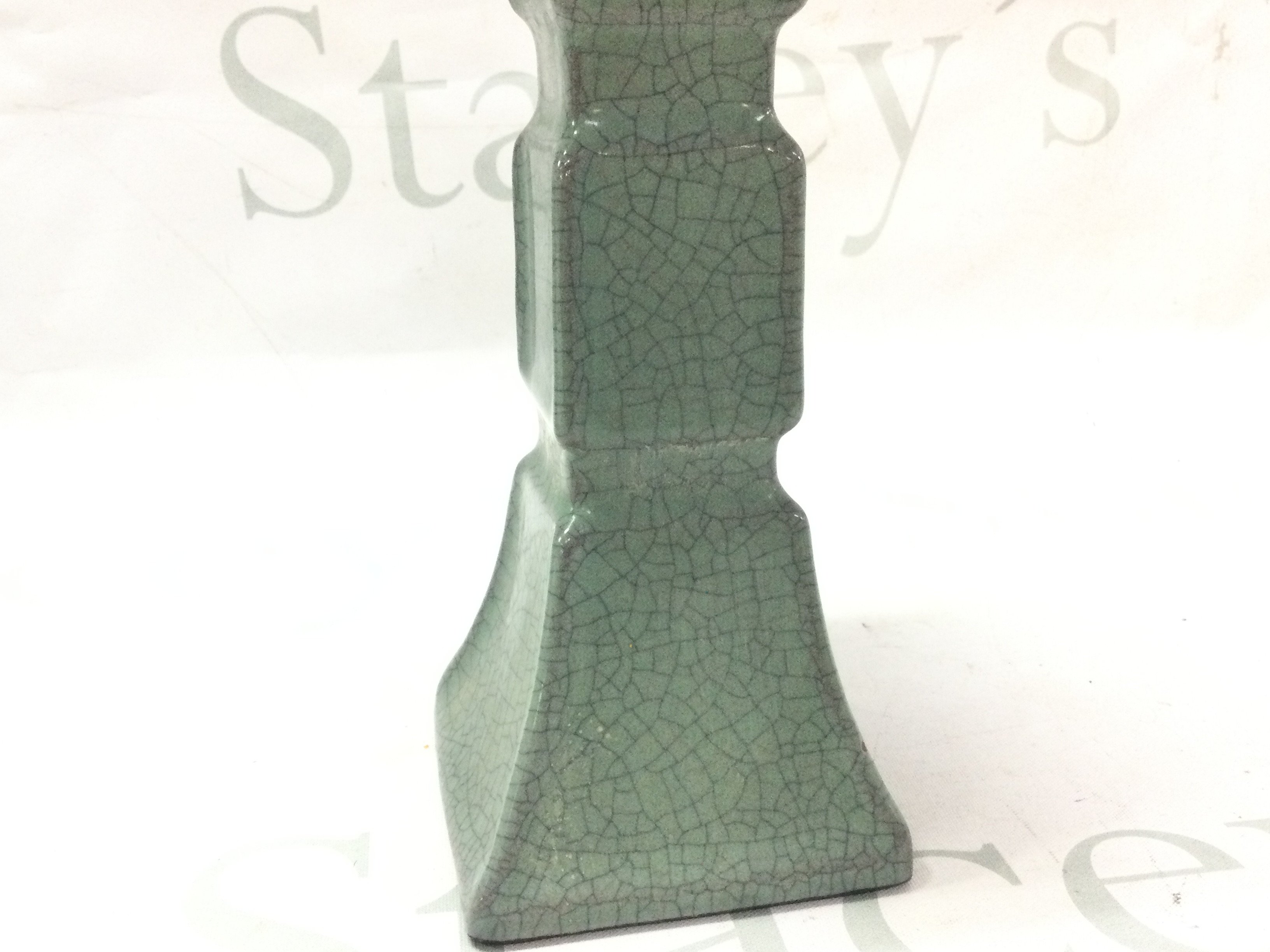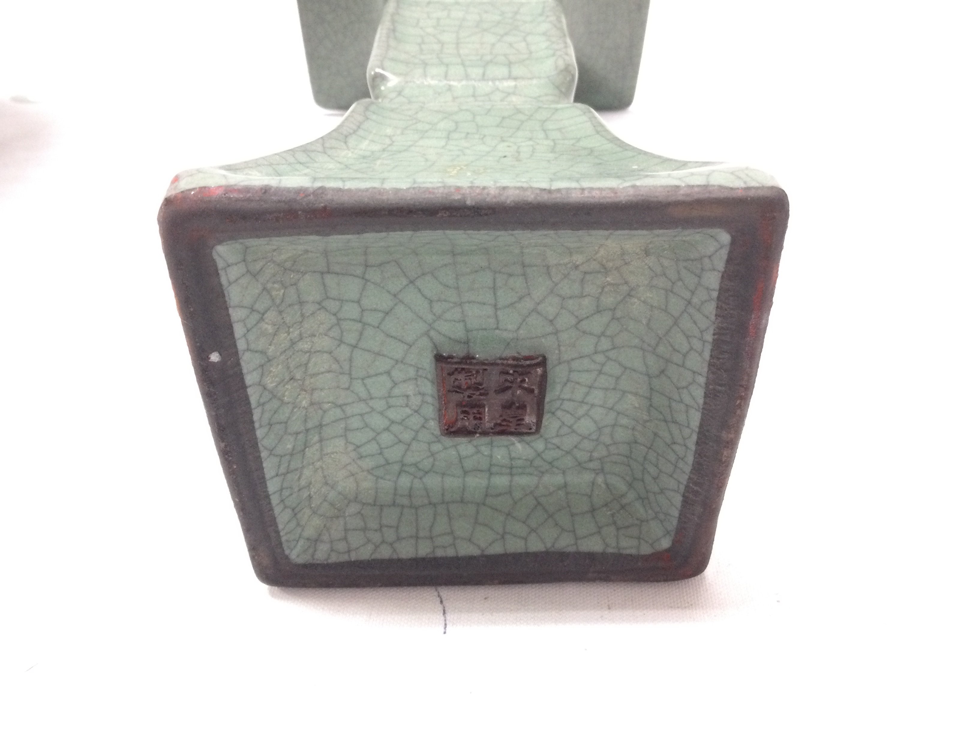 Green Chinese Gu vase with a four character stamp on base. 23cm tall. This lot cannot be posted