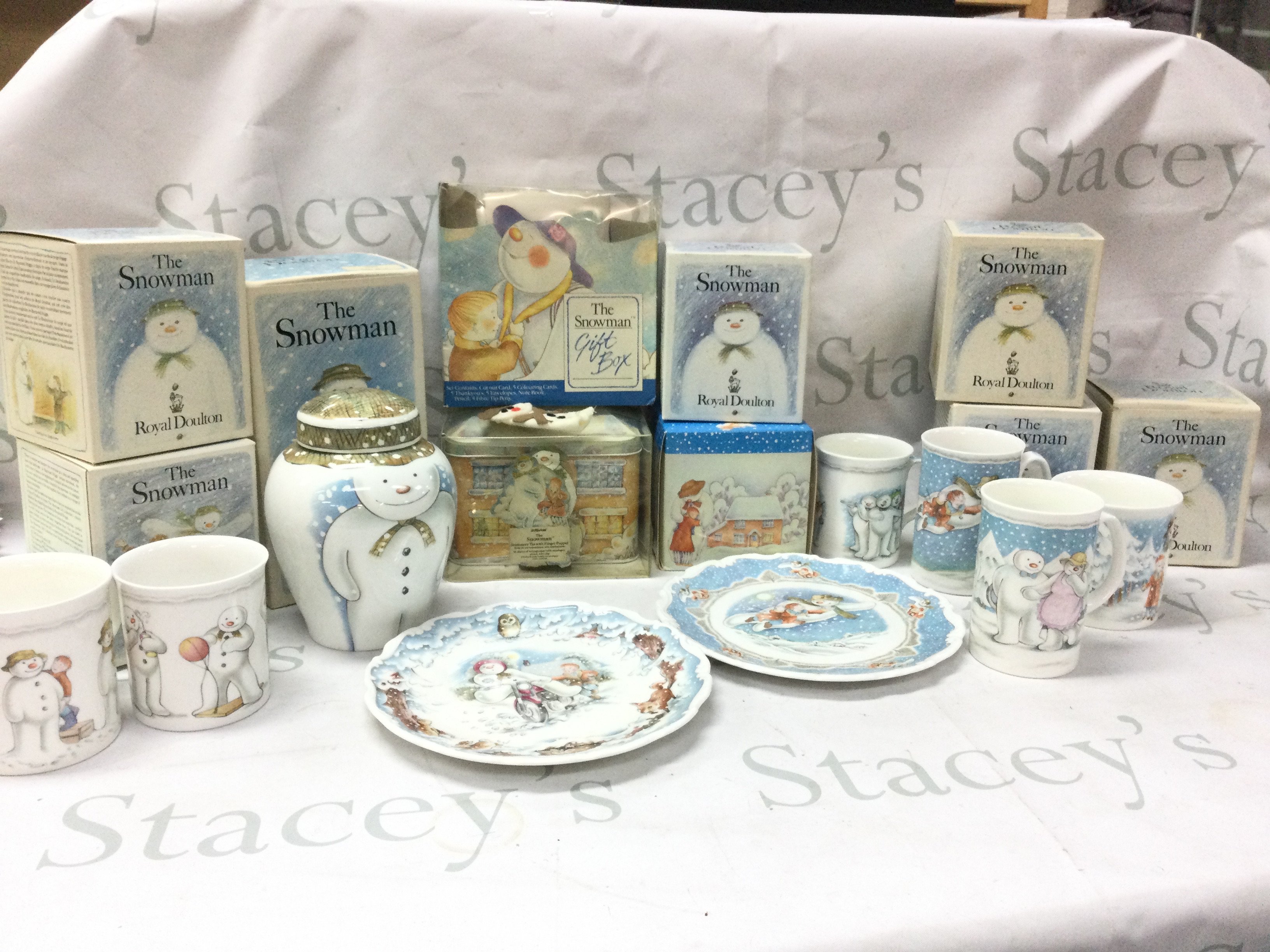 Royal Doulton snowman collection including boxed mugs, ginger jar, plates and other snowman items.this lot cannot be posted
