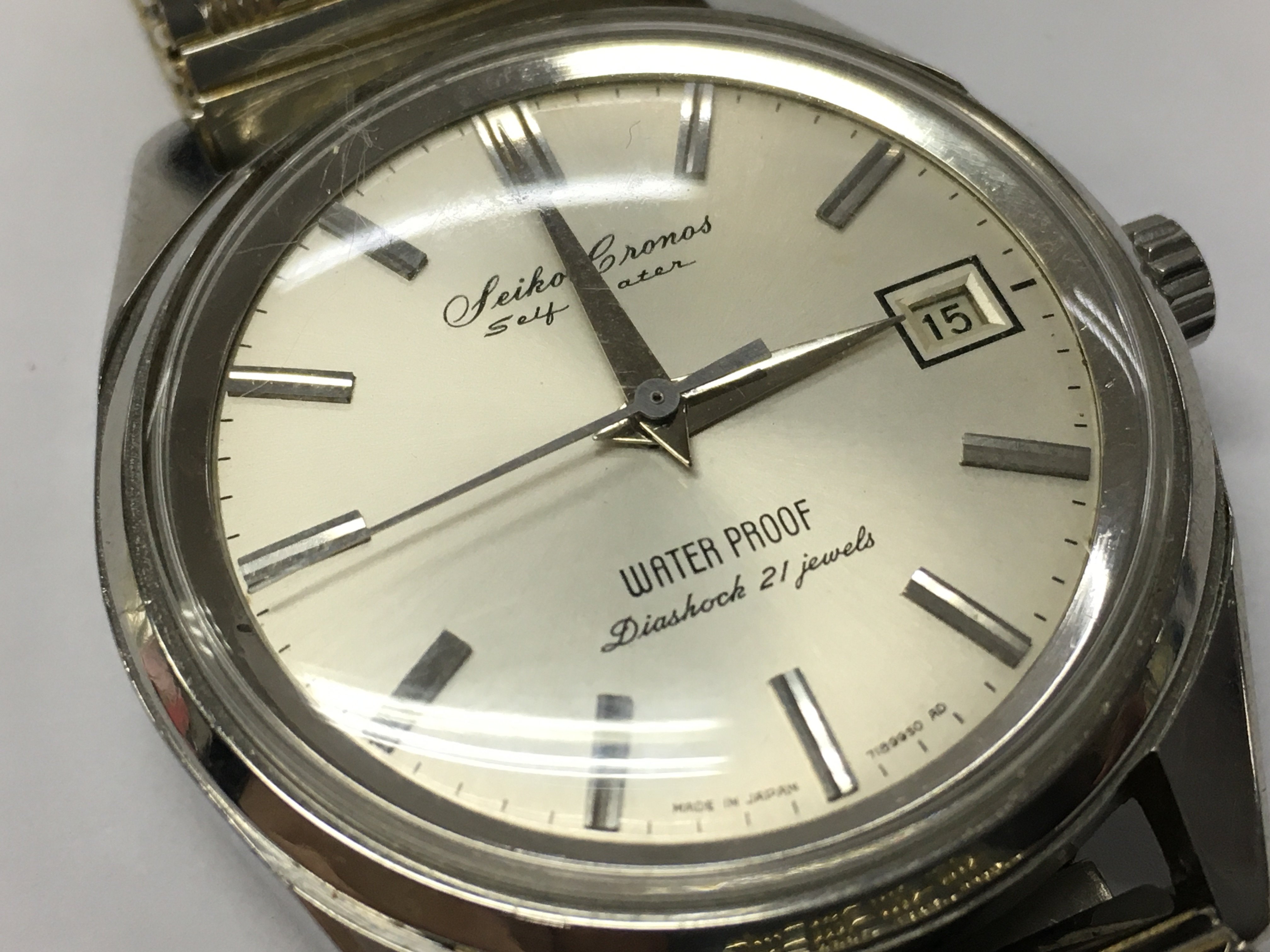 A Seiko Cronos self dated waterproof diashock 21 jewel movement and expanding bracelet (working). Postage category A