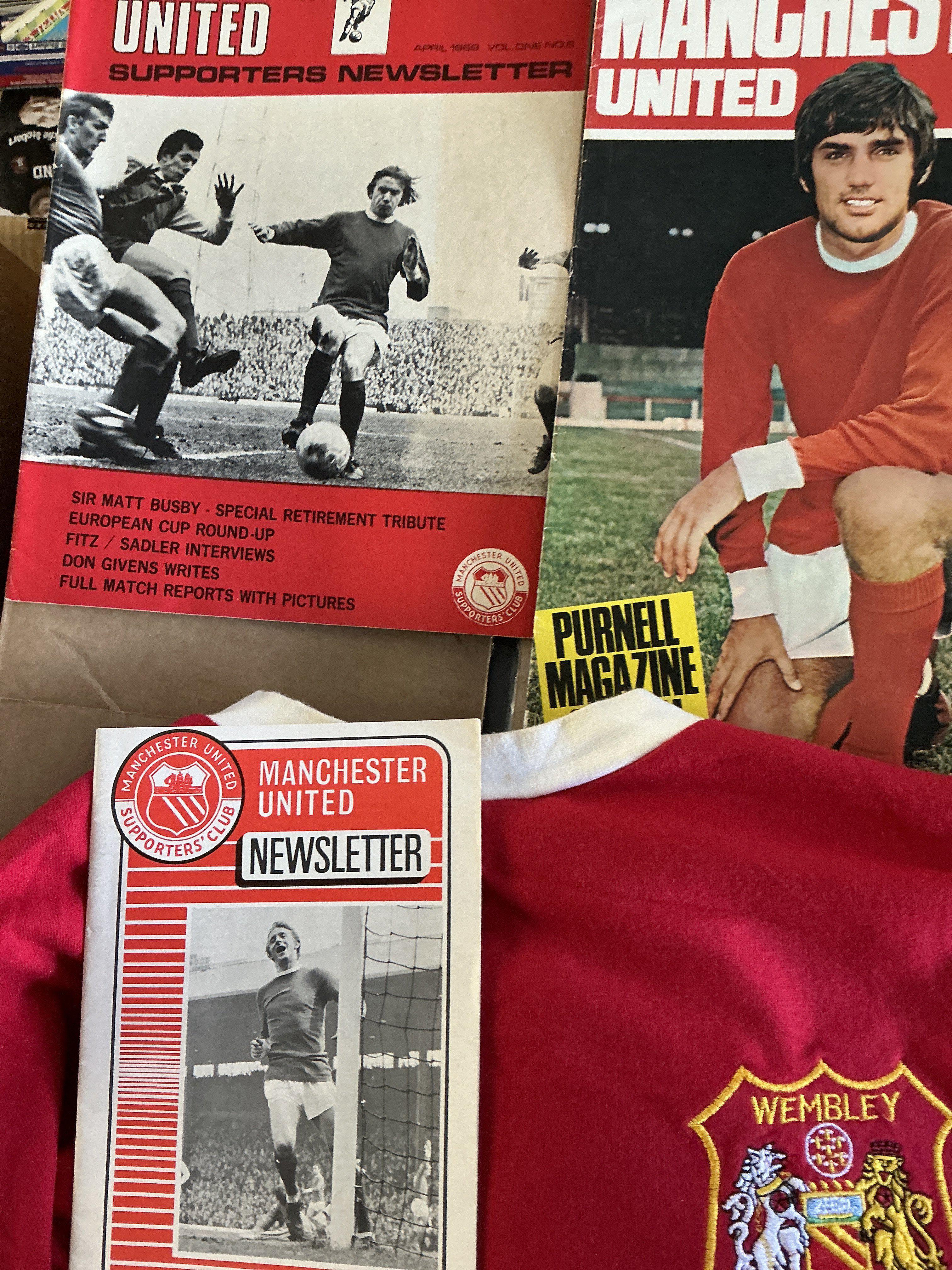 Manchester United 1960s Football Programmes + Memorabilia: 150 Home and away spanning the 60s era. C/W 1963 cup final replica shirt, 1970 Purcell pull out poster and a supporters newsletters.