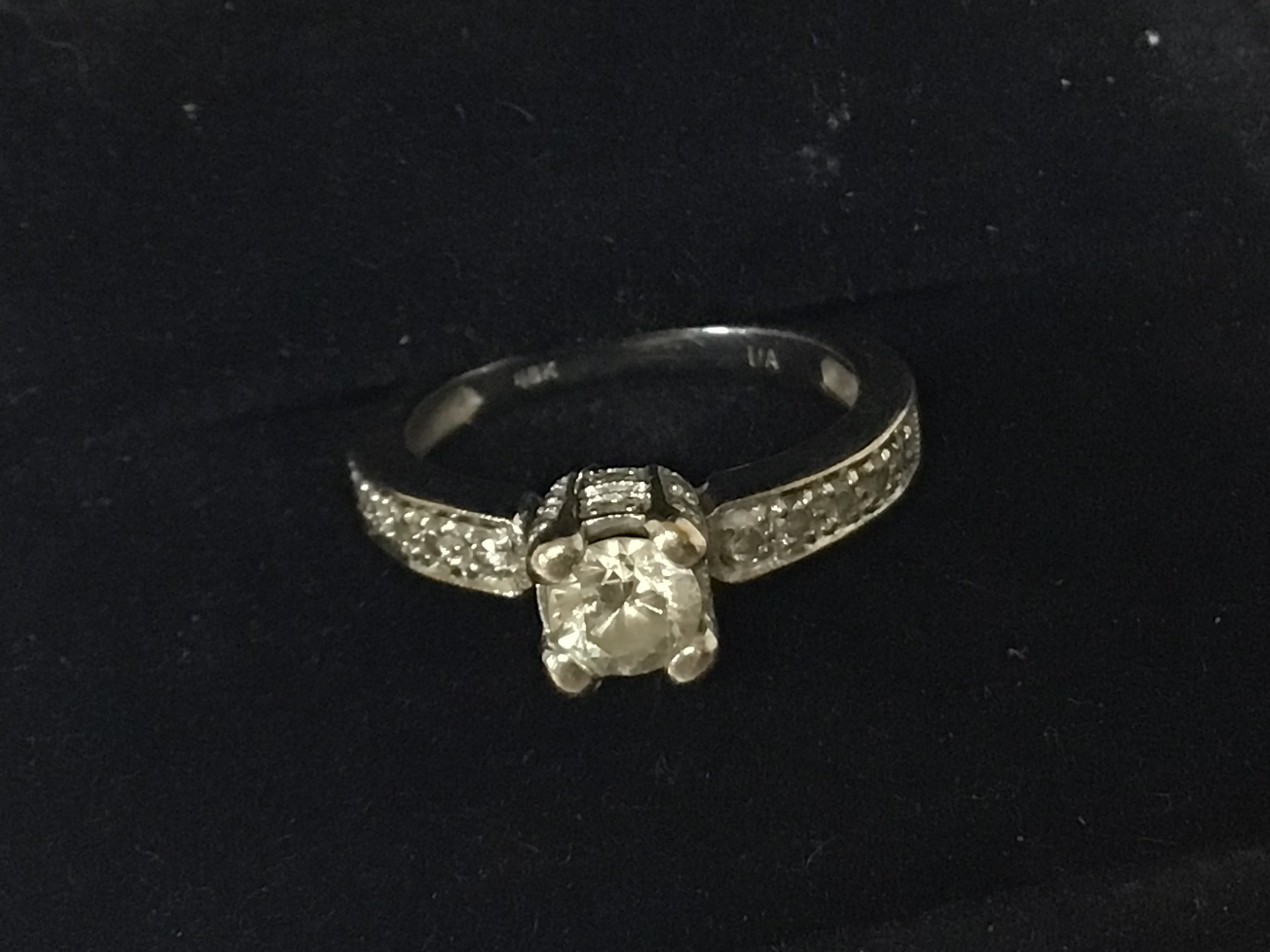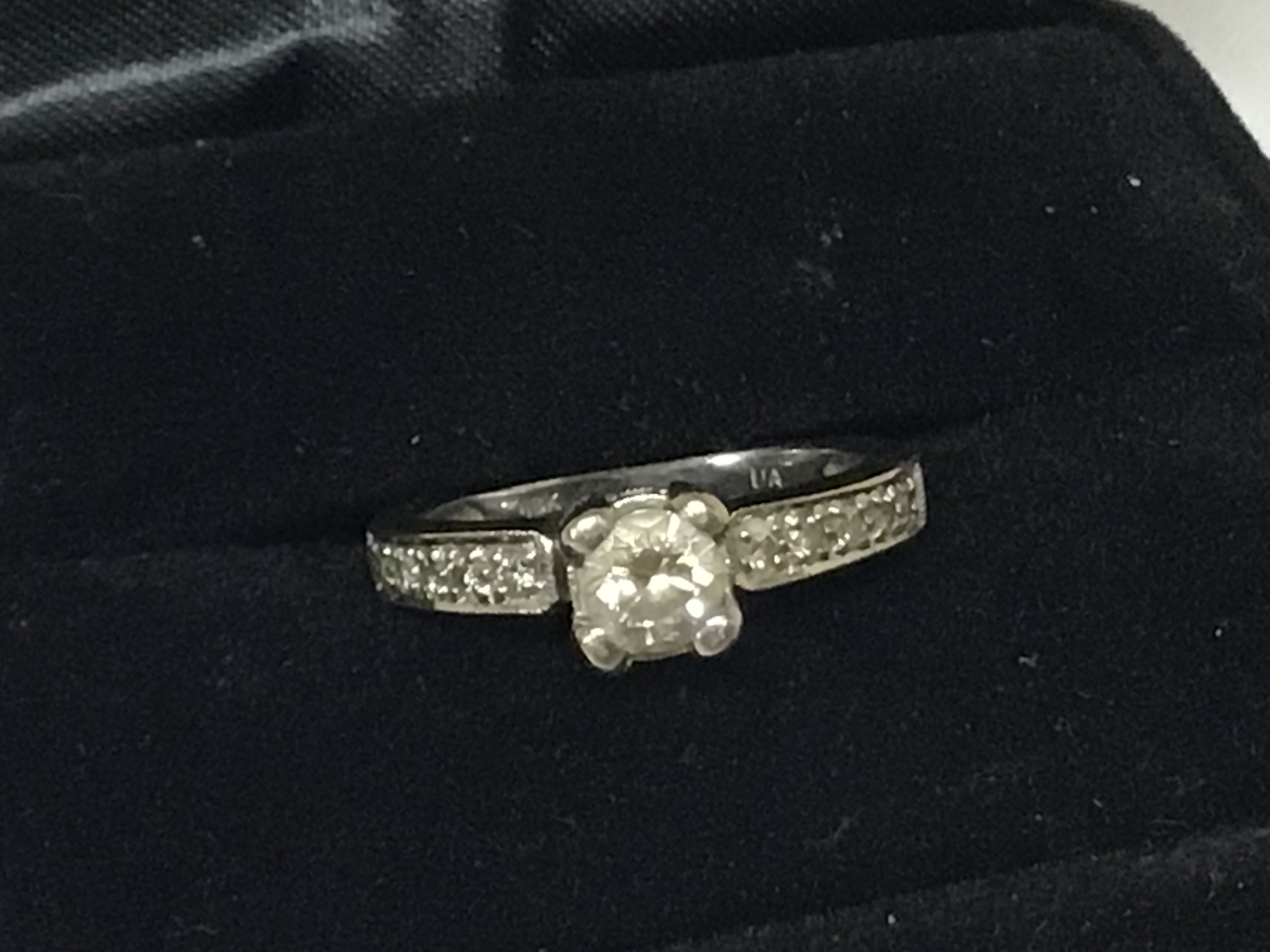 withdrawn - An 18carat white gold ladies ring set with a central brilliant cut diamond. Approximately 0.44 of a carat I J colour and VS Clarity as stated on purchase receipt. Cost price $2700 US dollars The central stone the central brilliant cut diamond flanked by ten further diamonds set in the ring. Ring size K weight 4.4g
