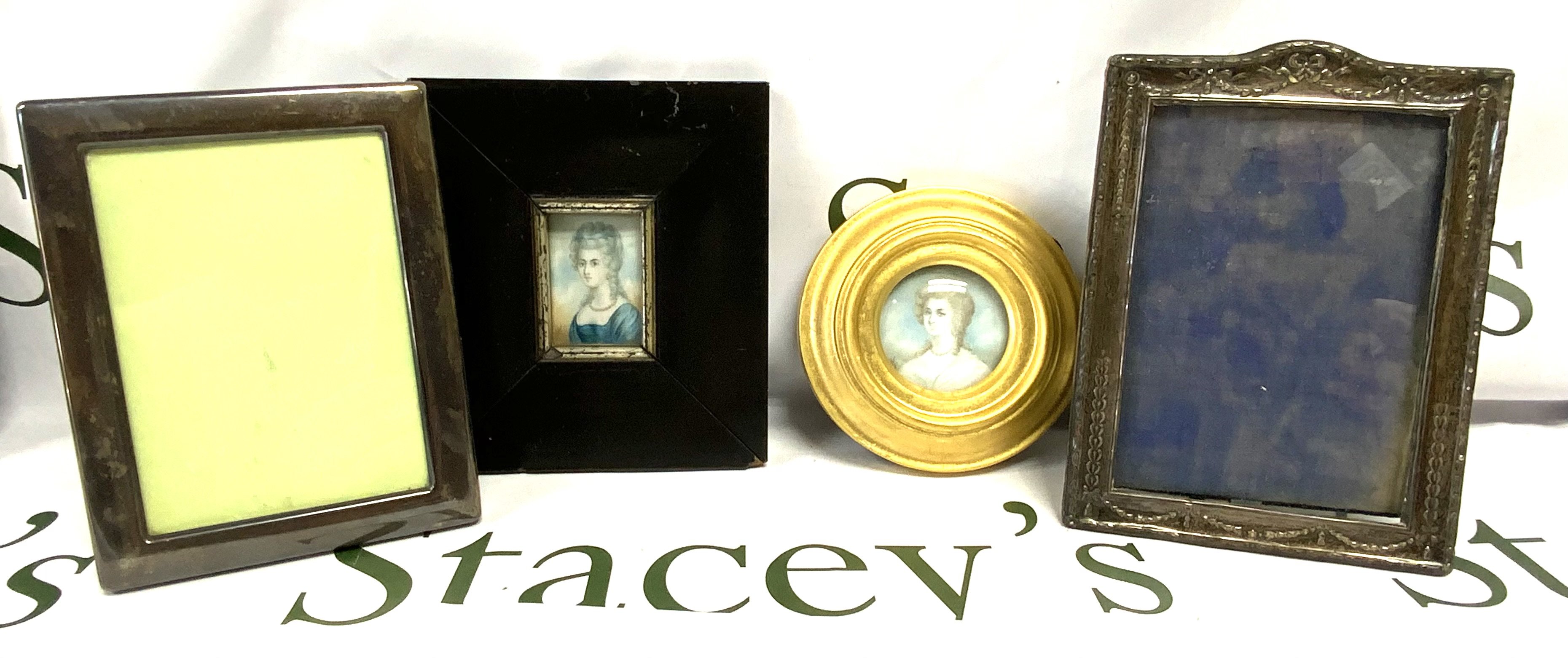 2 hallmarked silver photo frames together with 2 framed miniature portraits.