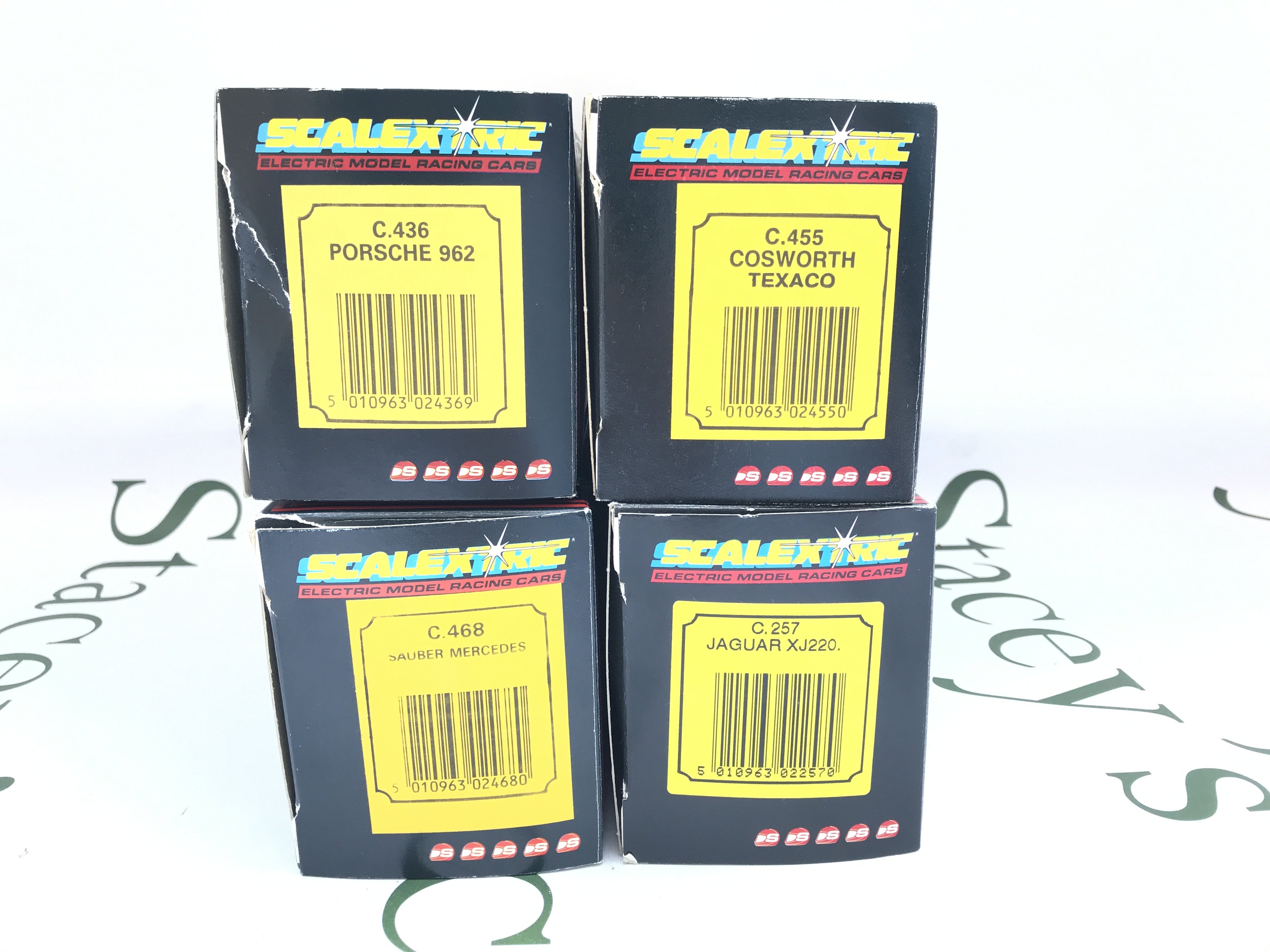 4 X Boxed Scalextric Cars Including A Porsche 962 #C.436.(re Painted) A Sauber Mercedes #C.468. A Cosworth Texaco #C.455 And A Jaguar XJ220 #C.257. No Reserve.