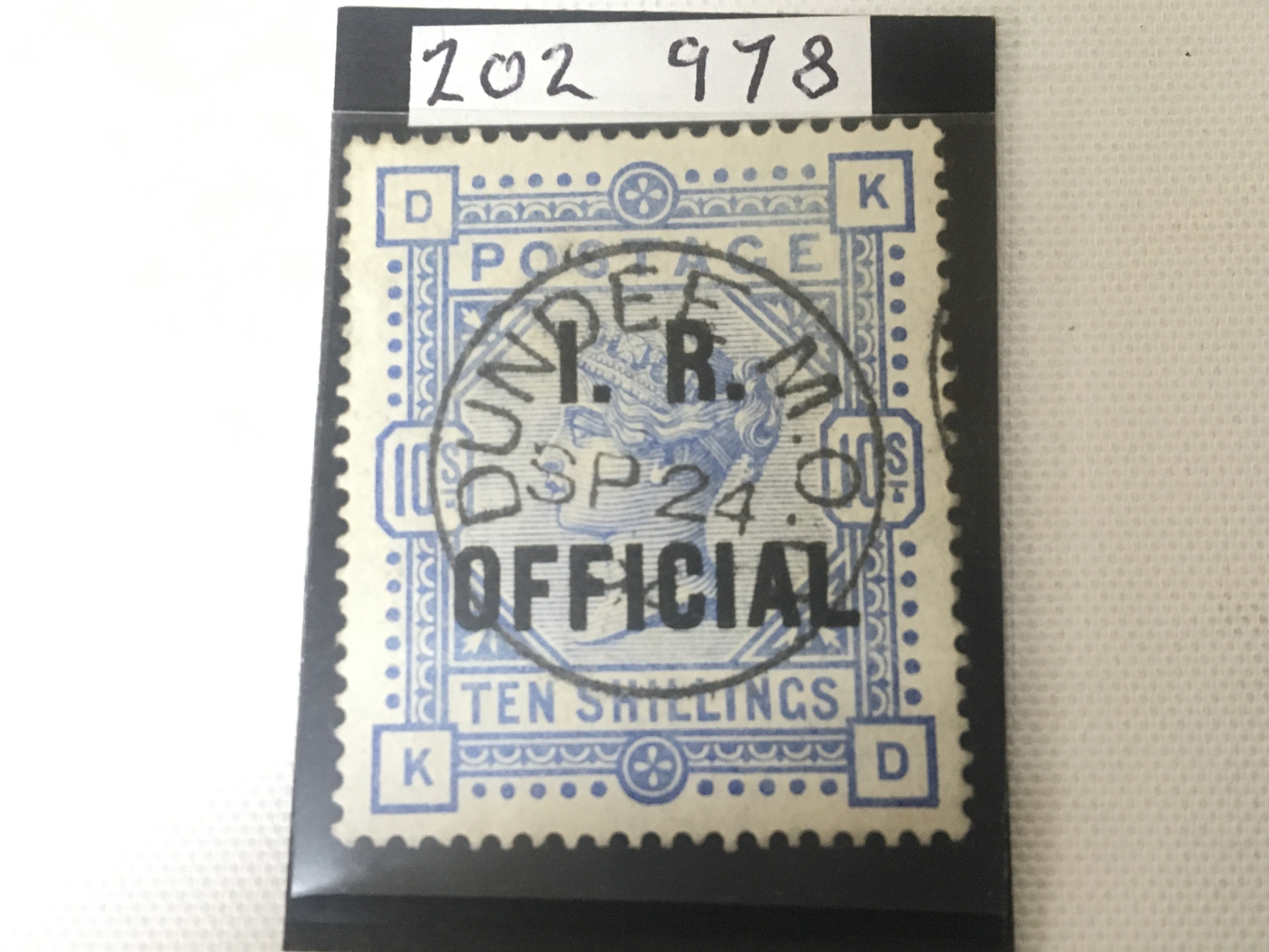 A rare Victorian Ten shilling stamp with I R official over stamp and also Dundee MO .